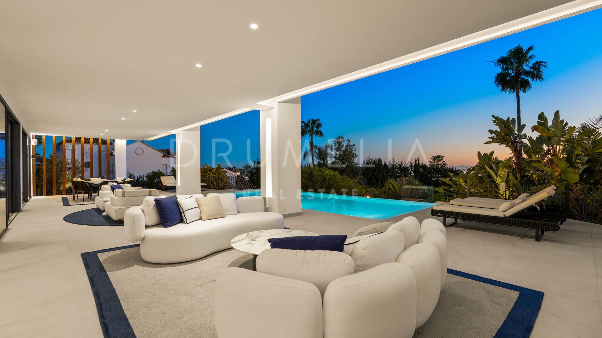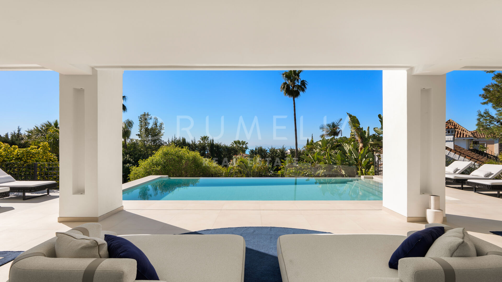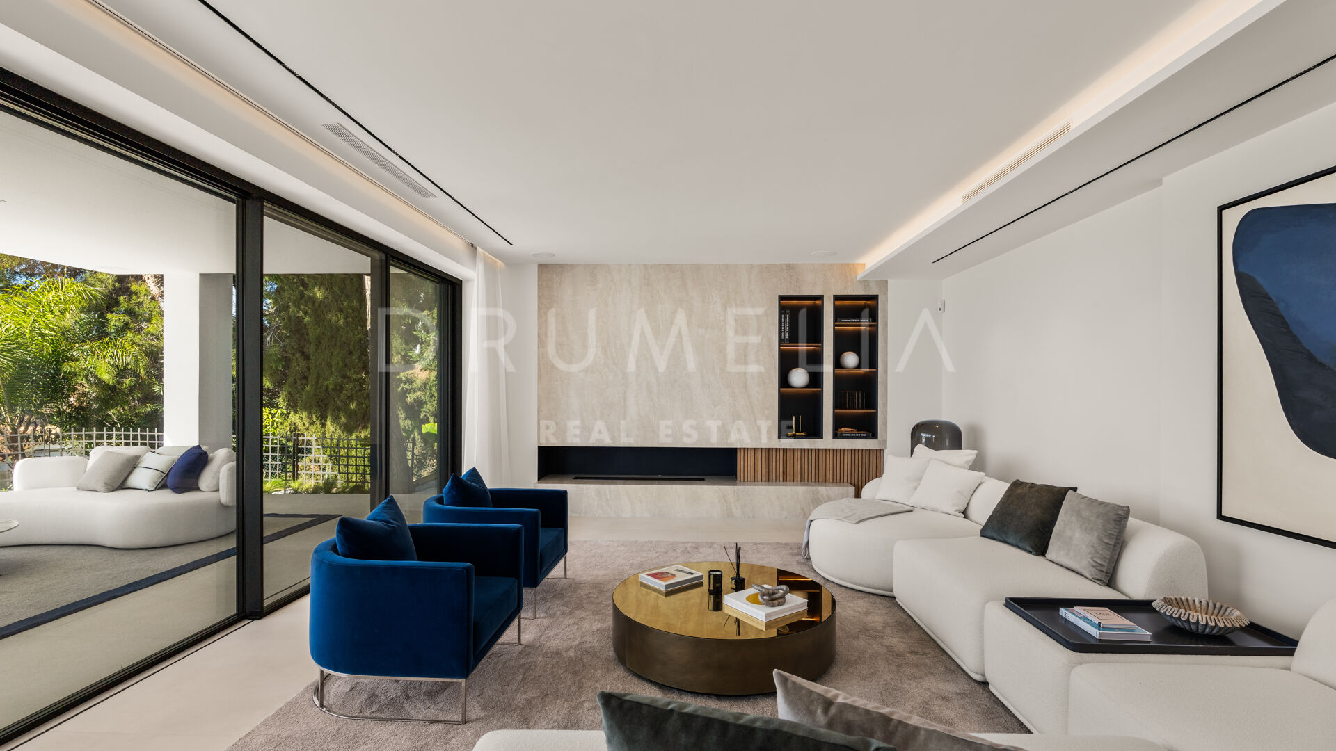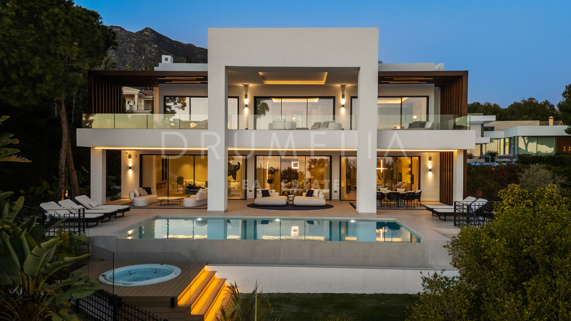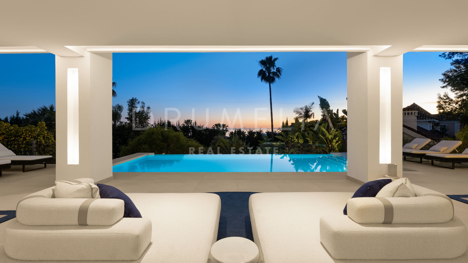 Die 2025 vollständig renovierte Immobilie besticht durch klare Linien, offene Räume und einen harmonischen Übergang zwischen Innen- und Außenbereichen. Der neue Eingang an der Rossini-Straße empfängt Besucher mit üppigen Gärten und einem dekorativen Wasserfall, während der ursprüngliche Zugang an der Sibelius-Straße ideal für Personal oder Gäste bleibt.