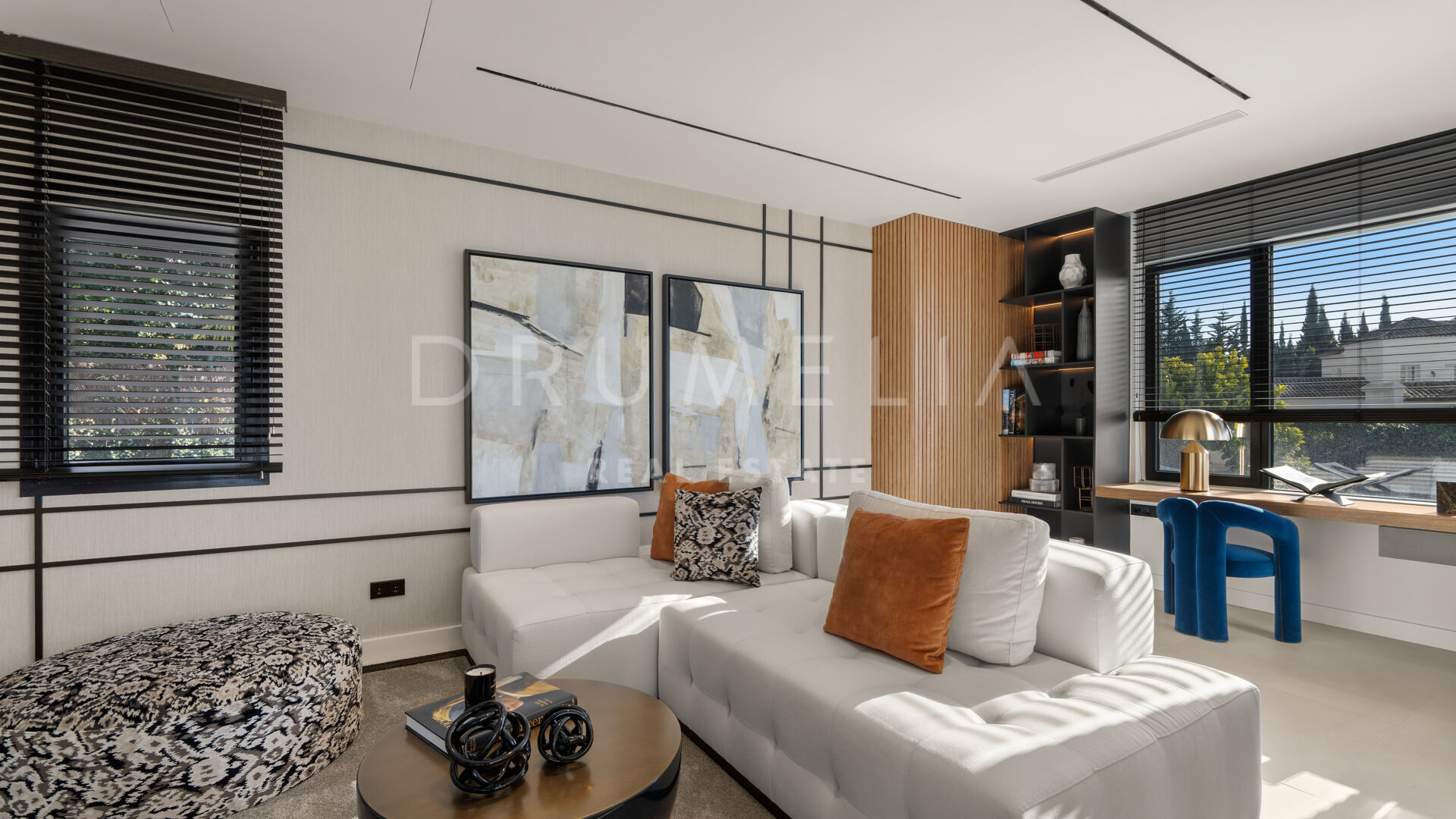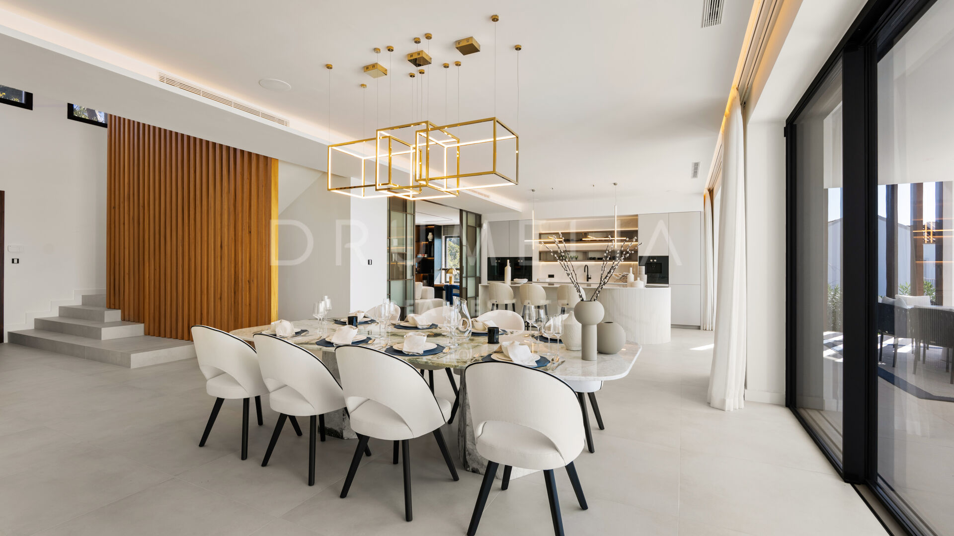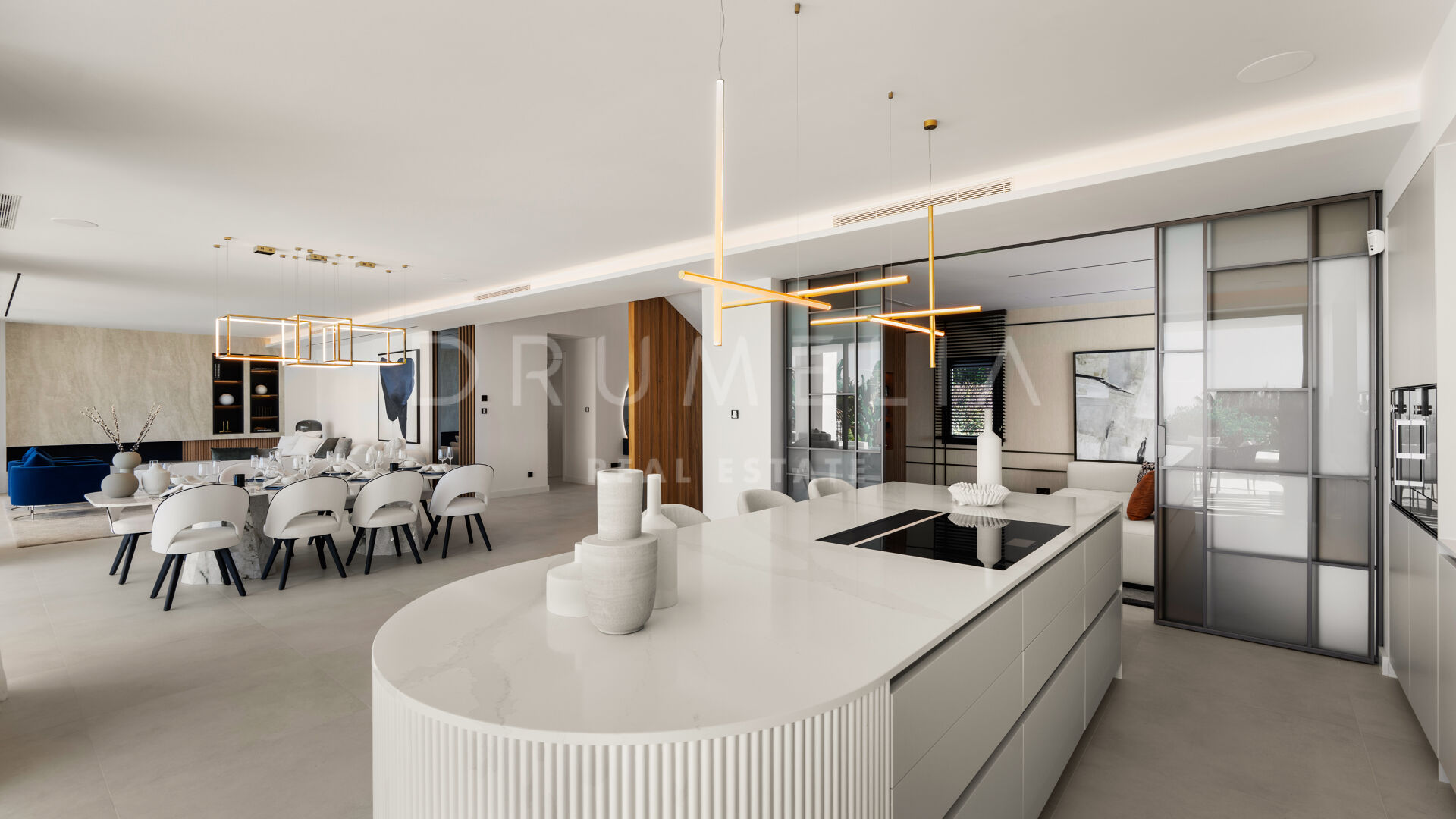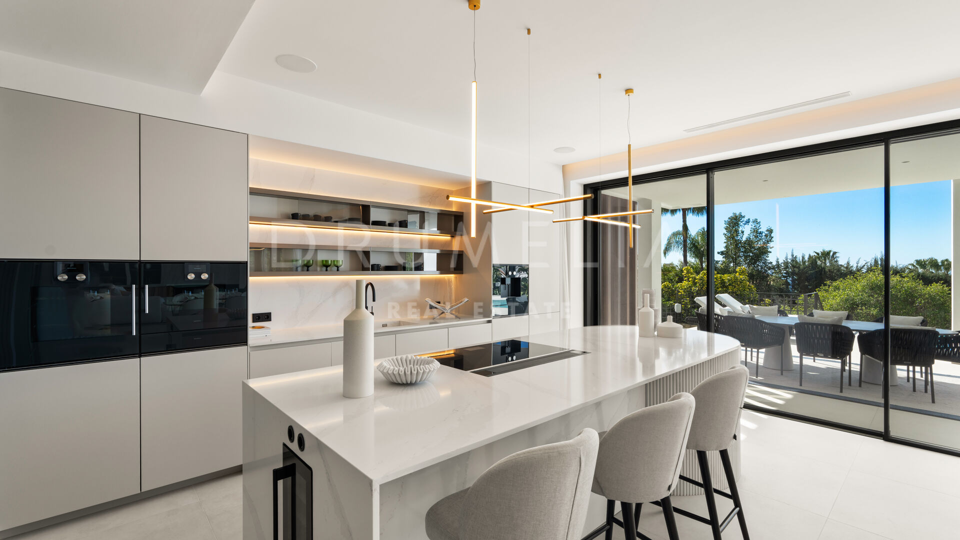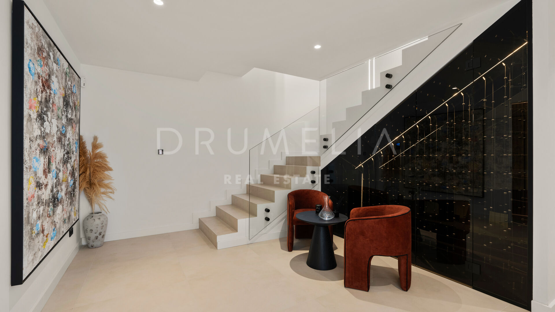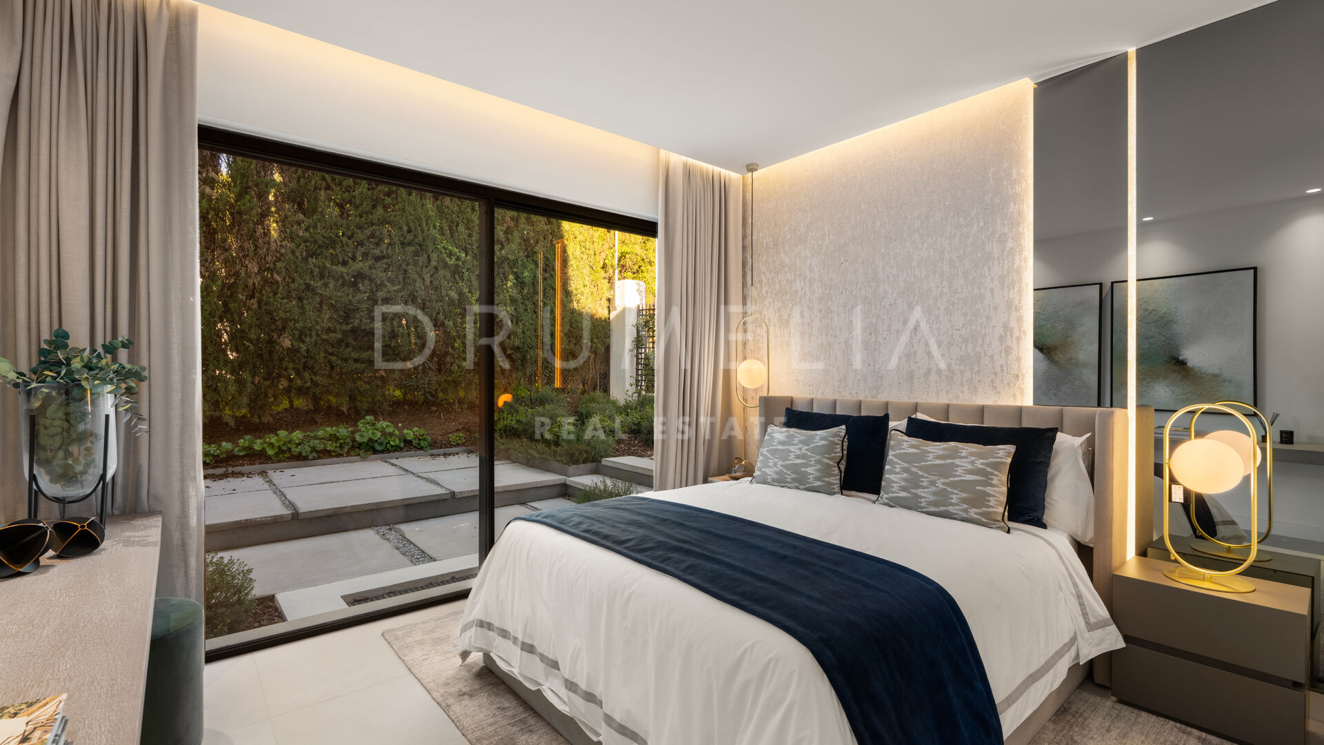 Die 2025 vollständig renovierte Immobilie besticht durch klare Linien, offene Räume und einen harmonischen Übergang zwischen Innen- und Außenbereichen. Der neue Eingang an der Rossini-Straße empfängt Besucher mit üppigen Gärten und einem dekorativen Wasserfall, während der ursprüngliche Zugang an der Sibelius-Straße ideal für Personal oder Gäste bleibt.