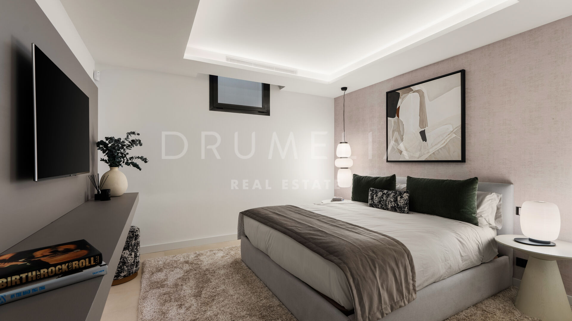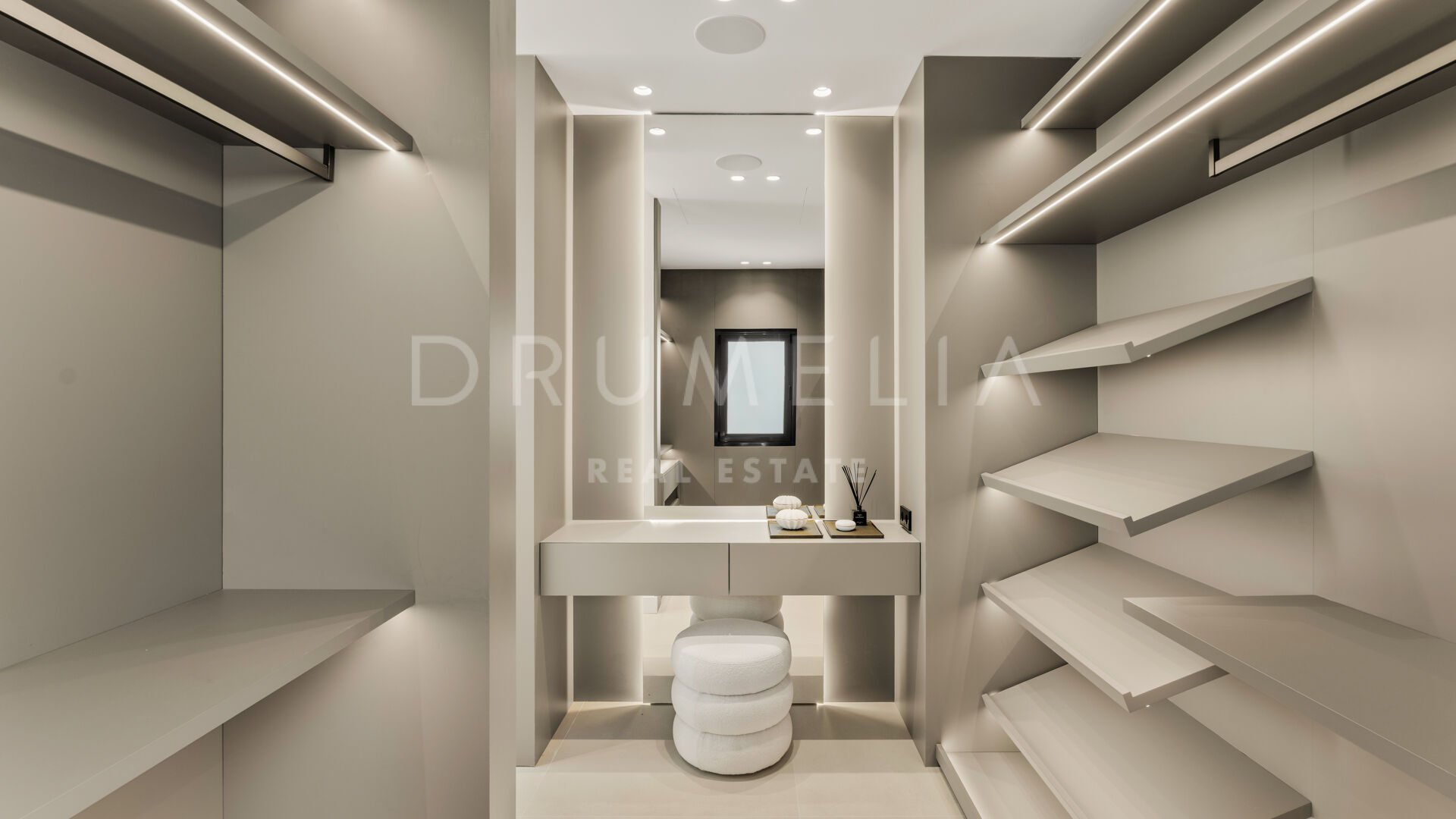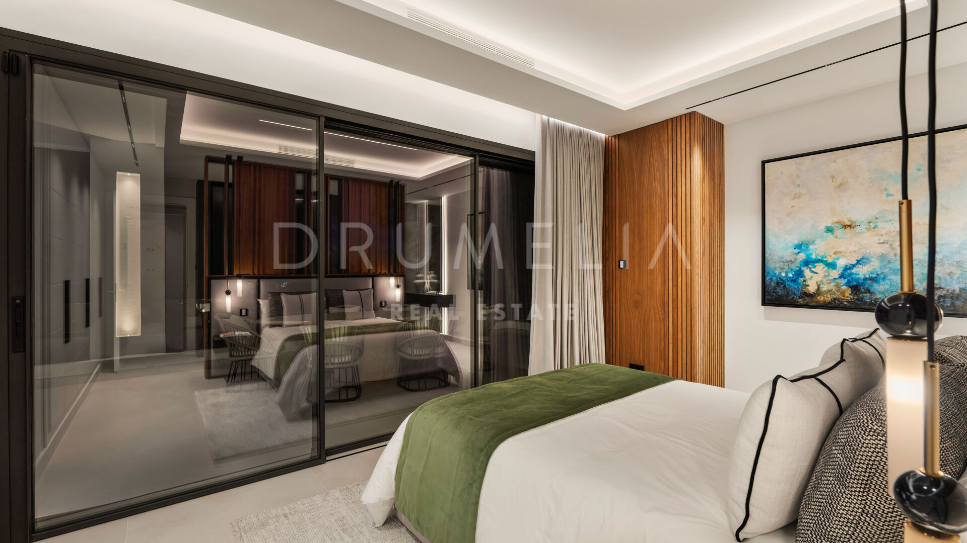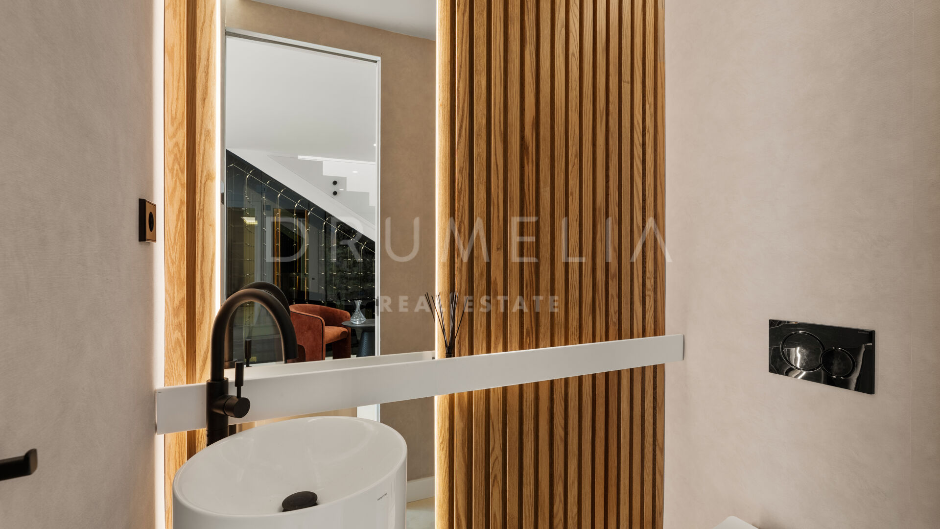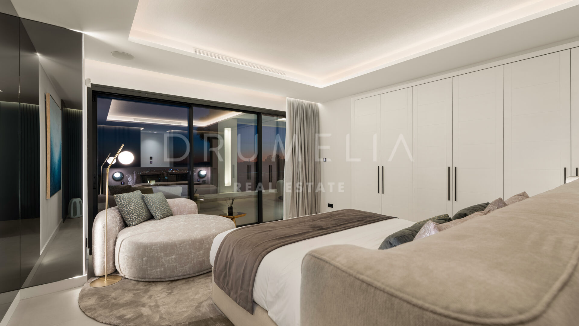 Die 2025 vollständig renovierte Immobilie besticht durch klare Linien, offene Räume und einen harmonischen Übergang zwischen Innen- und Außenbereichen. Der neue Eingang an der Rossini-Straße empfängt Besucher mit üppigen Gärten und einem dekorativen Wasserfall, während der ursprüngliche Zugang an der Sibelius-Straße ideal für Personal oder Gäste bleibt.