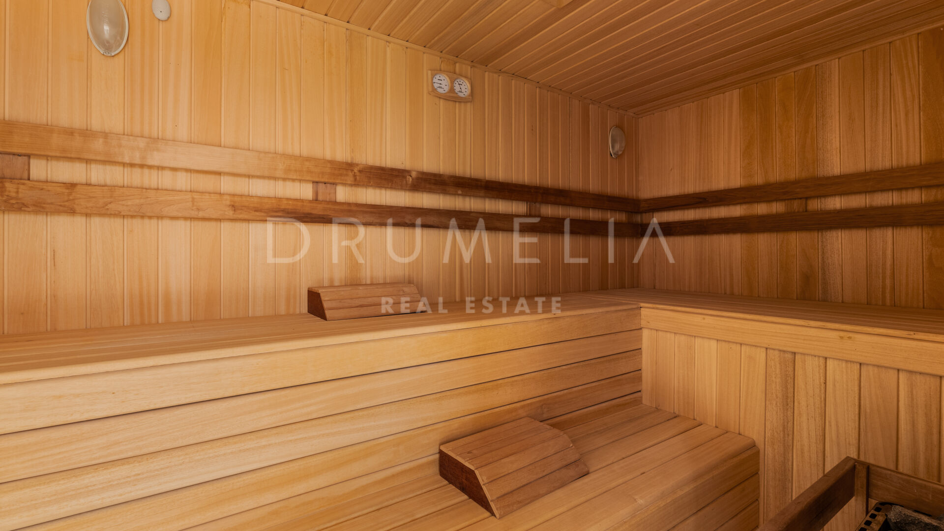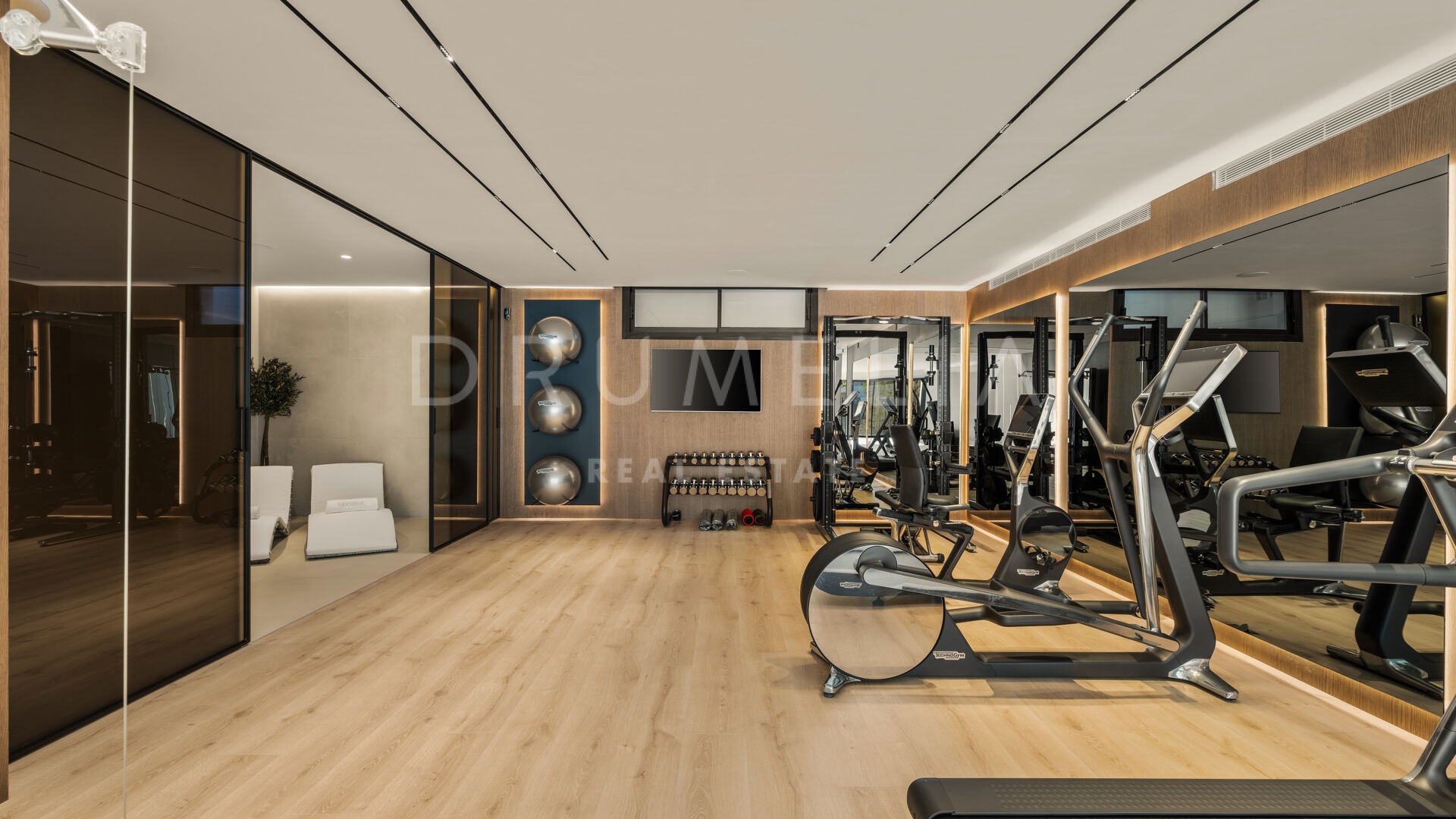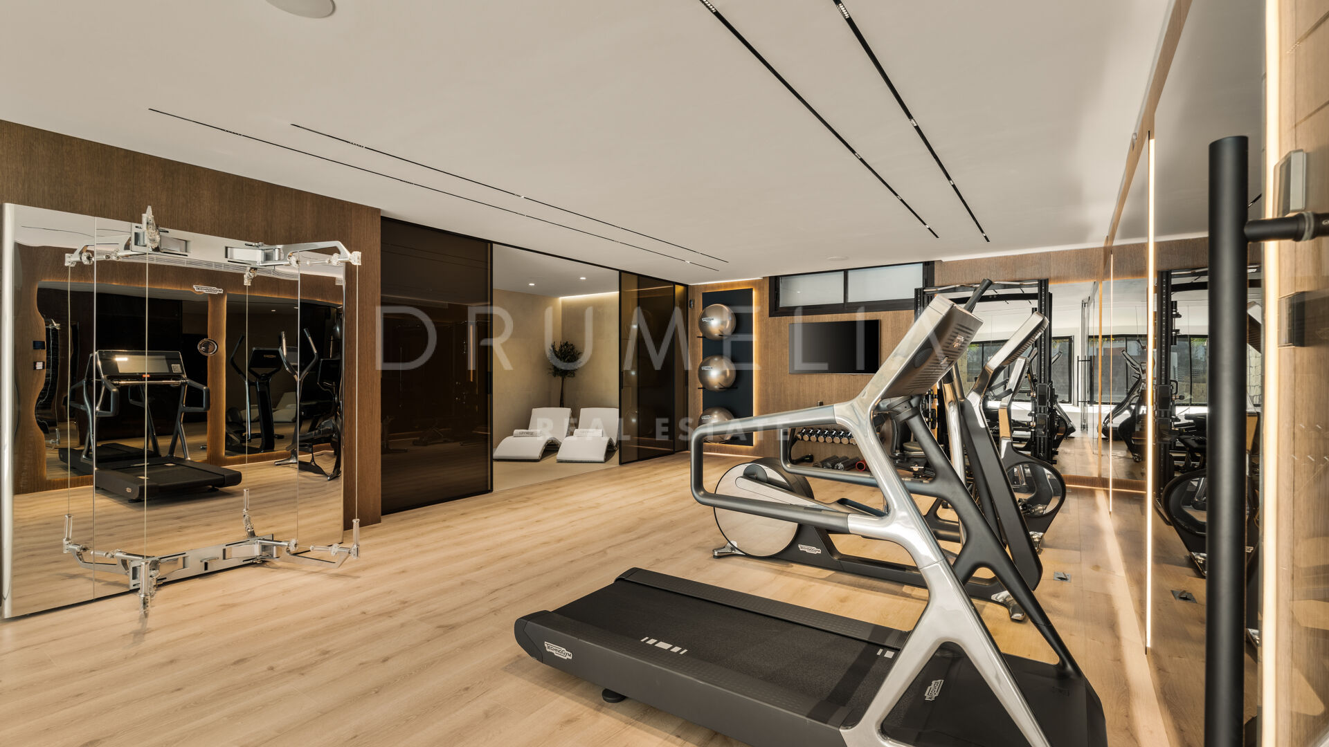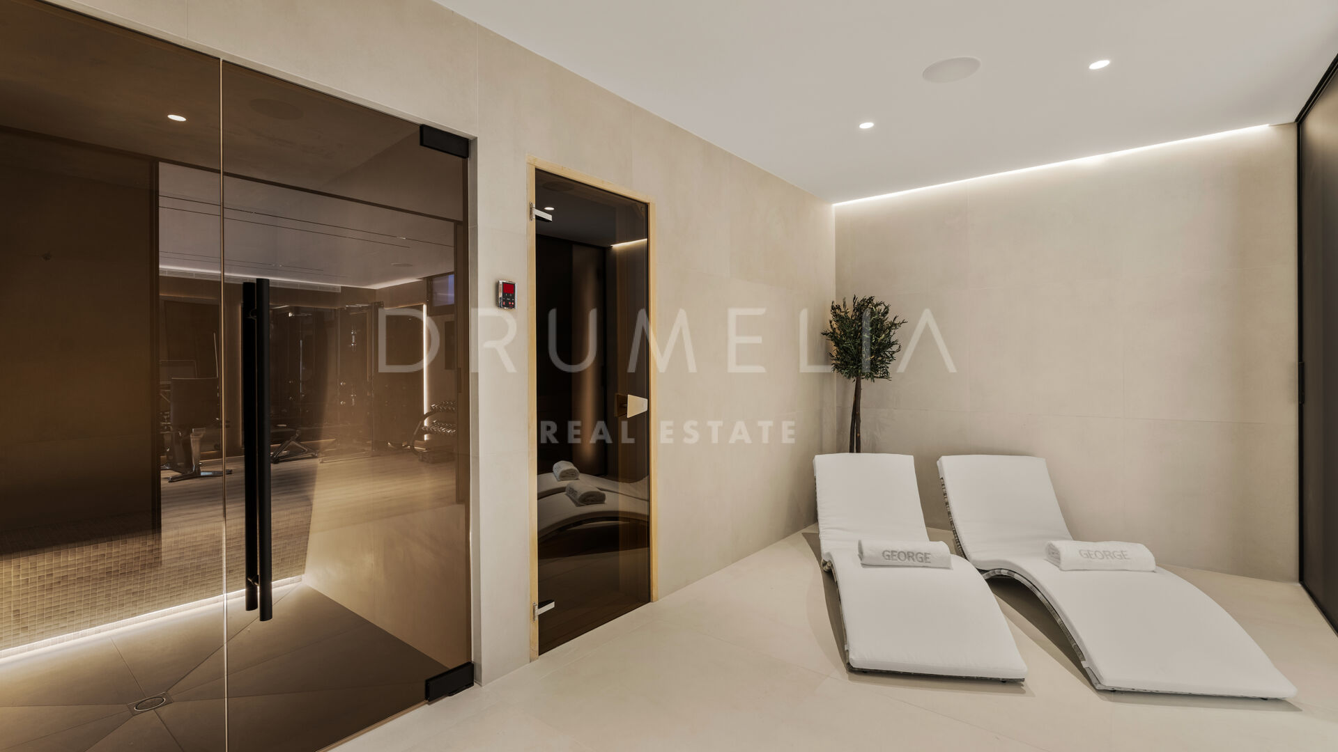 Das Untergeschoss ist dem Wohlbefinden gewidmet und bietet eine Sauna, ein Dampfbad, einen Fitnessraum, einen Weinkeller und ein weiteres Gästezimmer. Eine helle Garage mit Glastor sorgt für ein modernes Ambiente. Im Außenbereich schaffen Pool, Whirlpool und überdachte Terrasse den idealen Rahmen für das mediterrane Leben.