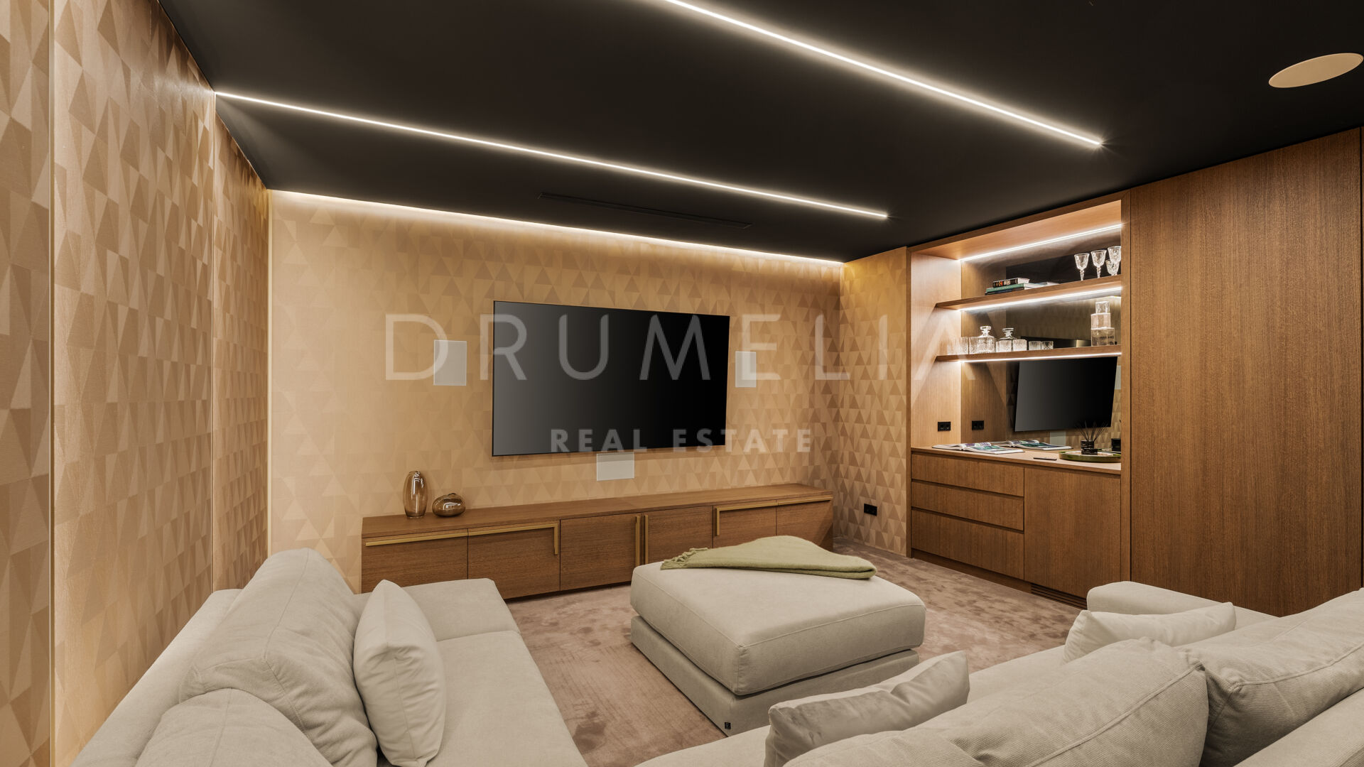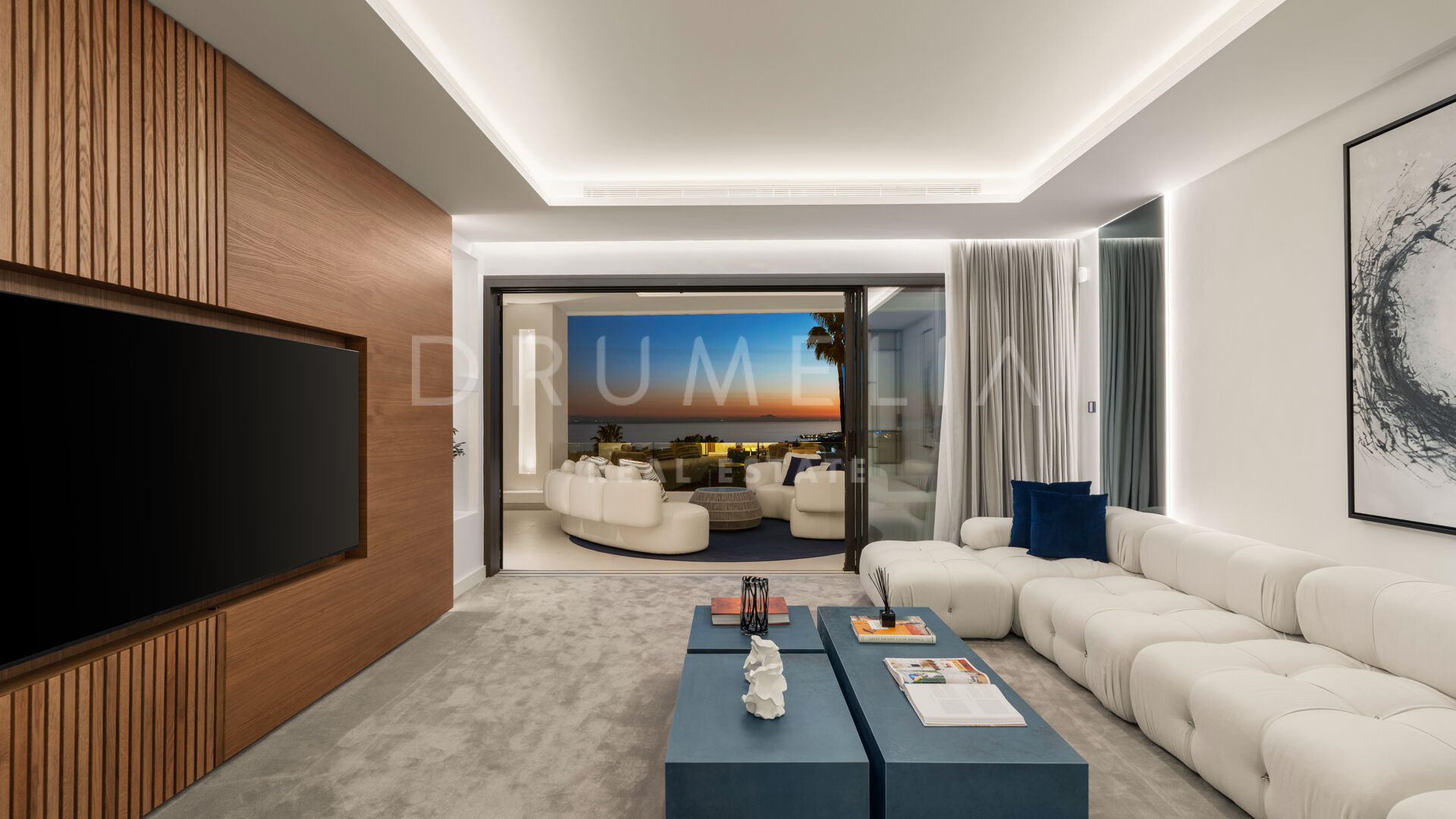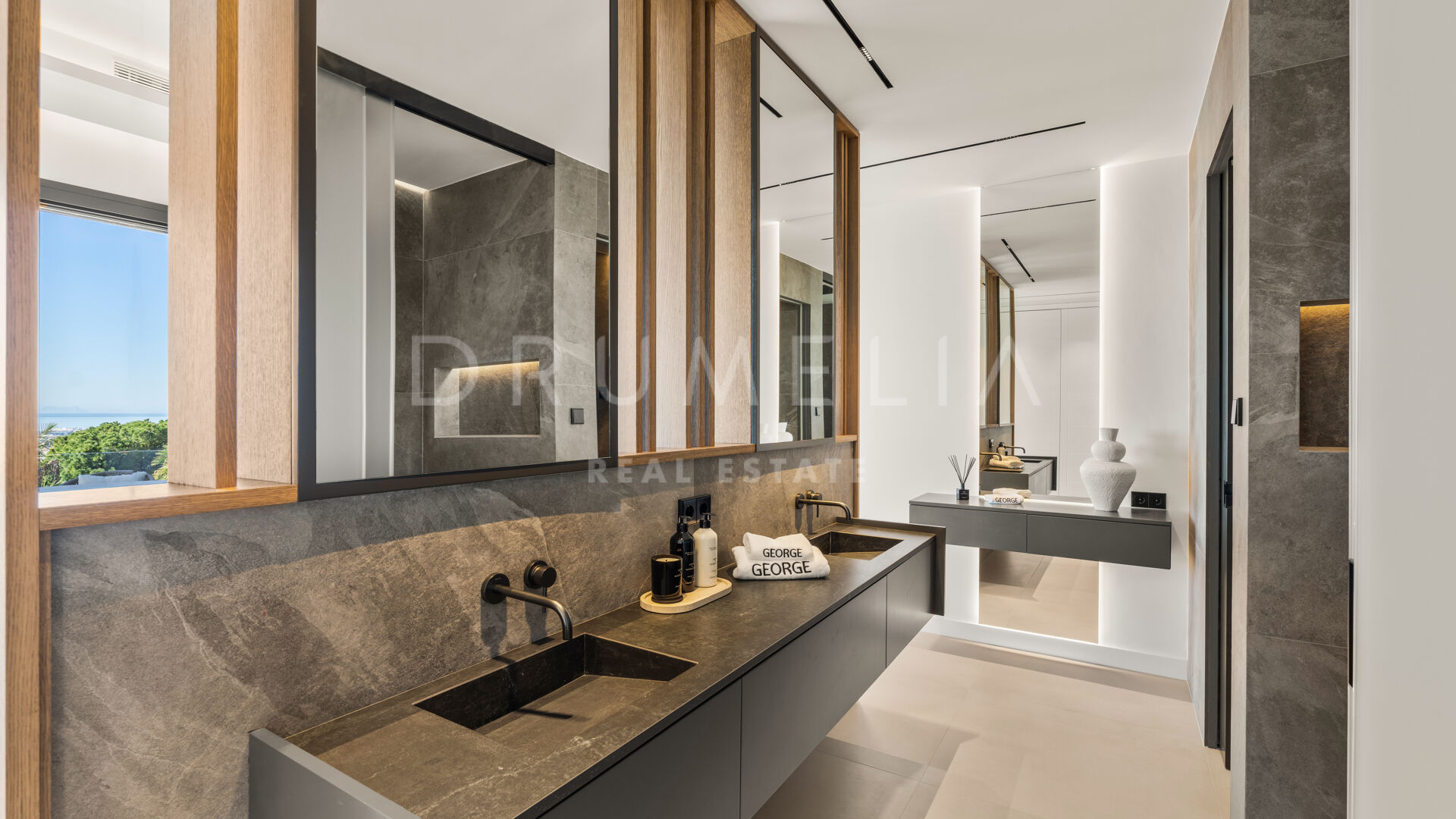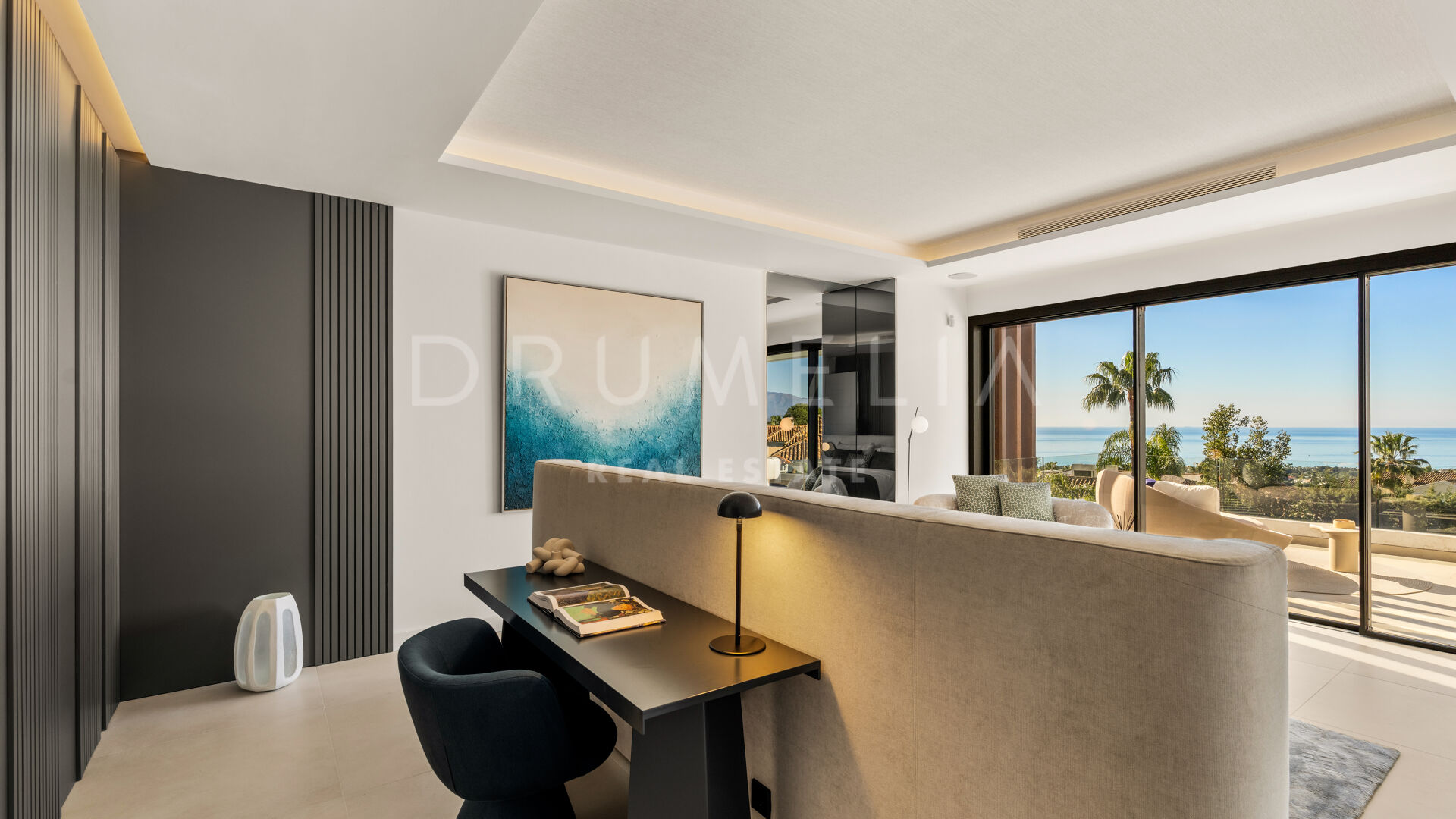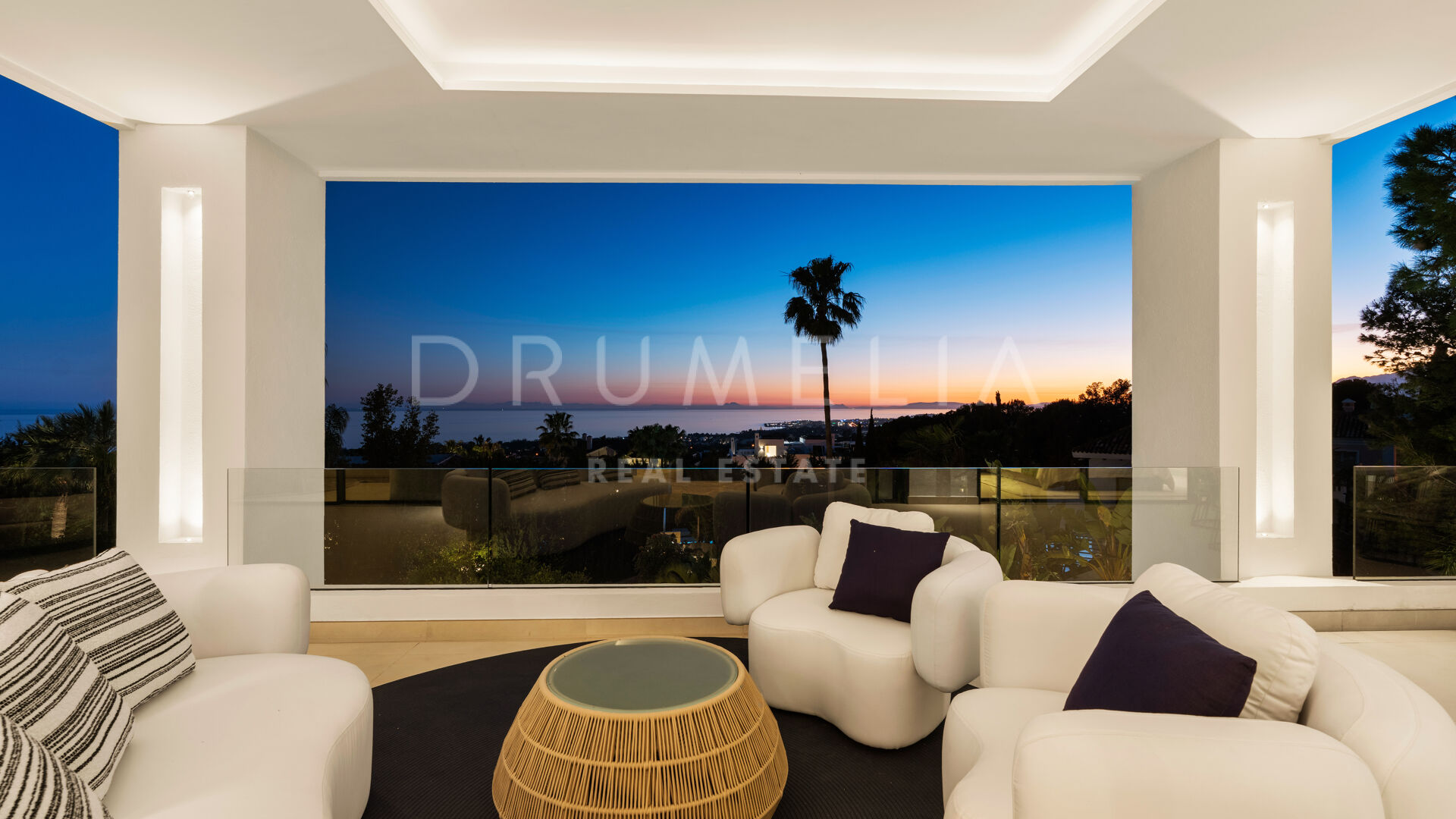 Auf drei Ebenen verteilt, bietet die Villa höchsten Komfort und elegantes Wohnen. Das Hauptgeschoss verfügt über eine hohe Eingangshalle, einen offenen Wohn- und Essbereich mit moderner Küche sowie ein Gästezimmer. Im Obergeschoss teilen sich drei Schlafzimmer eine spektakuläre Terrasse mit Panoramablick auf das Meer, Gibraltar und die afrikanische Küste. Die Mastersuite verbindet Wärme mit luxuriöser Raffinesse und verfügt über ein eigenes Badezimmer.