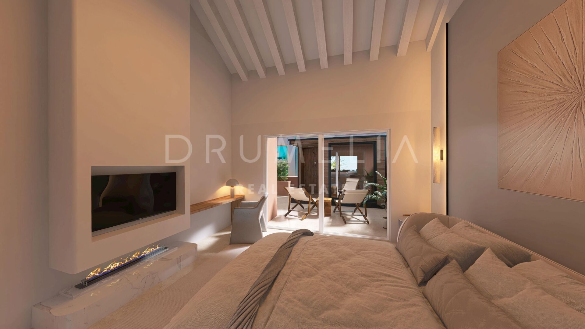 Die Liebe zum Detail zeigt sich überall – vom Bang & Olufsen Soundsystem über den elektrischen Kamin bis hin zu den exklusiven Kettal-Lounge-Bereichen im Freien. Das Highlight ist die großzügige Dachterrasse mit privatem Jacuzzi und Sauna, die Ihr persönliches Wellnessrefugium mit atemberaubender Aussicht schafft.