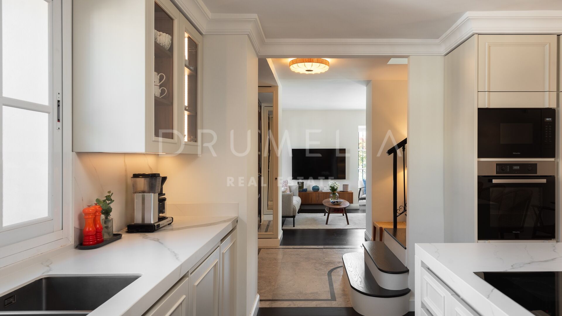 Le rez-de-chaussée s’articule autour d’un salon principal dont les baies vitrées pleine hauteur s’ouvrent directement sur la terrasse de la piscine et le jardin. Deux vérandas couvertes prolongent l’espace de vie de part et d’autre. La cuisine ouverte est entièrement équipée d’un ensemble d’appareils Miele — y compris une cave à vin — idéalement placée à proximité de la salle à manger et avec accès au jardin. Une pièce polyvalente séparée peut servir de bureau, bibliothèque ou quatrième chambre. Une buanderie et des toilettes invités complètent ce niveau.
