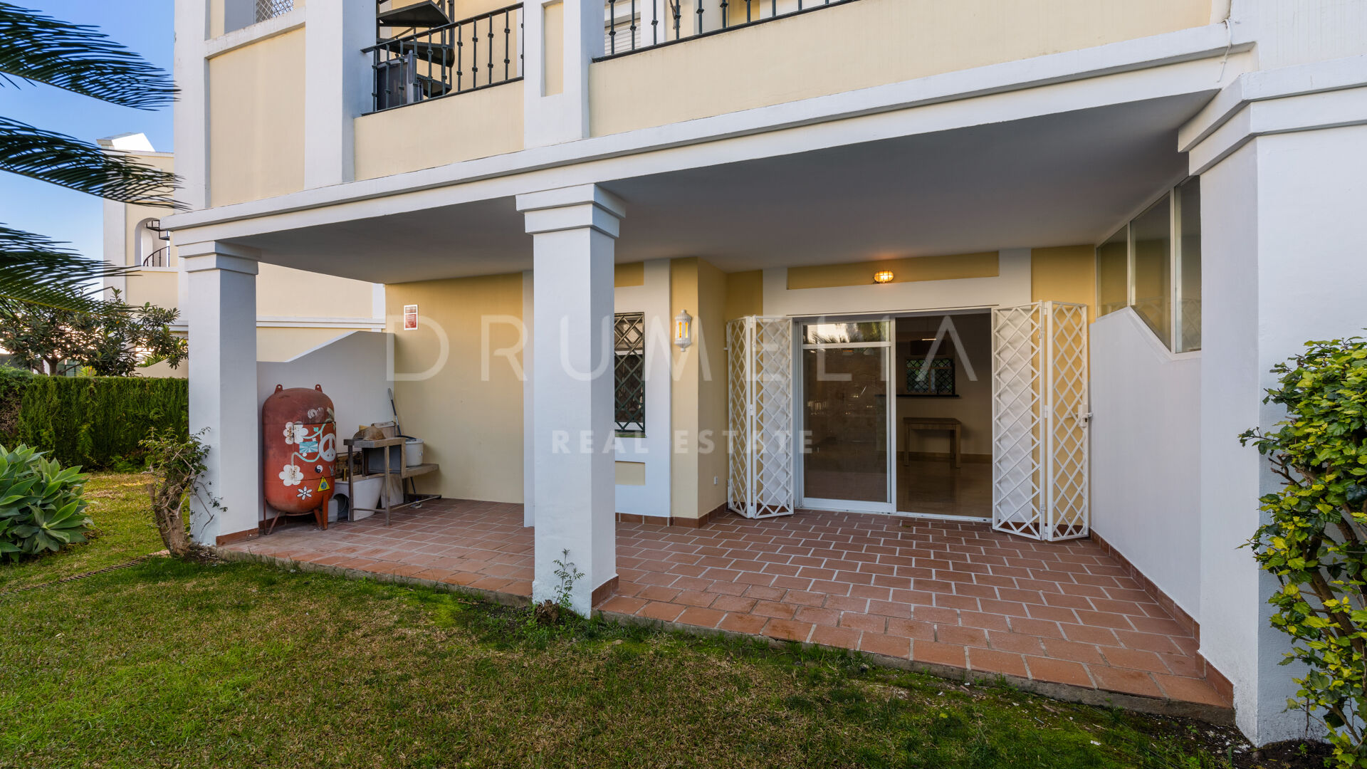 Эта зона идеально подходит для отдыха, приёма гостей или наслаждения средиземноморским климатом круглый год. Из окон открывается вид на сад, а сама квартира находится в тихом месте в охраняемом жилом комплексе.