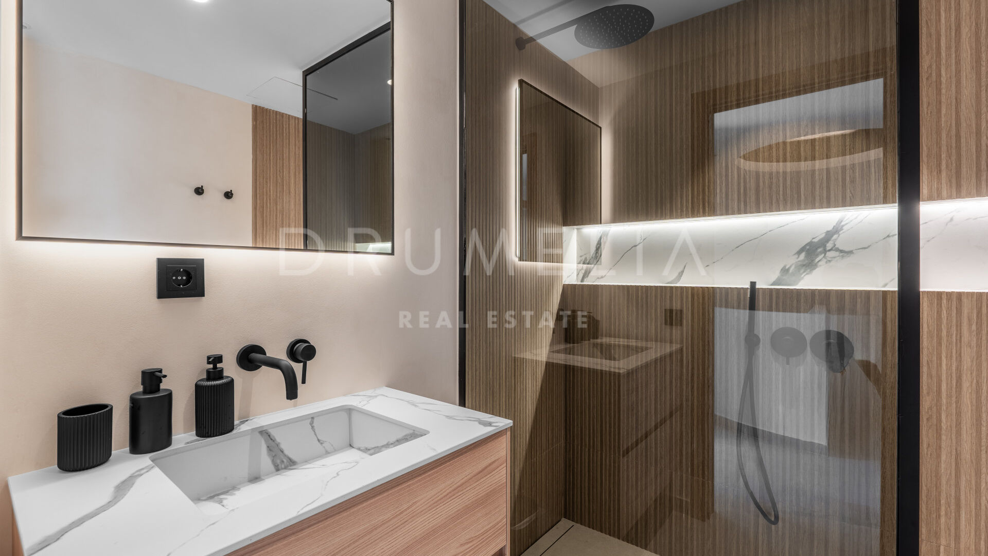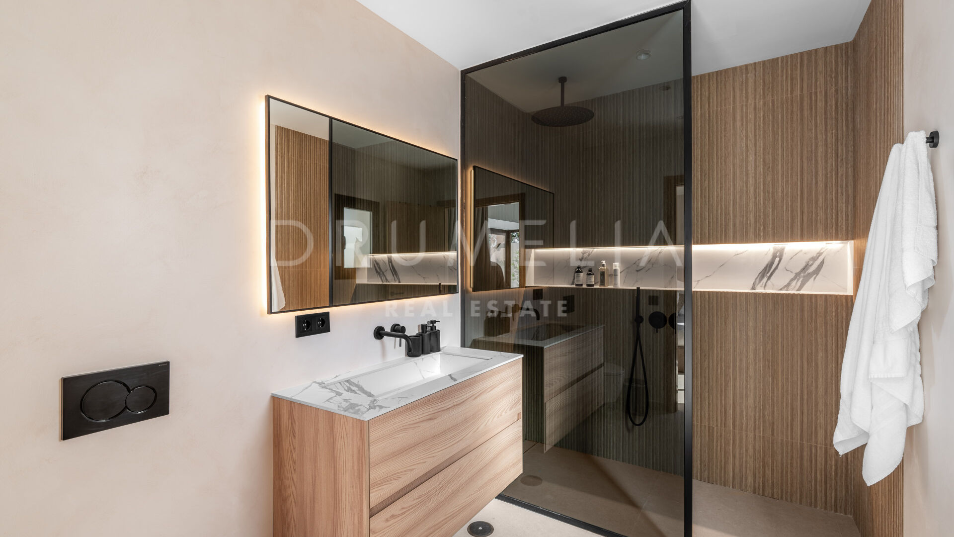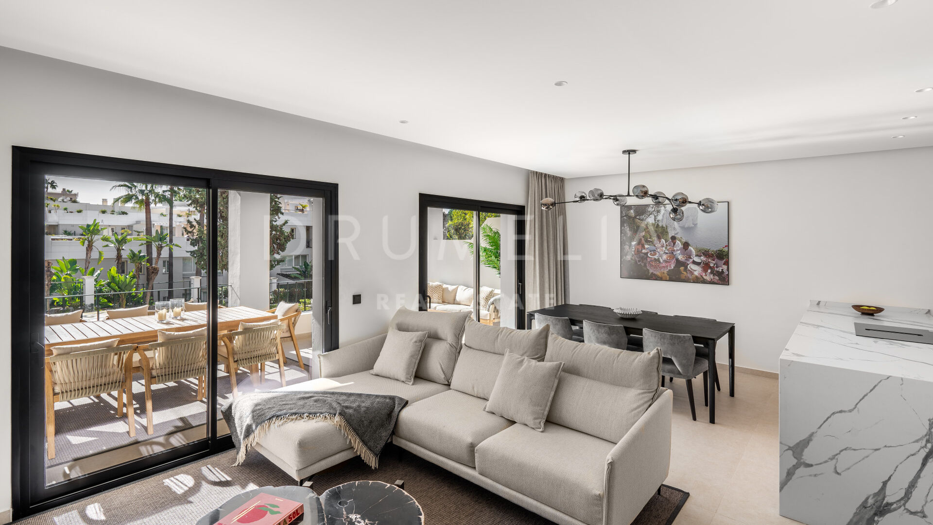 На двух стильных уровнях основной этаж предлагает открытую гостиную и столовую, которые плавно переходят на просторную террасу — идеальное место для обедов на свежем воздухе, отдыха или приёма гостей под средиземноморским солнцем. Современная кухня и гостевой санузел завершают этот этаж, сочетая функциональность и изящество.