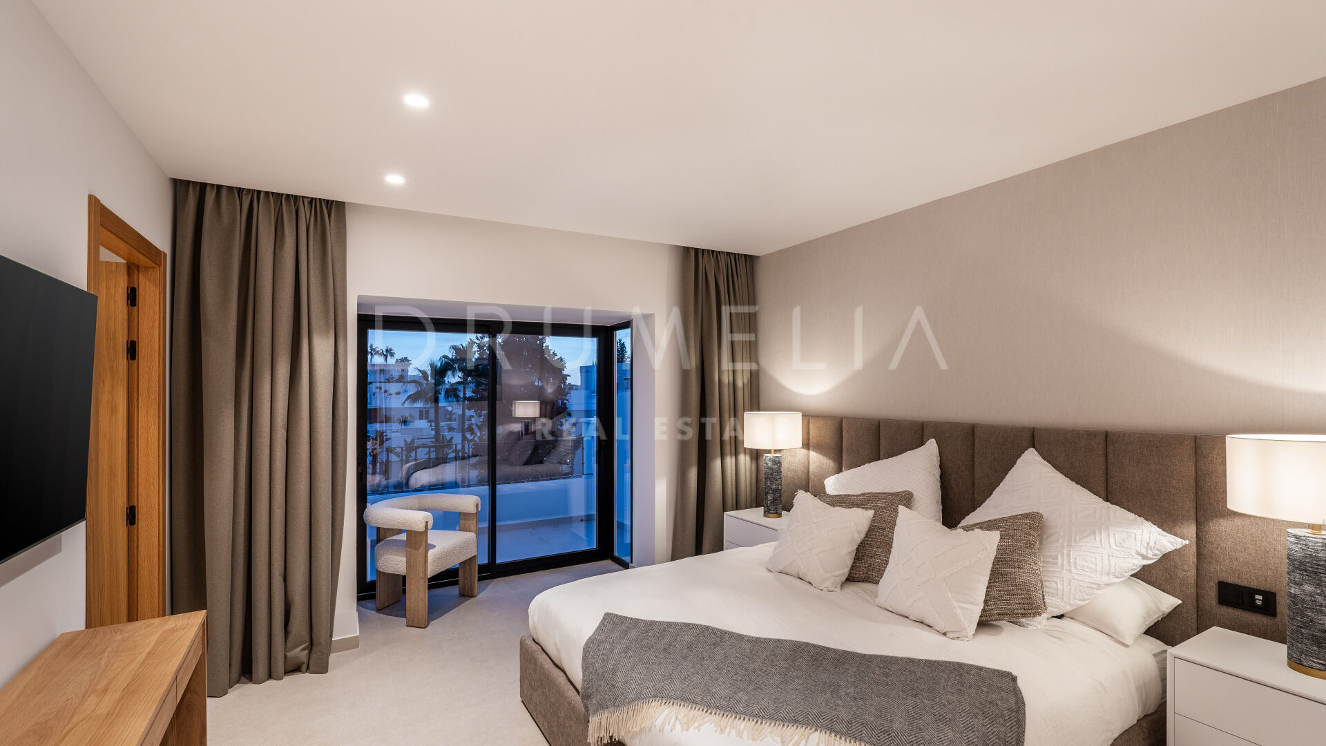 На верхнем уровне расположены три просторные спальни, продуманно оформленные для максимального комфорта и уединения. Главная спальня включает большую гардеробную, роскошную ванную комнату и прямой выход на частную террасу. Отсюда лестница ведёт на крышу с солярием — уединённое место для отдыха с панорамными видами и неограниченными возможностями для наслаждения свежим воздухом. Две дополнительные спальни разделяют прекрасно оборудованную ванную комнату, идеально подходящую для семьи или гостей.