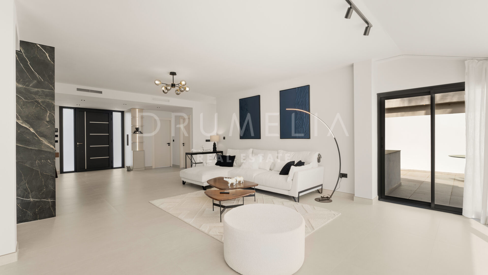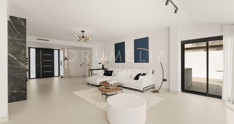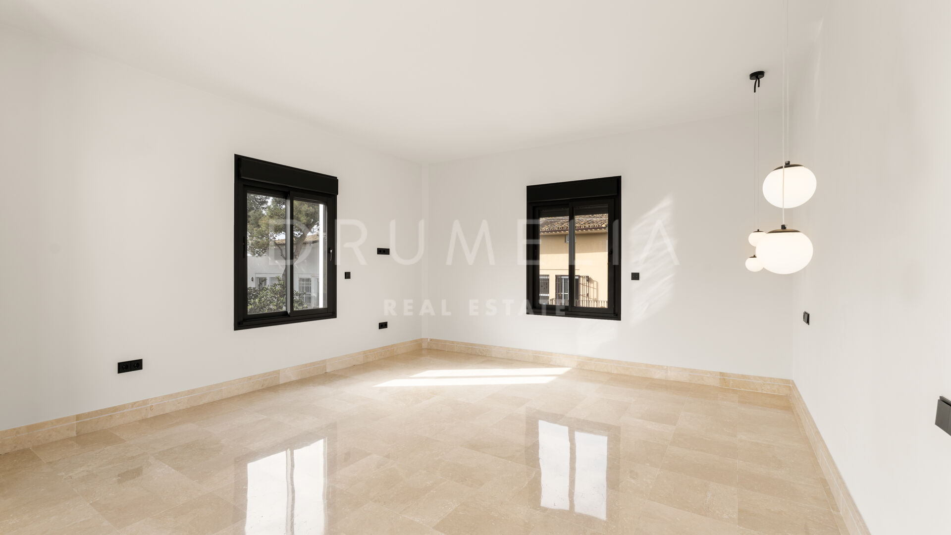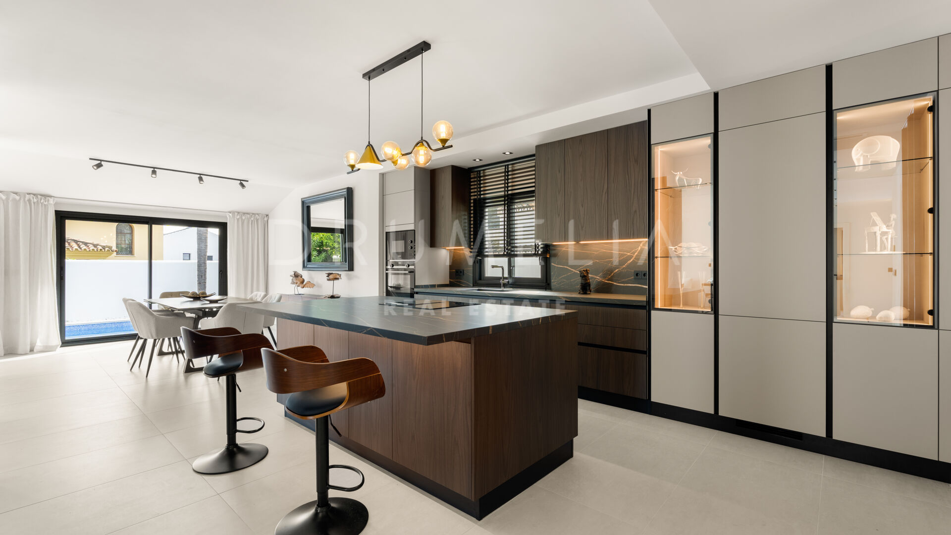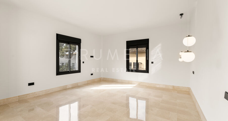 Укрытая в одном из наиболее устоявшихся и востребованных жилых кварталов Нуэва Андалусии, эта великолепно отреставрированная вилла представляет собой редкое сочетание классической андалузской архитектуры и безупречно точного современного дизайна. Построенная в 2001 году и полностью переосмысленная в 2025-м, недвижимость расположена на частном участке площадью 516 м² и предлагает 355 м² тщательно переконфигурированного жилого пространства на трёх этажах. Внешний облик немедленно задаёт тон — традиционный белёный фасад с черепицей из терракоты бережно сохранён, тогда как интерьеры были полностью демонтированы и воссозданы по совершенно иному стандарту. Это не косметическое обновление; это полное переосмысление, которое фотографии передают с абсолютной убедительностью.