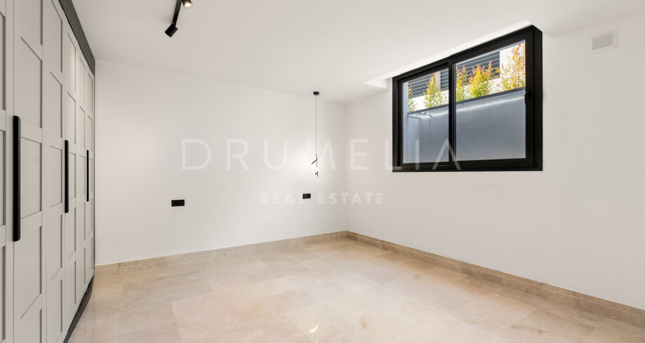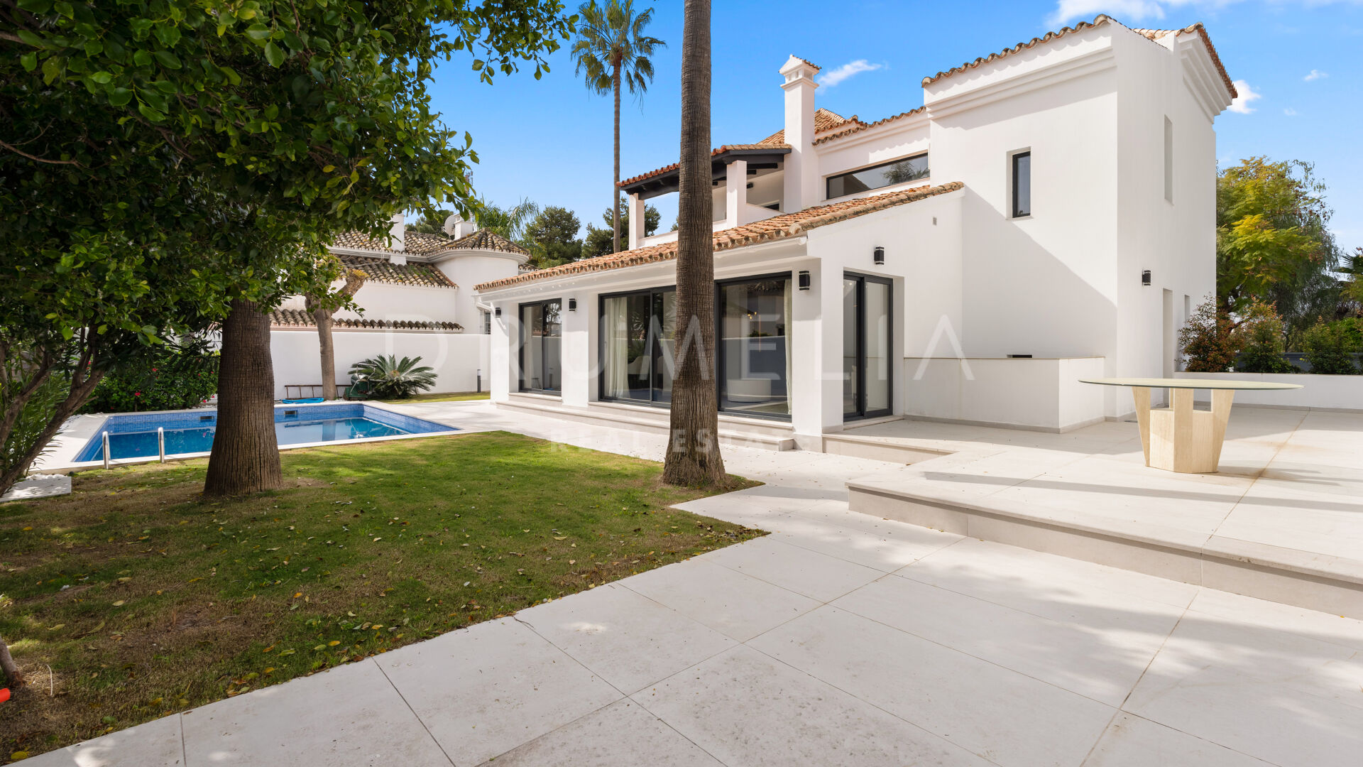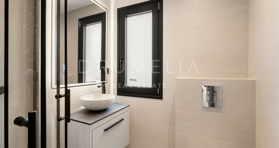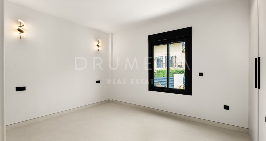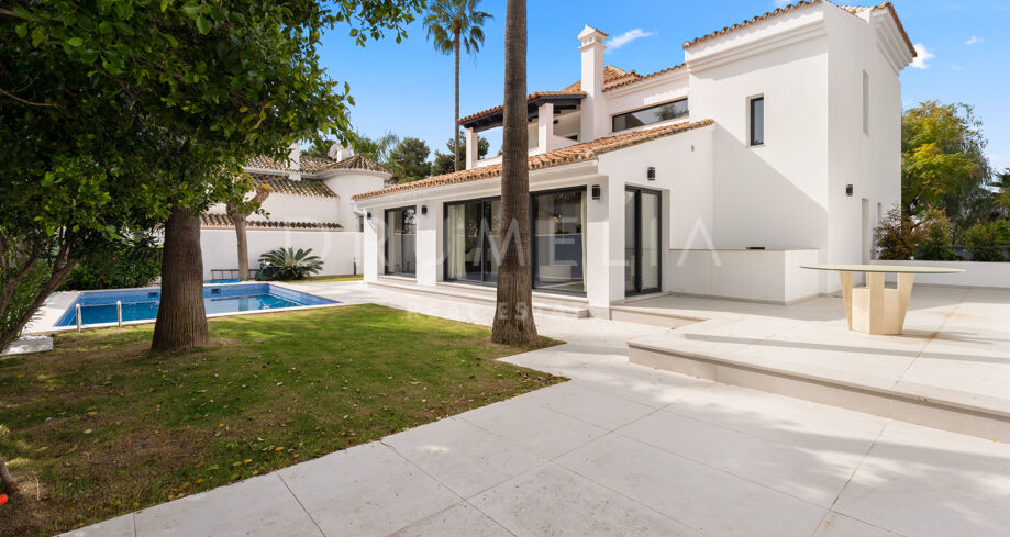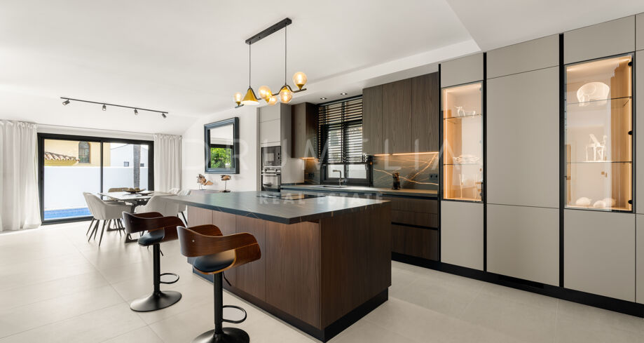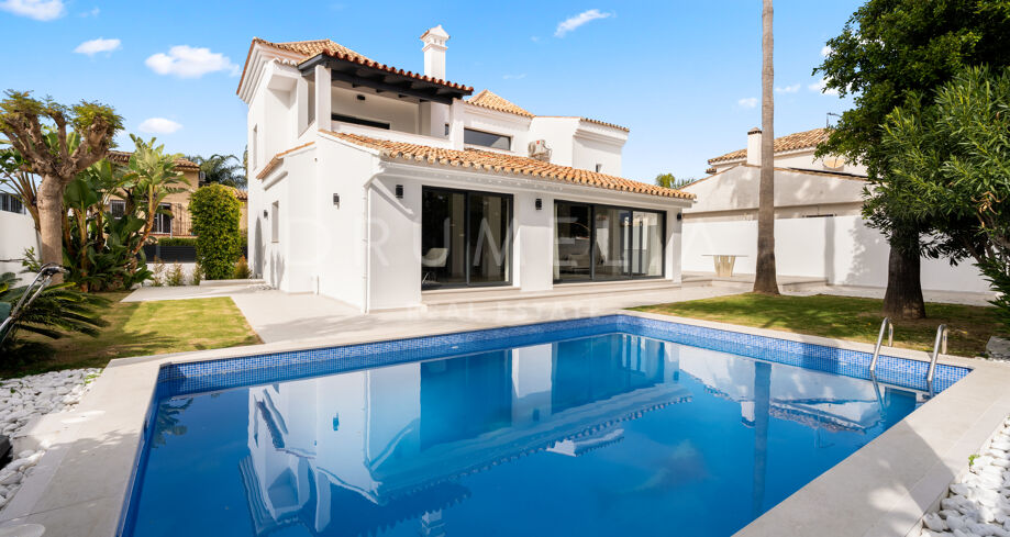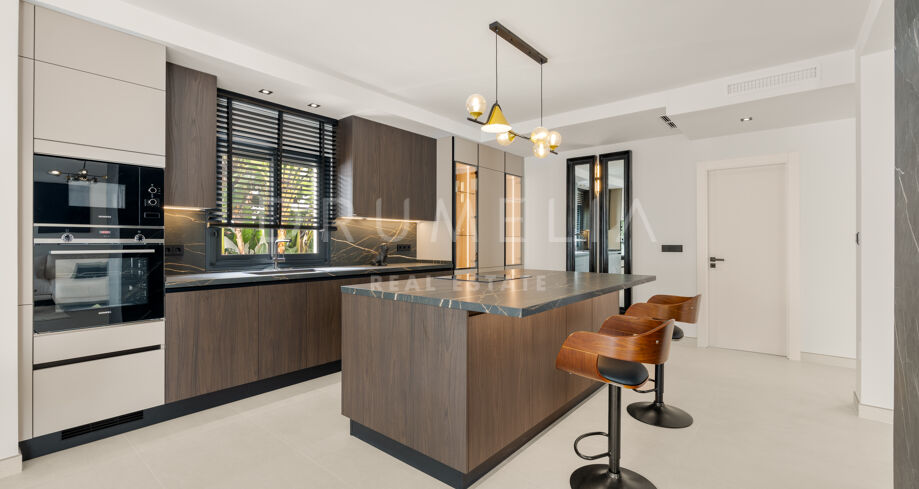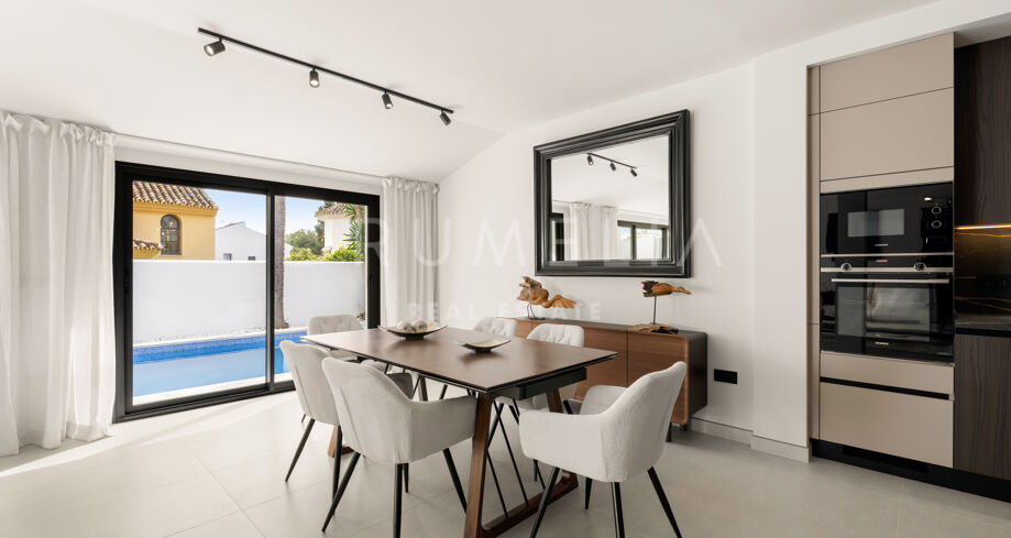 Укрытая в одном из наиболее устоявшихся и востребованных жилых кварталов Нуэва Андалусии, эта великолепно отреставрированная вилла представляет собой редкое сочетание классической андалузской архитектуры и безупречно точного современного дизайна. Построенная в 2001 году и полностью переосмысленная в 2025-м, недвижимость расположена на частном участке площадью 516 м² и предлагает 355 м² тщательно переконфигурированного жилого пространства на трёх этажах. Внешний облик немедленно задаёт тон — традиционный белёный фасад с черепицей из терракоты бережно сохранён, тогда как интерьеры были полностью демонтированы и воссозданы по совершенно иному стандарту. Это не косметическое обновление; это полное переосмысление, которое фотографии передают с абсолютной убедительностью.