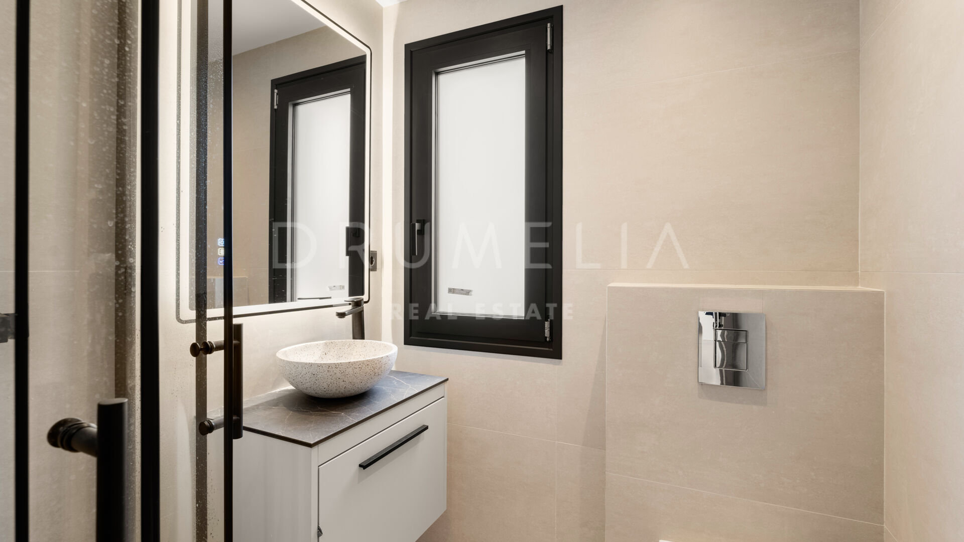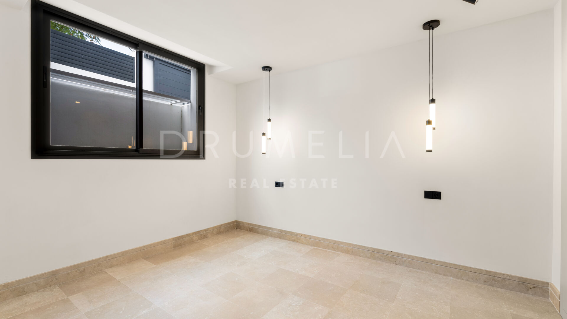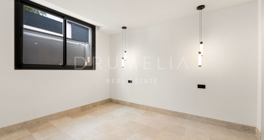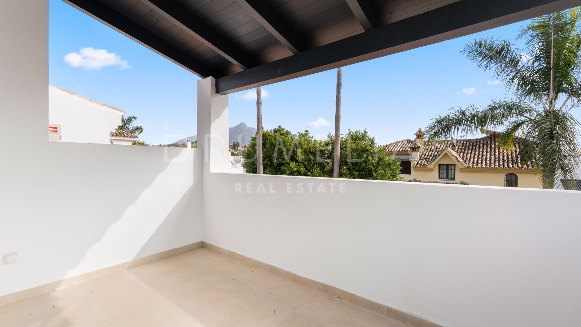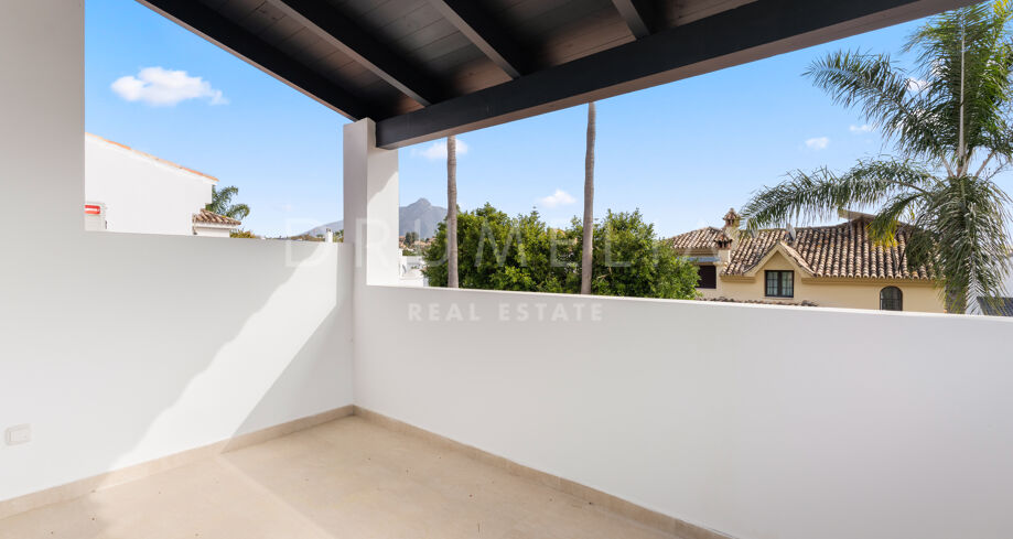 Укрытая в одном из наиболее устоявшихся и востребованных жилых кварталов Нуэва Андалусии, эта великолепно отреставрированная вилла представляет собой редкое сочетание классической андалузской архитектуры и безупречно точного современного дизайна. Построенная в 2001 году и полностью переосмысленная в 2025-м, недвижимость расположена на частном участке площадью 516 м² и предлагает 355 м² тщательно переконфигурированного жилого пространства на трёх этажах. Внешний облик немедленно задаёт тон — традиционный белёный фасад с черепицей из терракоты бережно сохранён, тогда как интерьеры были полностью демонтированы и воссозданы по совершенно иному стандарту. Это не косметическое обновление; это полное переосмысление, которое фотографии передают с абсолютной убедительностью.