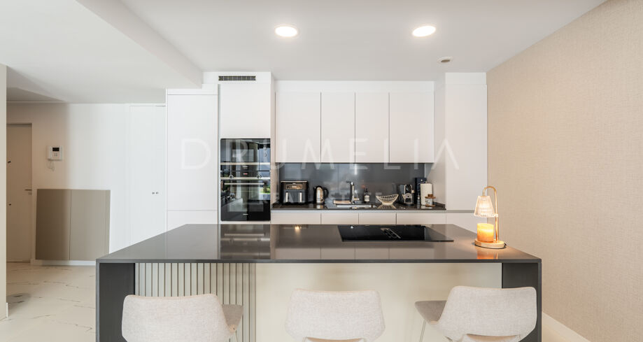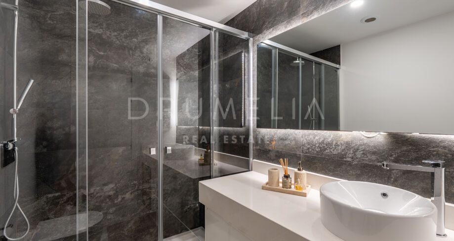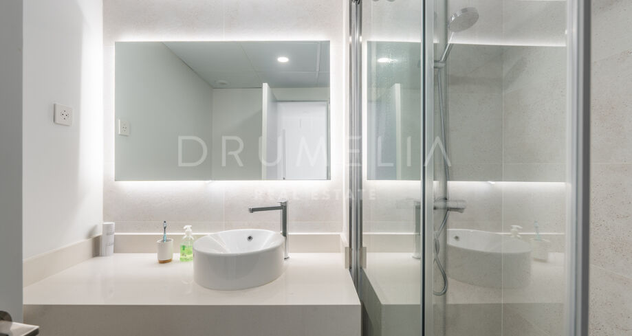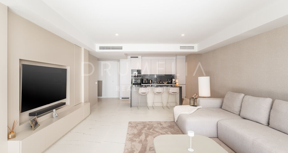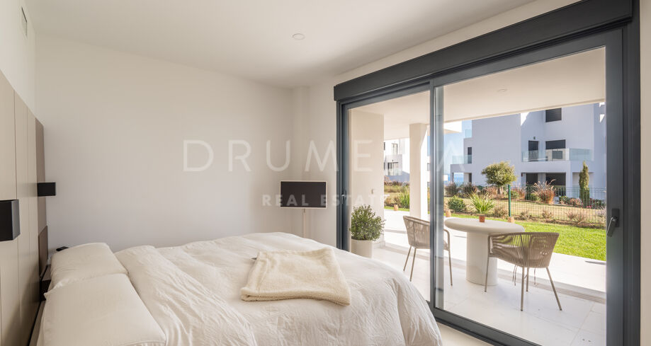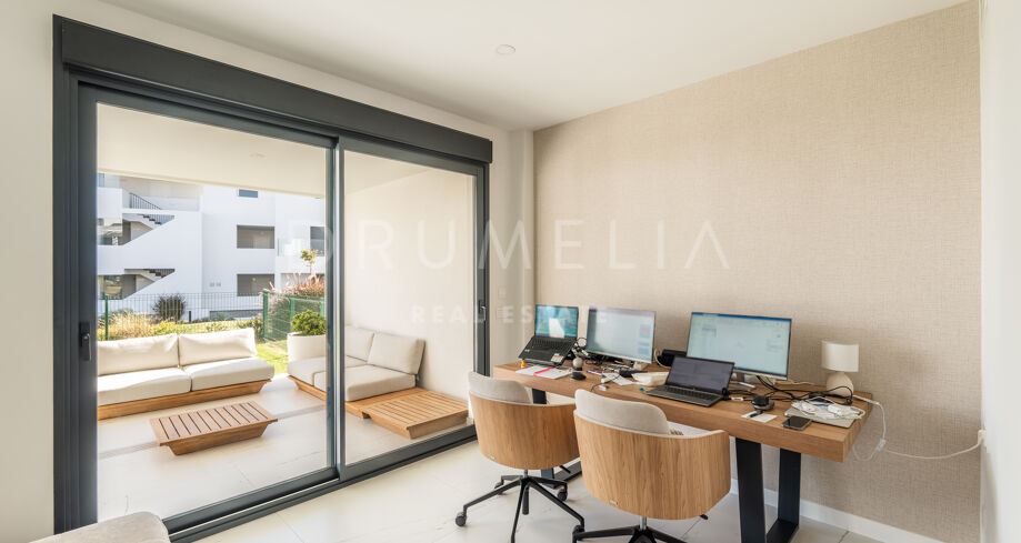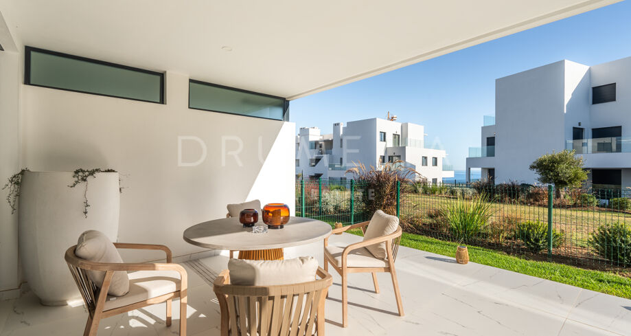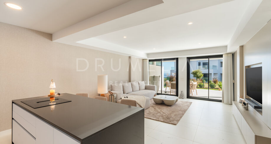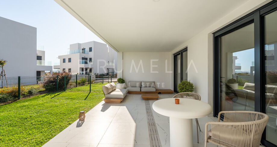 Расположенные в престижном районе Bahía de Casares апартаменты на первом этаже представляют собой гармоничное сочетание современного дизайна и прибрежного уюта. Общая площадь — 102 м², терраса — 45 м². Планировка открытого типа подчеркивает простор и естественное освещение.