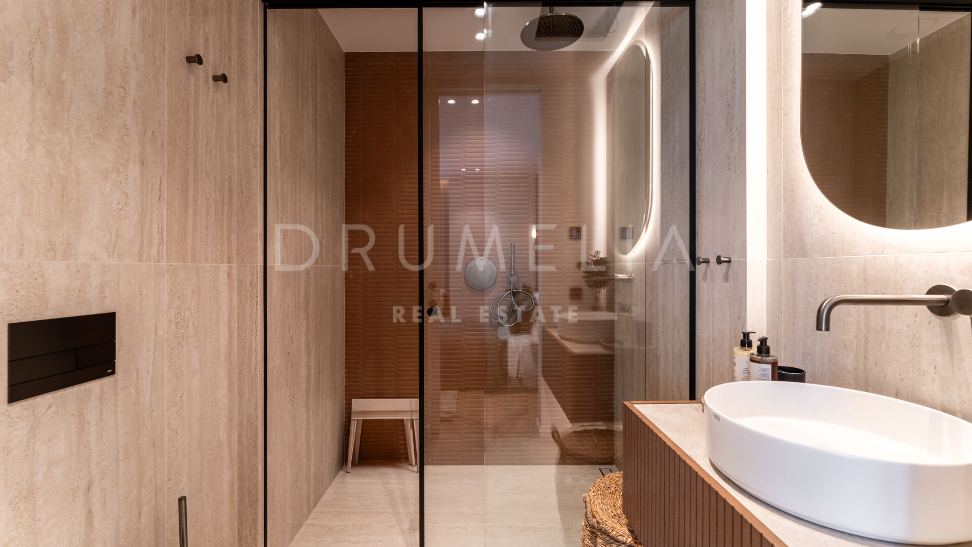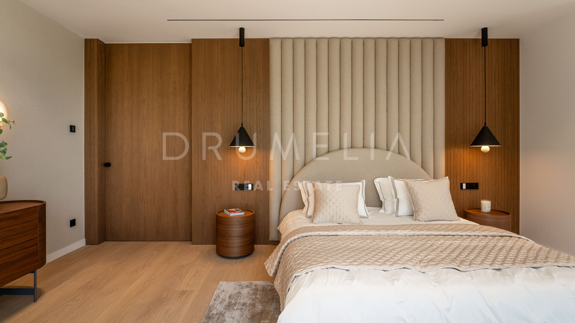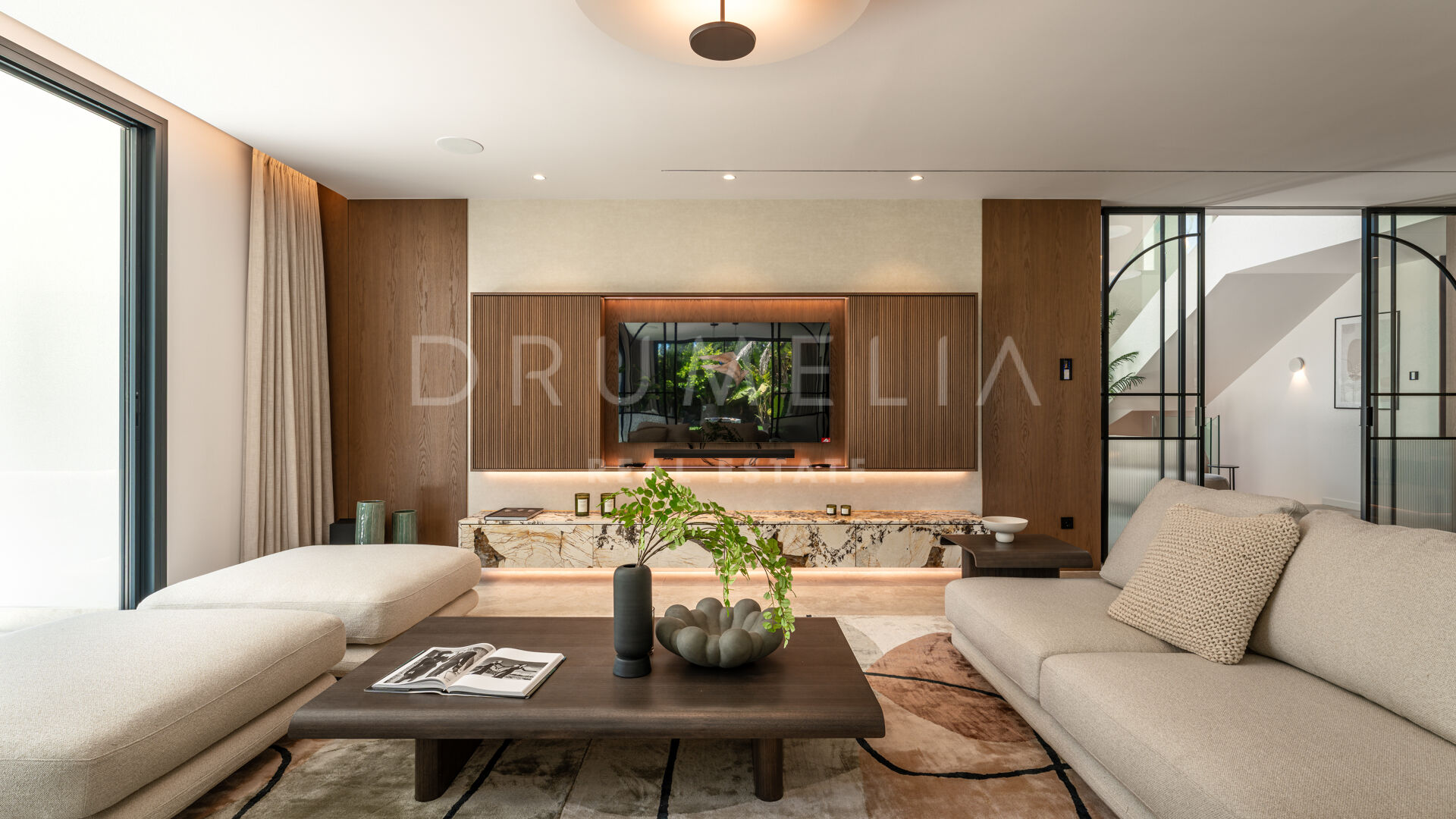 Построенная на трех великолепно оформленных уровнях, эта полностью меблированная вилла предлагает органичное сочетание изысканности и комфорта. На первом этаже вас встретят просторная гостиная с кухней, оборудованная по последнему слову техники, а на верхнем этаже – три просторные спальни, включая самую впечатляющую главную спальню с отдельной гостиной, гардеробной и ванной комнатой.