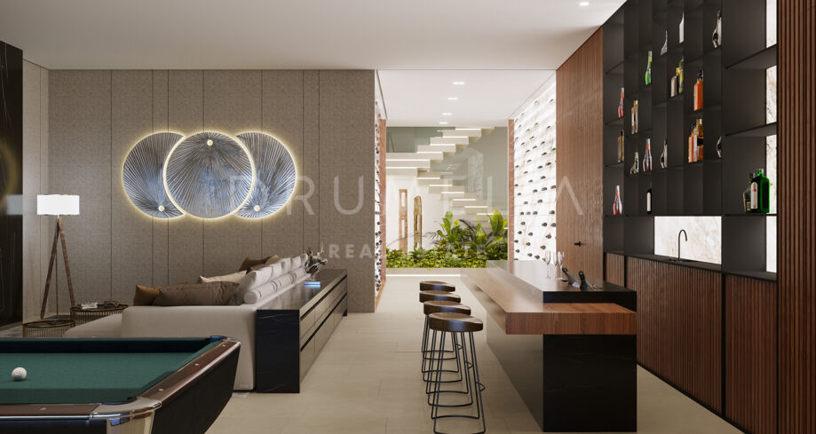 Интерьеры наполнены светом и пространством. Дом включает крытый бассейн, фитнес-зал и отдельный кабинет, обеспечивая комфорт и приватность. Villa Bond — это редкая возможность жить современно и изысканно в одном из лучших районов Марбельи.