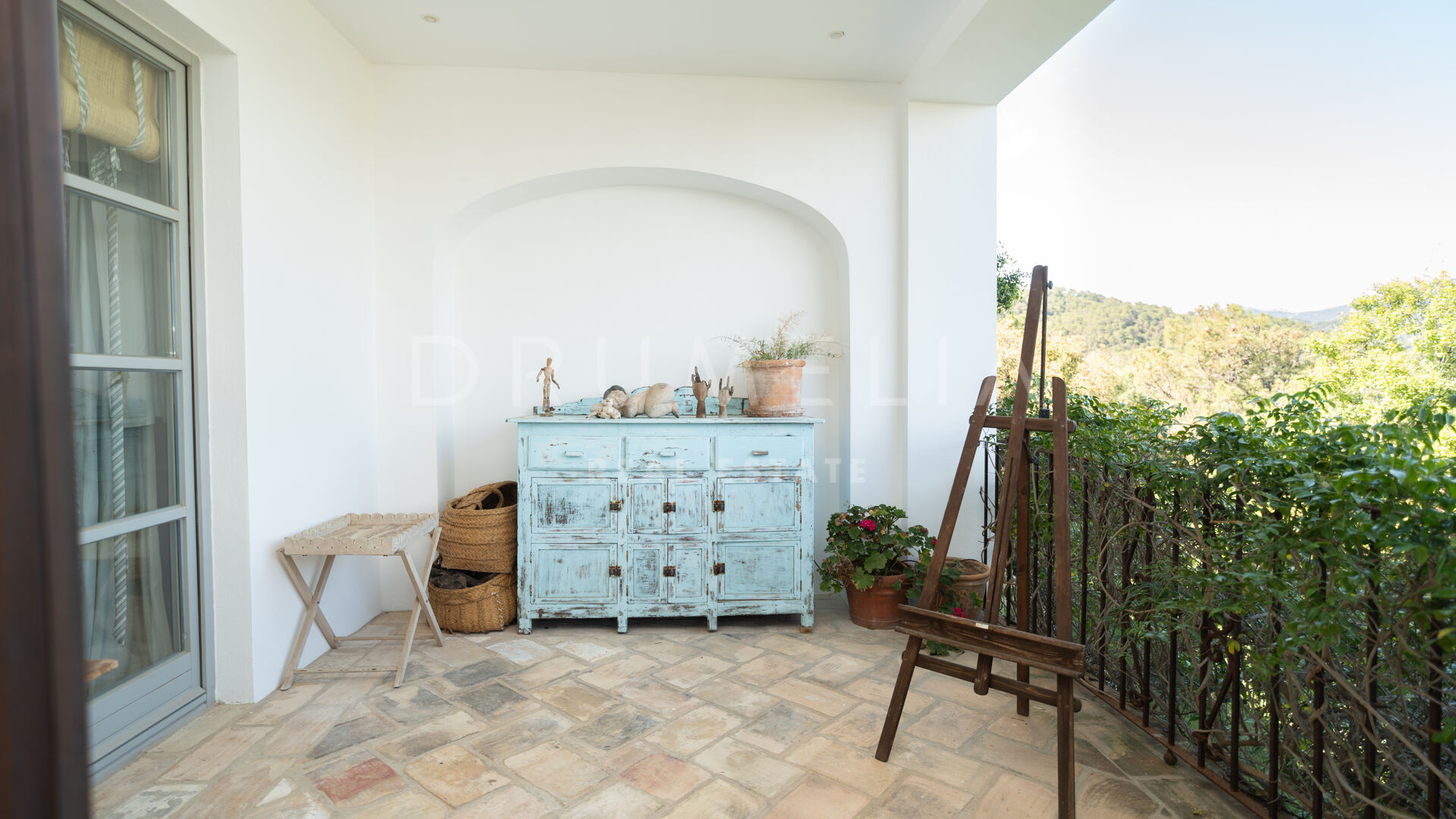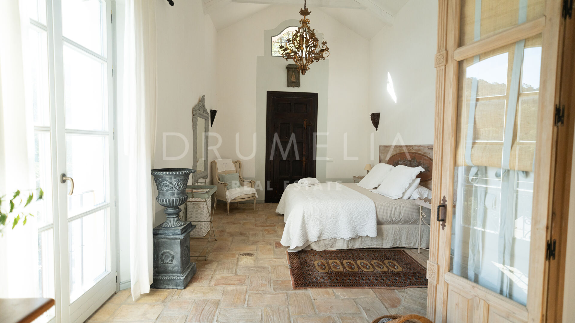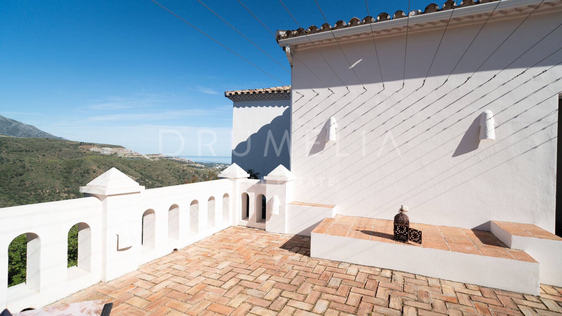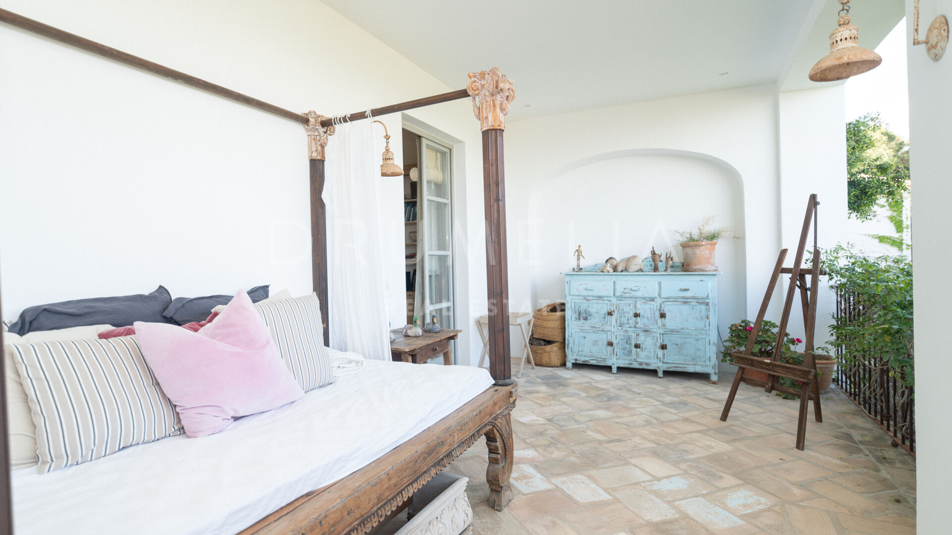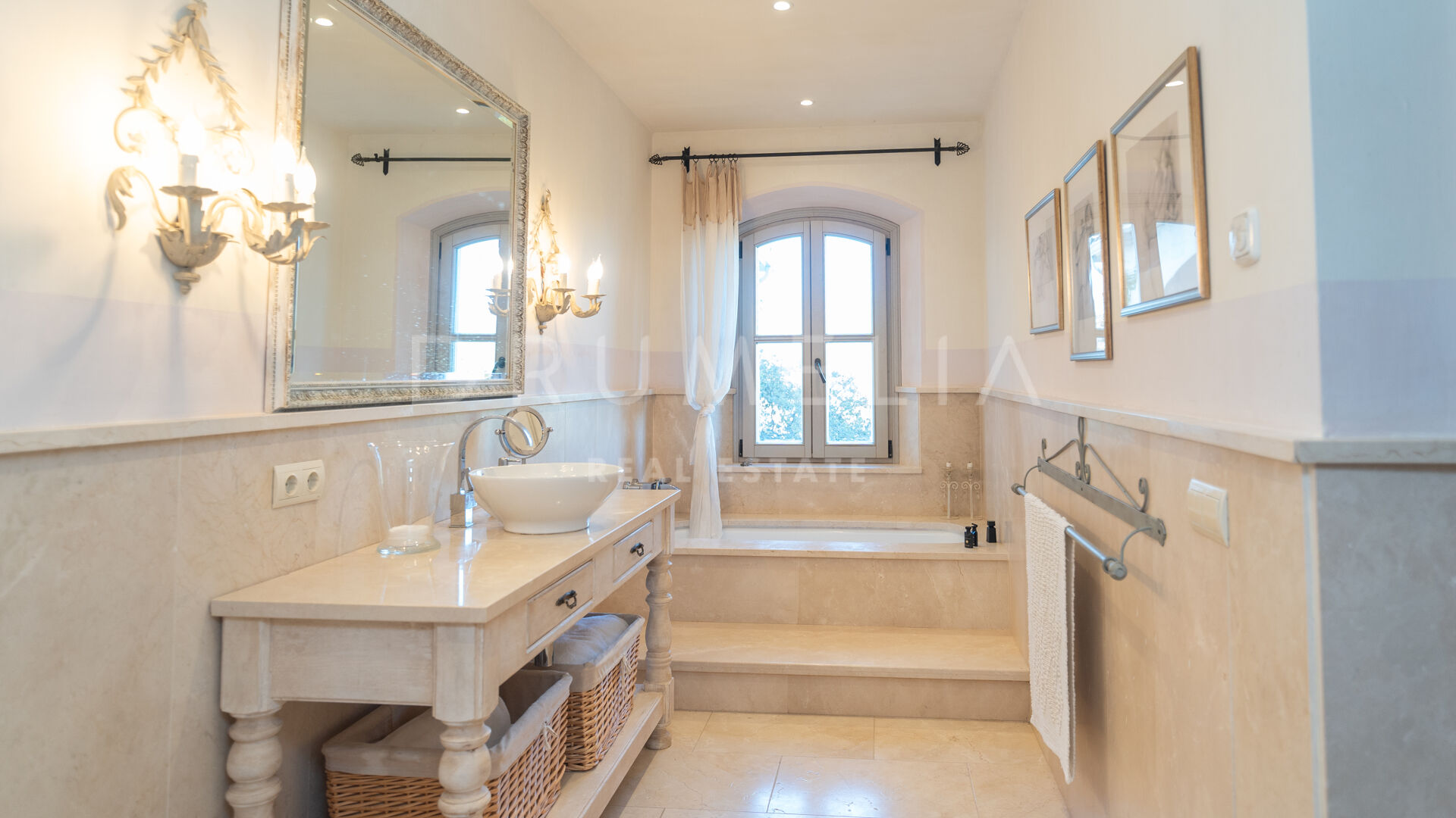 Интерьер выделяется гармоничным и детализированным дизайном с ручной работой каминов, расписными потолками и благородными материалами, создающими теплую и изысканную атмосферу. Просторные террасы и сады предлагают панорамный вид на Средиземное море и гору Ла Конча, дополняя привилегированную природную среду.
