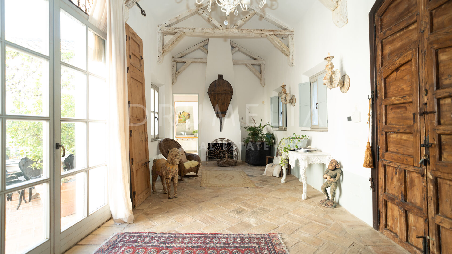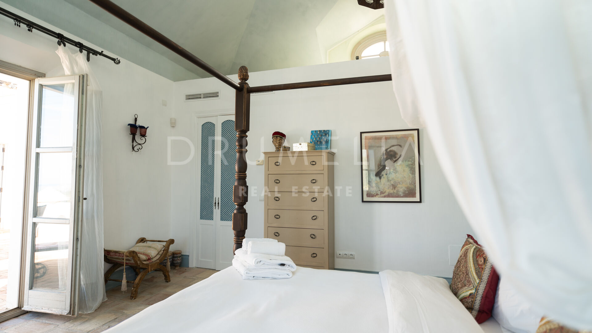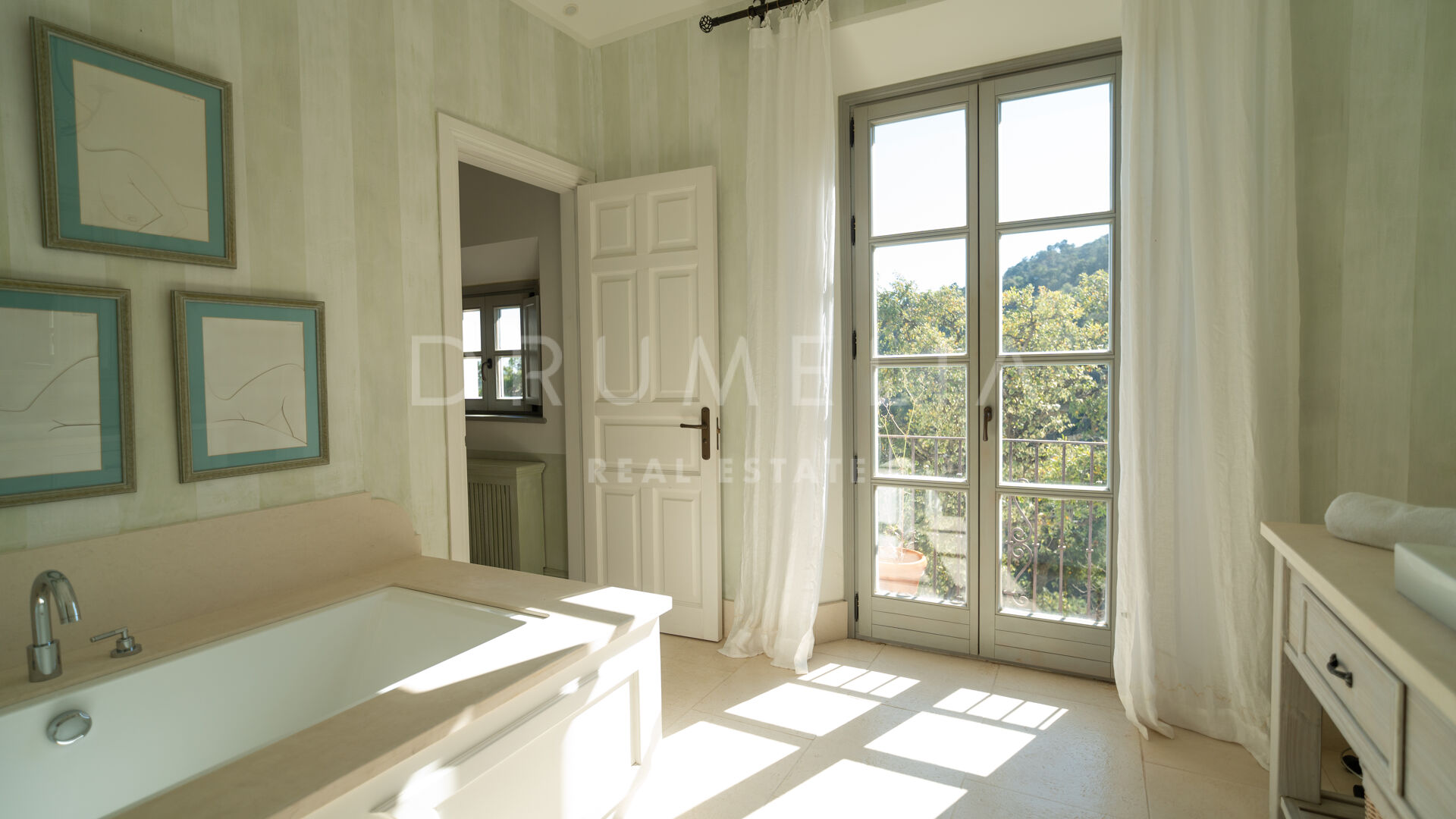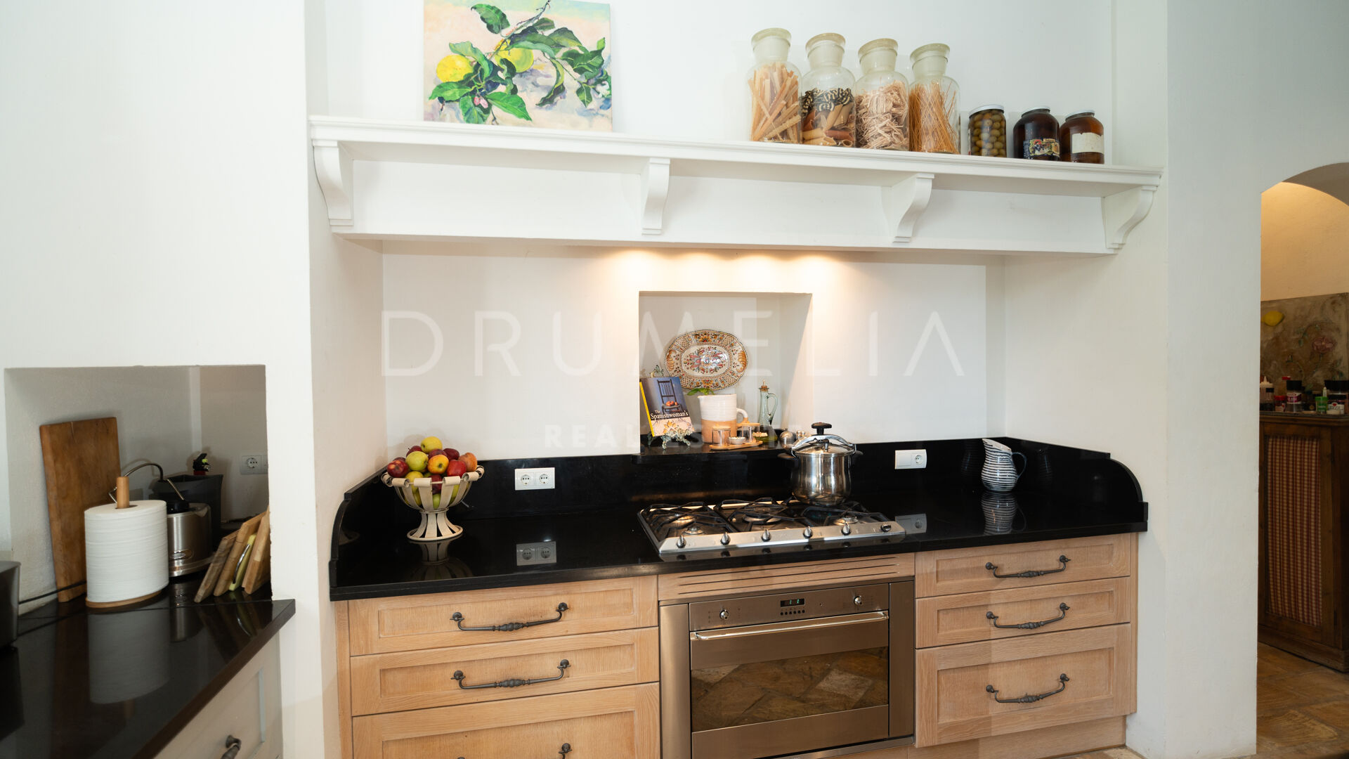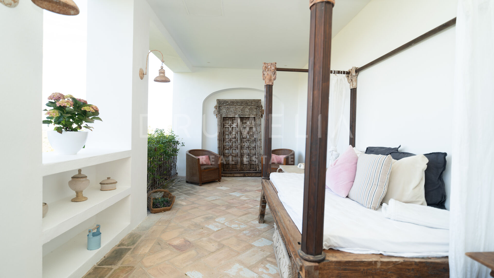 Интерьер выделяется гармоничным и детализированным дизайном с ручной работой каминов, расписными потолками и благородными материалами, создающими теплую и изысканную атмосферу. Просторные террасы и сады предлагают панорамный вид на Средиземное море и гору Ла Конча, дополняя привилегированную природную среду.