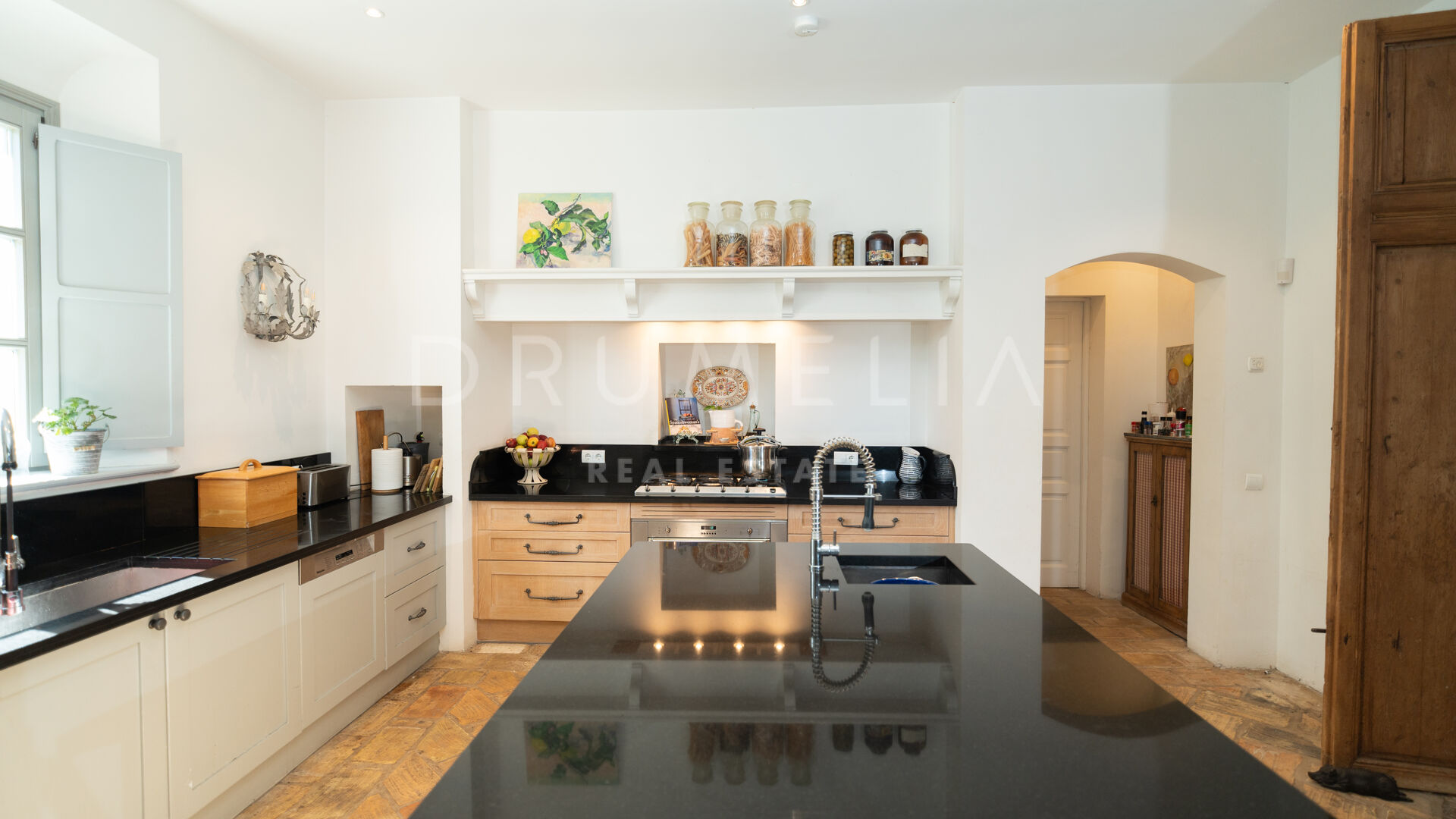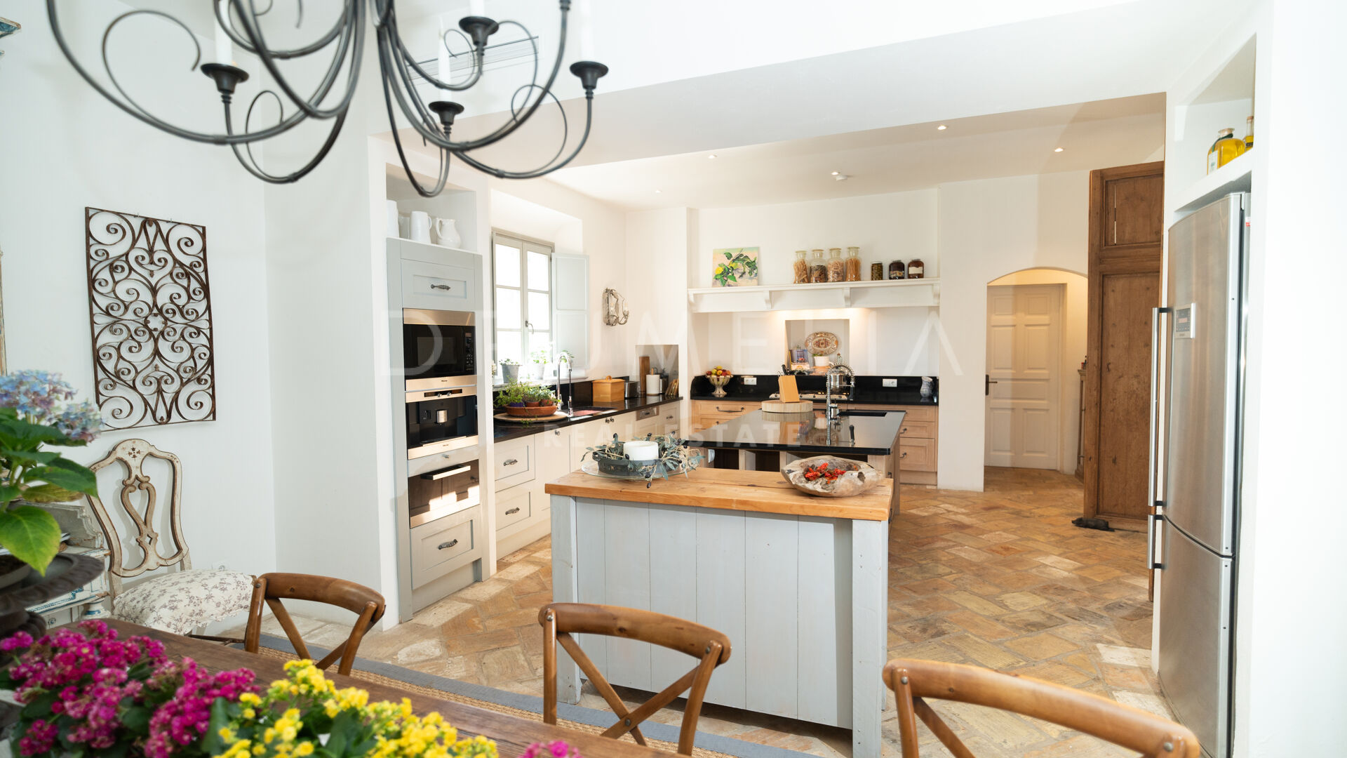 Главная кухня в стиле рустик шик дополнена вспомогательной кухней, в то время как на первом этаже расположены три спальни с уникальной планировкой, обеспечивающей приватность и комфорт. На верхнем этаже главная спальня предлагает роскошную отделку, приватную террасу и просторную ванную комнату.