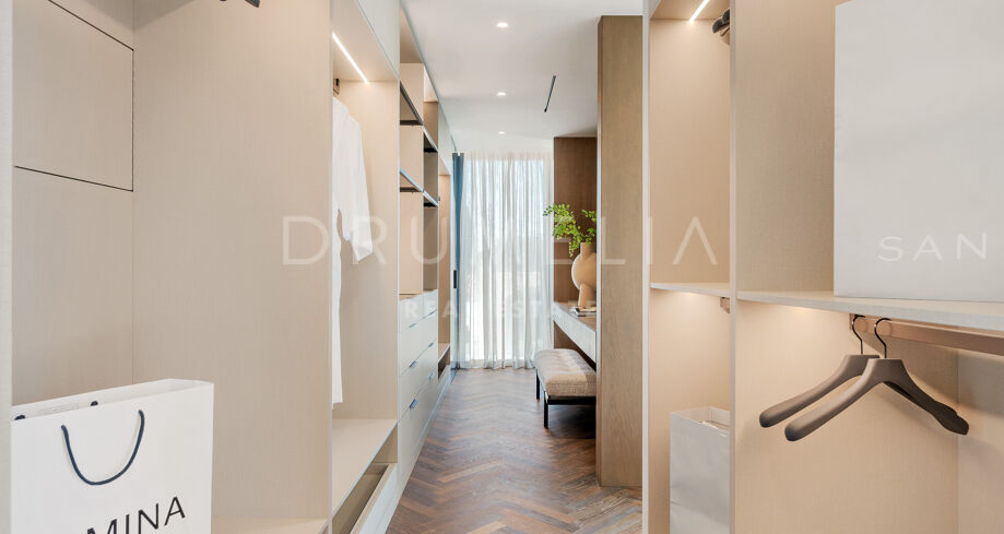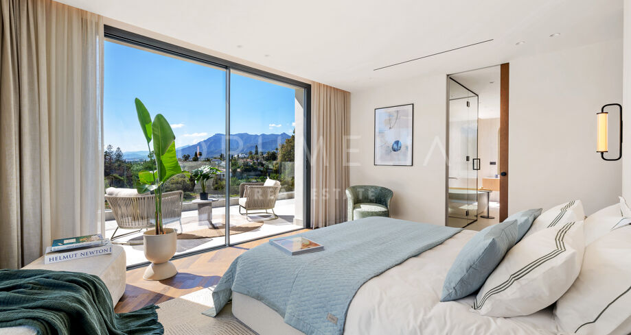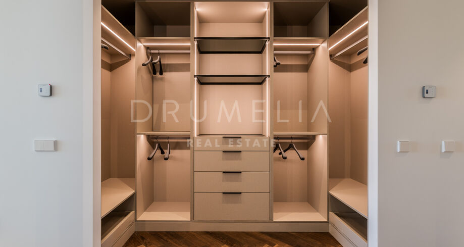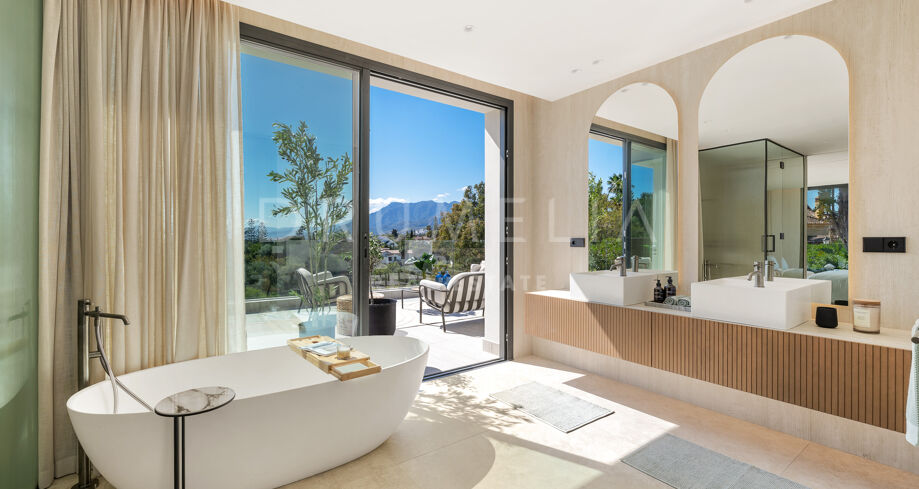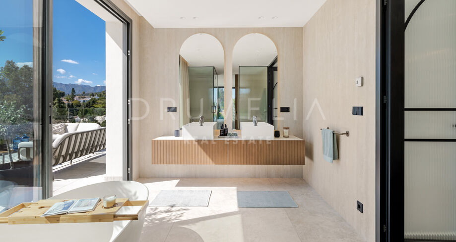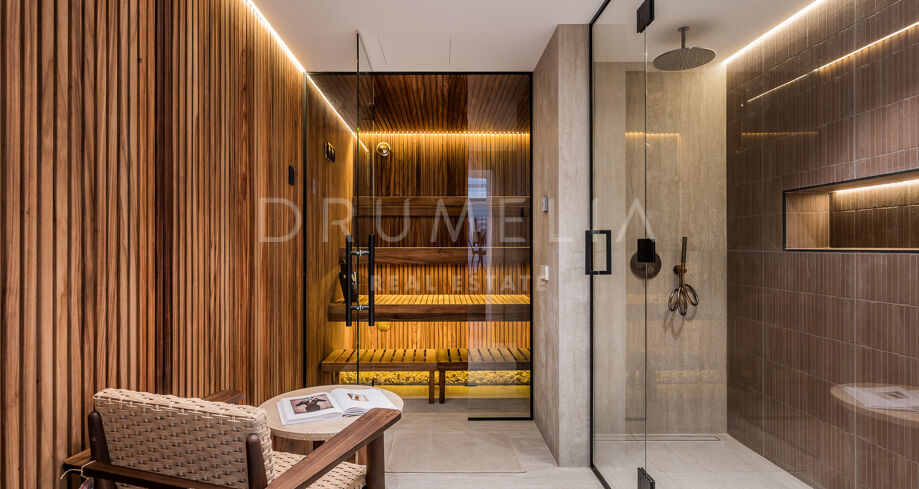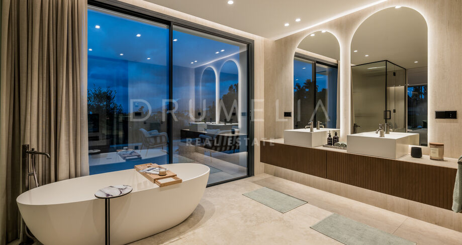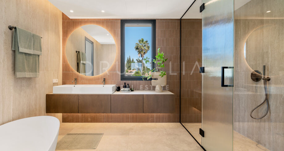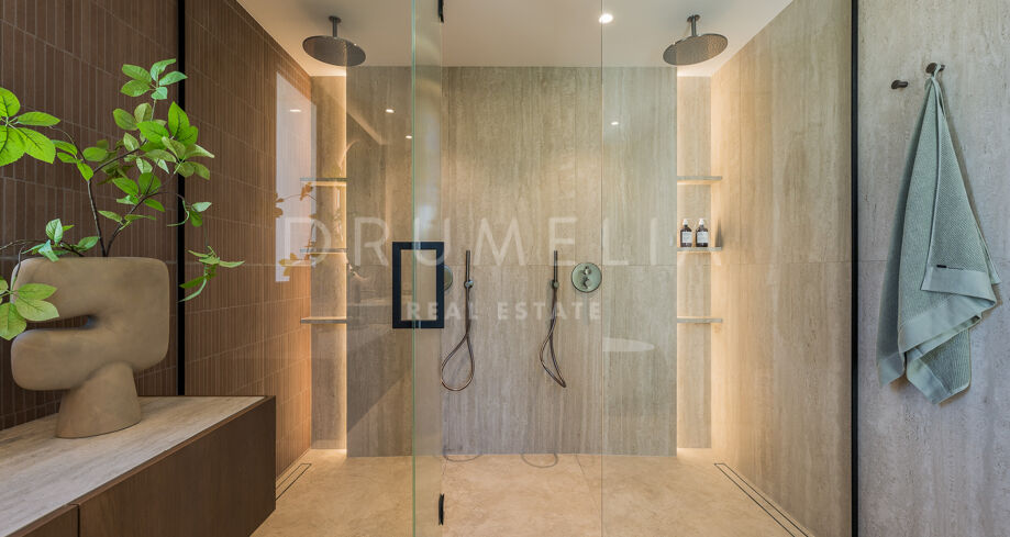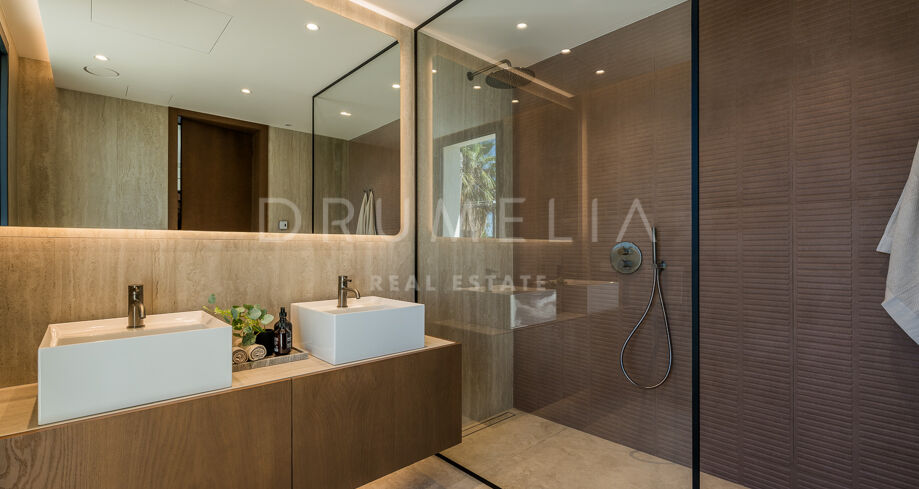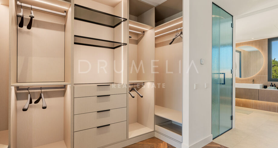 Главная спальня дарит ощущение уюта и умиротворения, открываясь на виды сада или гор. Гардеробная предлагает достаточно места для хранения с элегантной встроенной мебелью и мягкой подсветкой. Ванные комнаты, как в спа: отдельно стоящие ванны, двойные раковины и душевые с рифлеными стеклянными дверями и тёплыми каменными деталями. Всё продумано до мелочей — от зеркал с подсветкой до встроенного винного шкафа.