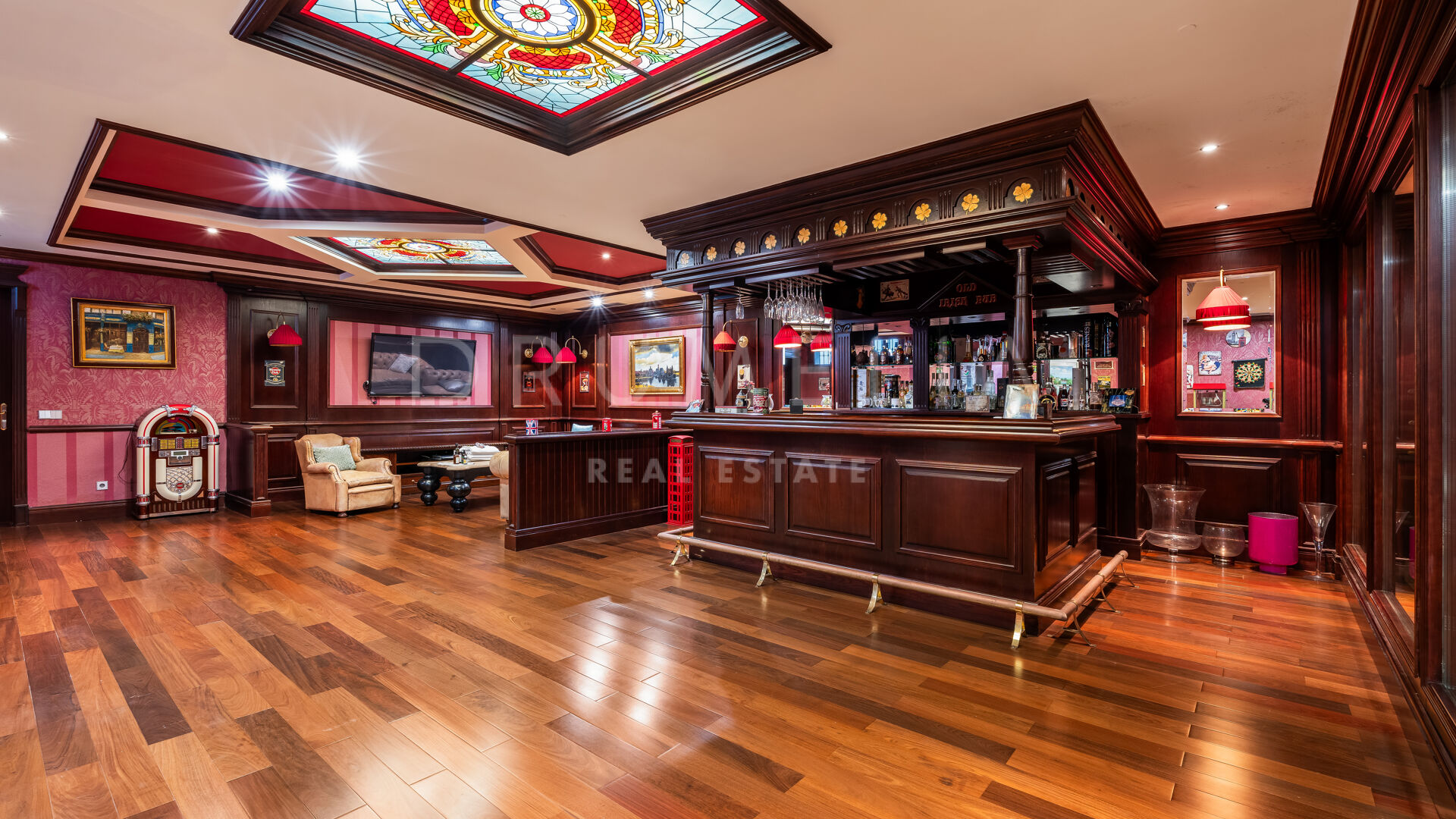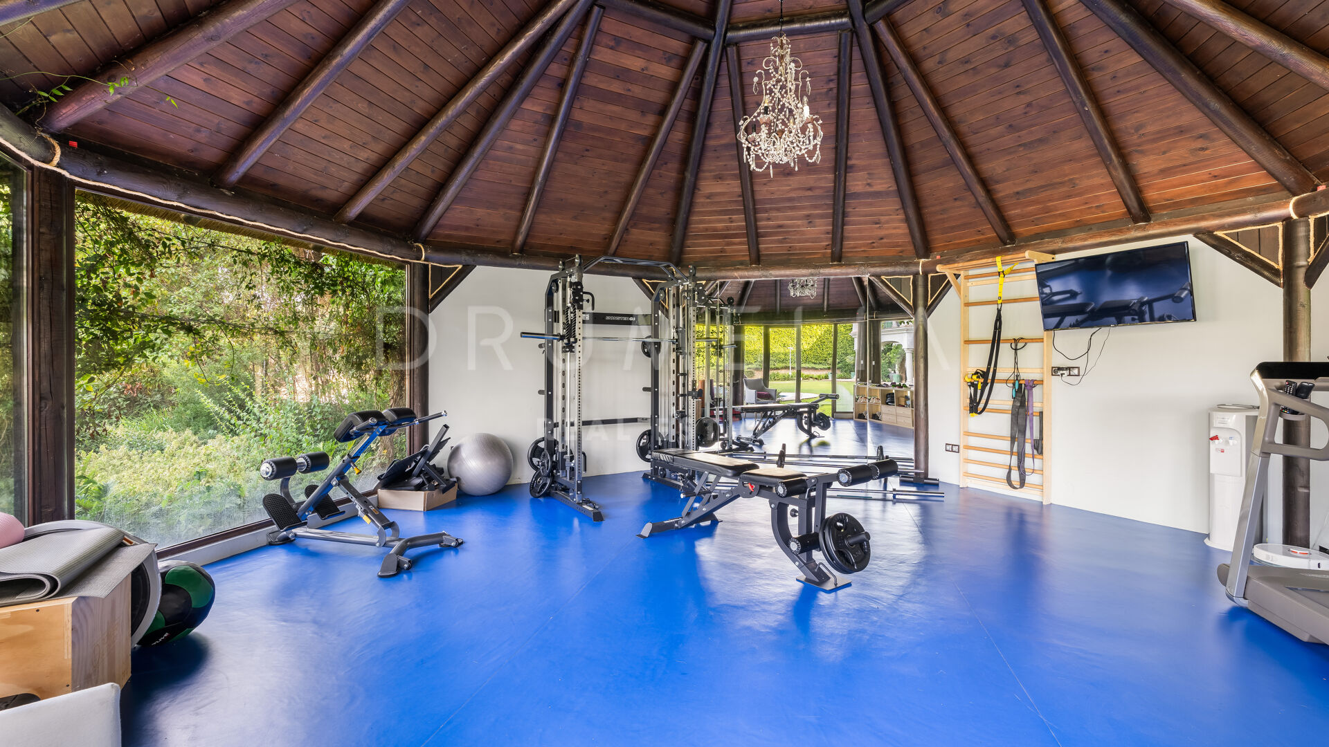 Среди других достоинств дома — прекрасный большой бассейн, частный кинотеатр, полностью оборудованный спортзал в отдельном павильоне, традиционная сауна, винный погреб на заказ и бар из дерева, вдохновлённый классическим английским пабом. Бильярдная, с её сводчатым тростниковым потолком и панорамным остеклением, открывает прекрасные виды на сад и создаёт расслабленную атмосферу для дружеских встреч.