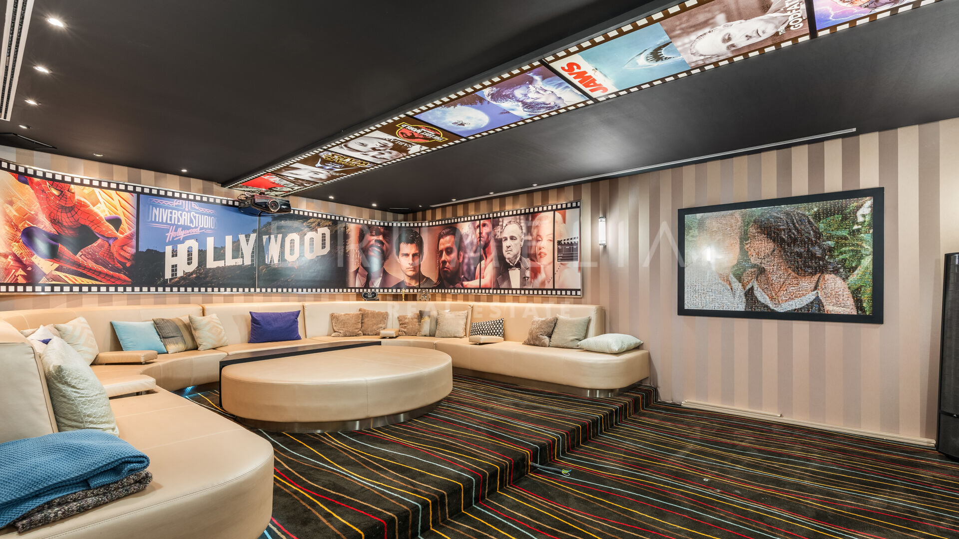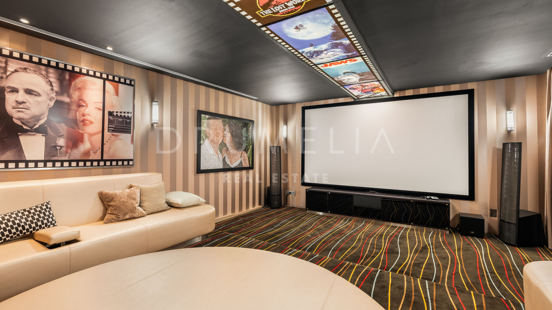 Сама вилла выполнена в классическом современном стиле, сочетая традиционные элементы с более обновлённой эстетикой. Она расположена на трёх уровнях и предлагает семь спален и восемь ванных комнат. Планировка включает три спальни на верхнем этаже, две — на основном и две — на нижнем уровне. Просторный кабинет с прямым выходом на террасу соединён с главной спальней и вместе с большой гардеробной образует приватное крыло для владельцев.