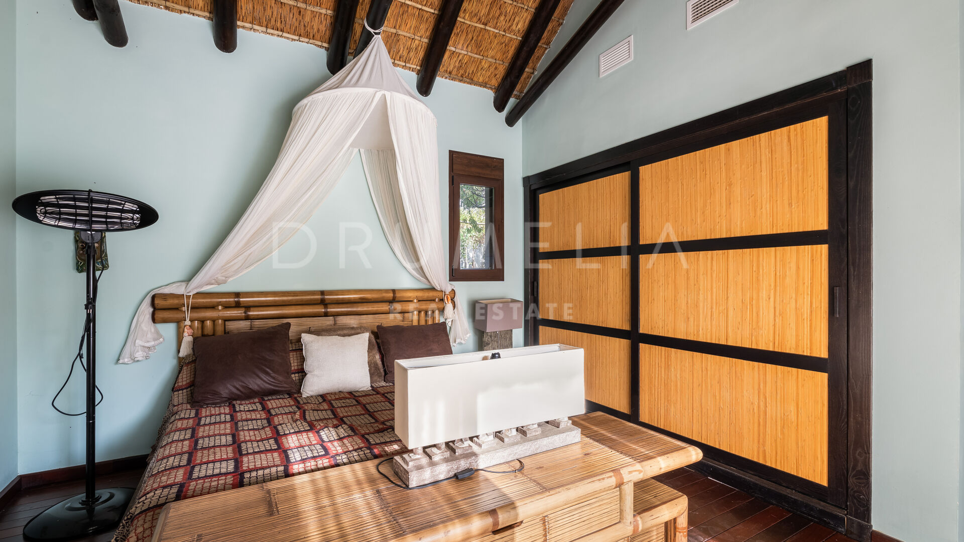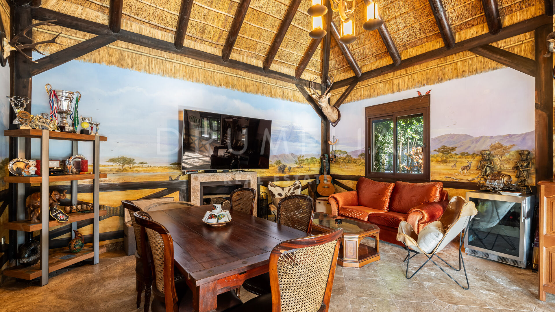 Одной из главных особенностей виллы является впечатляющий развлекательный павильон площадью 170 м². Спроектированный для круглогодичного использования, он оборудован крышей из тростника, встроенным барбекю, летней кухней, зоной отдыха и лаунджем с бильярдным столом в русском стиле. Павильон также включает очаровательную летнюю спальню с раздвижными дверями в сад, предлагая гостям уникальное место отдыха в тёплые месяцы.