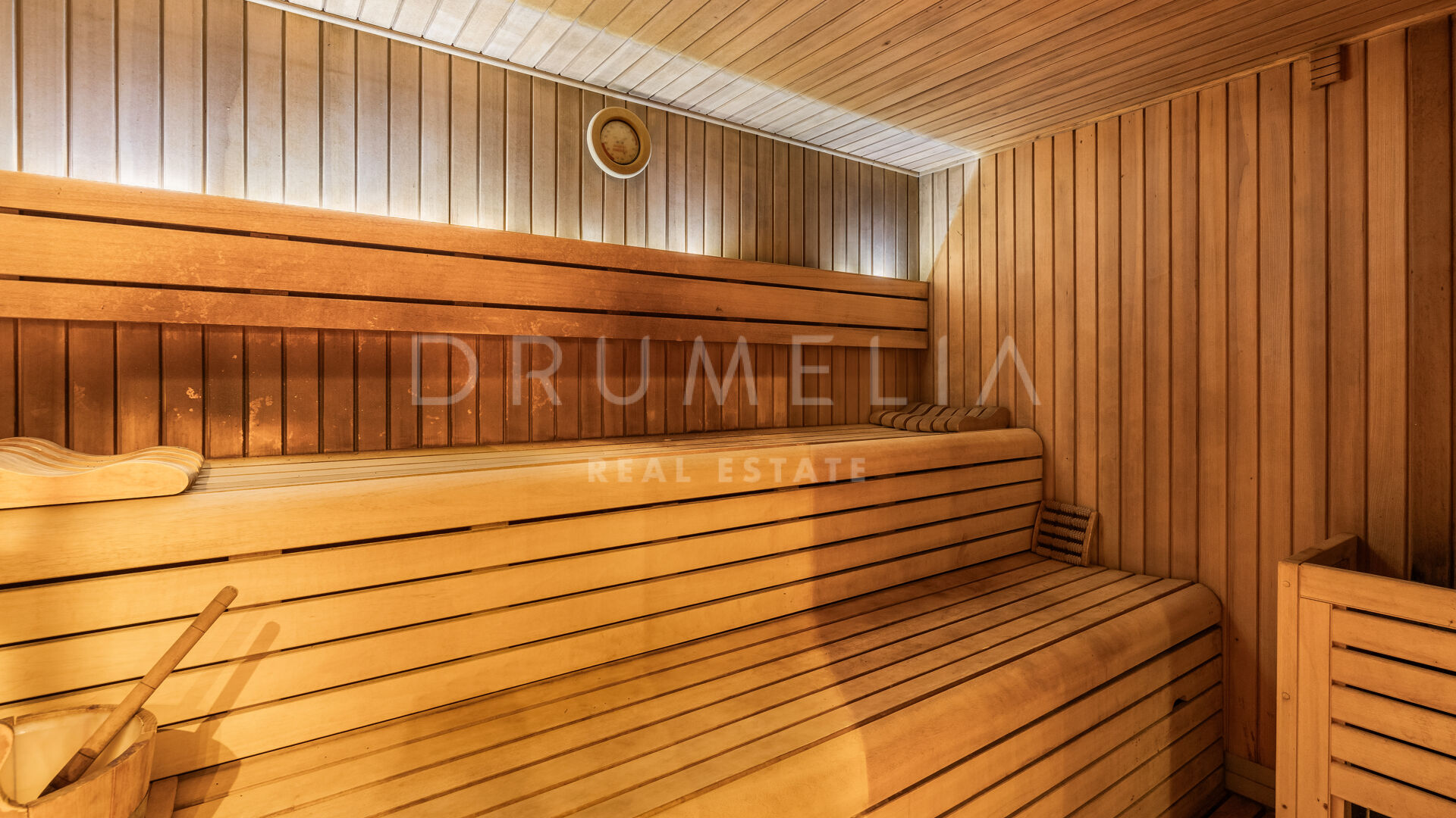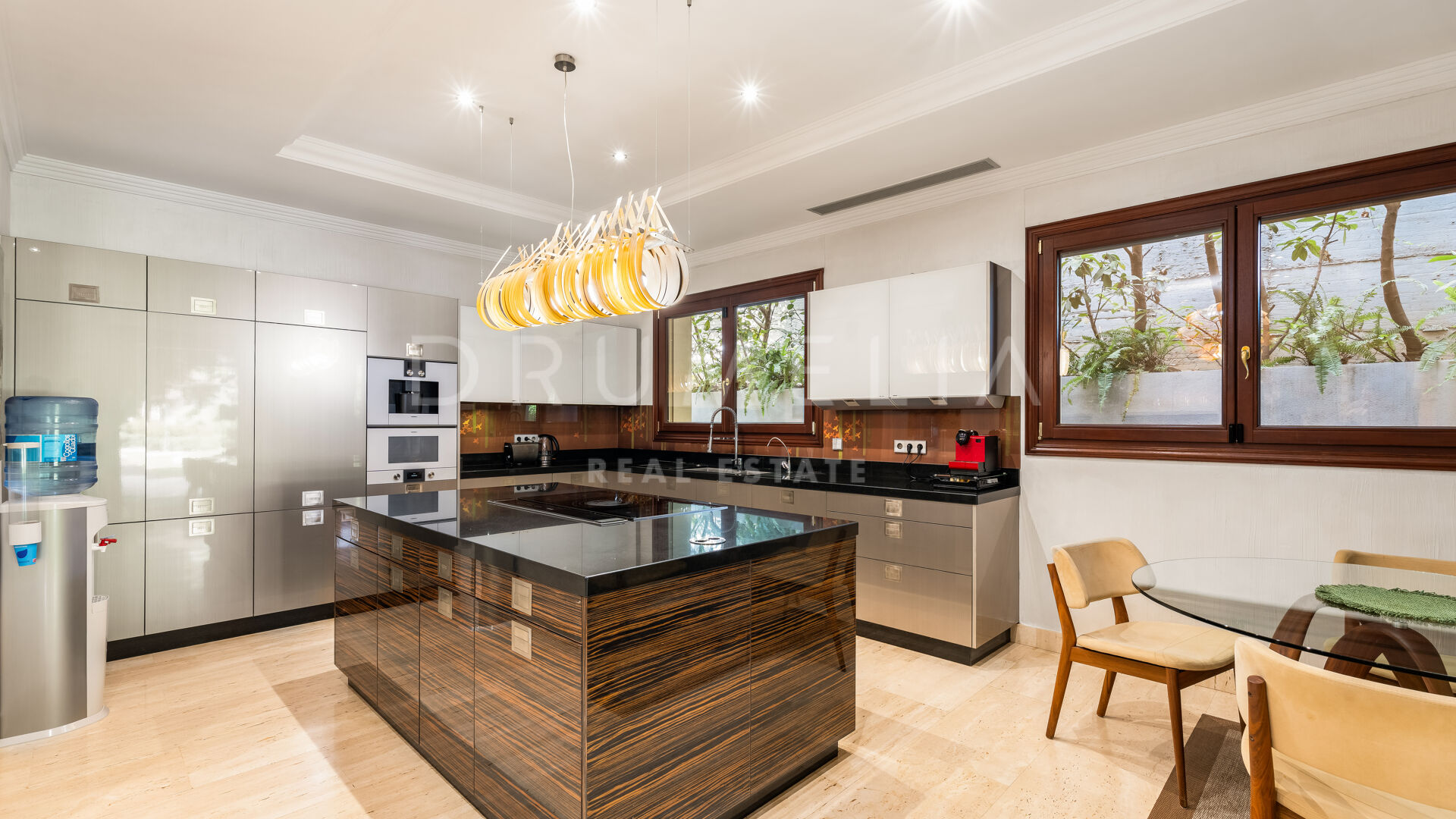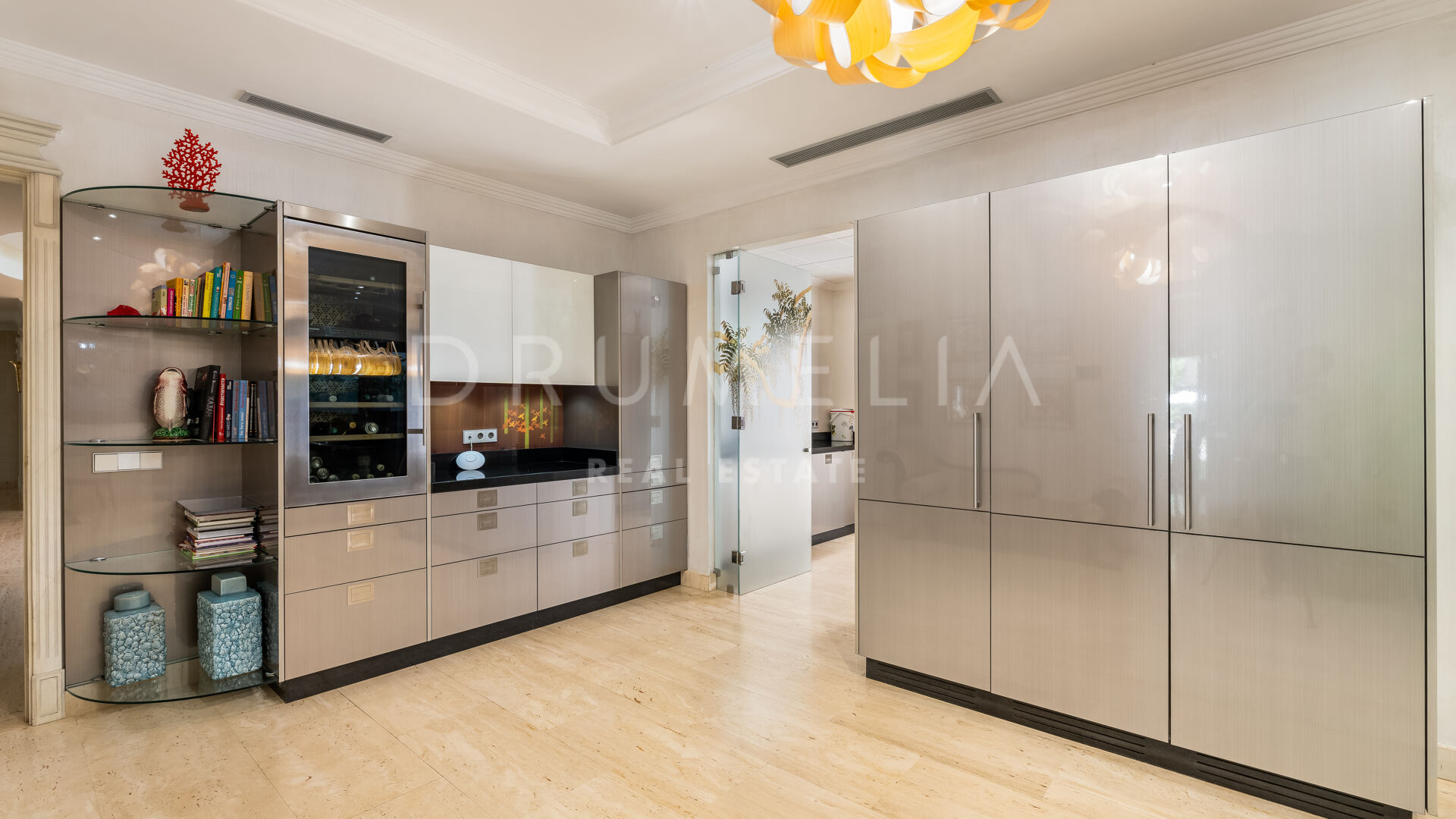 Интерьеры наполнены естественным светом благодаря большим раздвижным дверям, ведущим на просторные террасы, создавая плавный переход между внутренними и внешними пространствами. Несколько гостиных зон, большая столовая и просторная кухня делают дом идеальным как для повседневной жизни, так и для приёма гостей. Кухня разделена на две функциональные зоны, сочетая удобство и практичность для приготовления пищи, хранения и ежедневного использования.