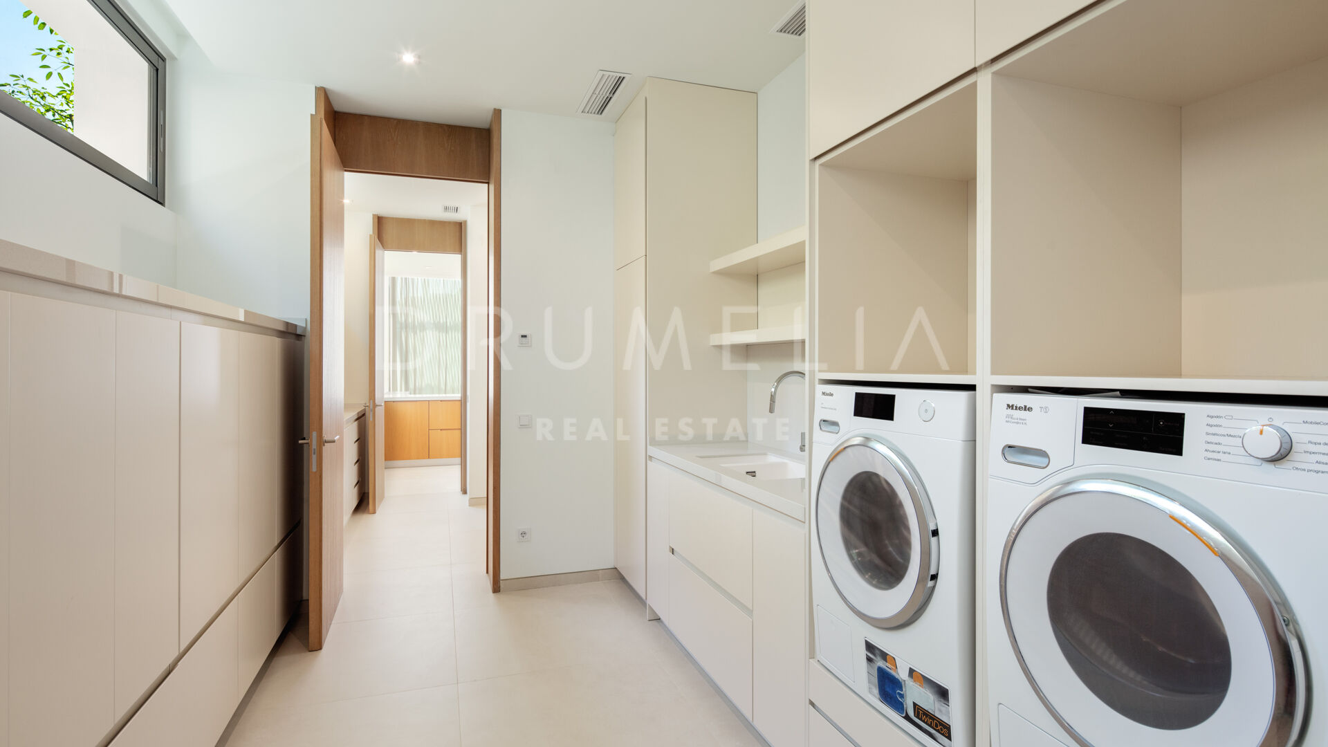 Элегантно оформленные интерьеры излучают изысканность, каждая деталь тщательно продумана с использованием лучших материалов и обеспечивает непревзойденное ощущение современной роскоши. Изящная полностью оборудованная кухня, оснащенная современной бытовой техникой от Gaggenau, и представляет собой настоящий кулинарный рай. Она органично сочетает в себе практичность и эстетику. Кухня соединяется с обеденной зоной, которая ведет на террасу, где будет приятно проводить семейные ужины аль фреско. Концепция открытой планировки объединяет столовую и гостиную со стеклянными дверями, ведущими наружу. Спасльни расположены на 2 этажах, большинство на первом этаже, откуда открывается потрясающий вид на изумрудно-зеленое поле для гольфа. Роскошный Мастер-люкс находится на верхнем уровне виллы и представляет собой оазис для отдыха.