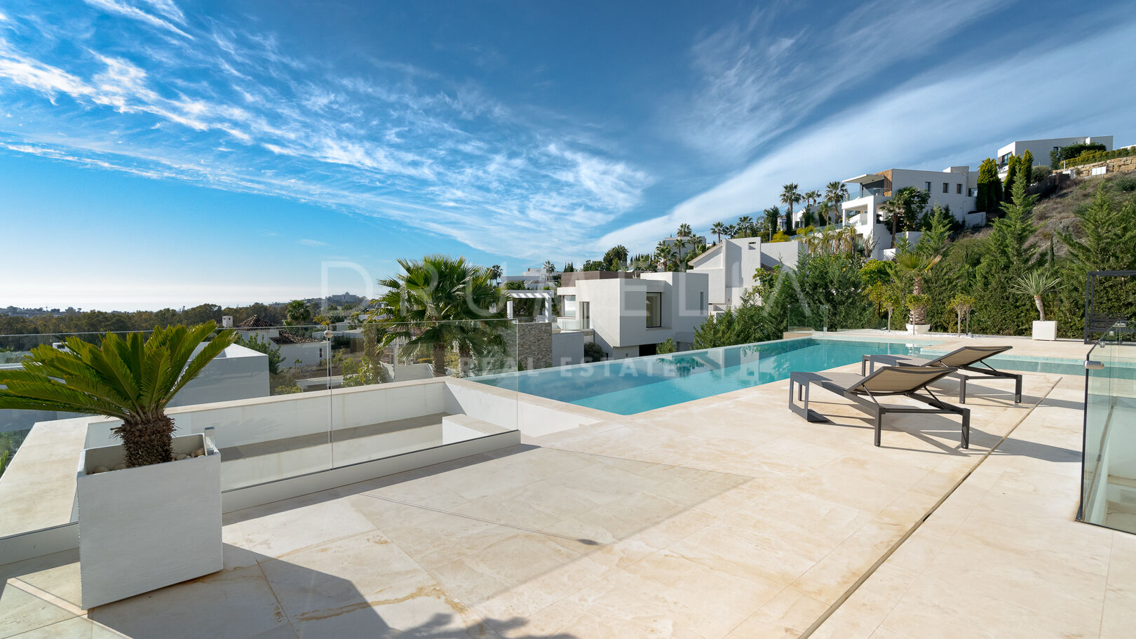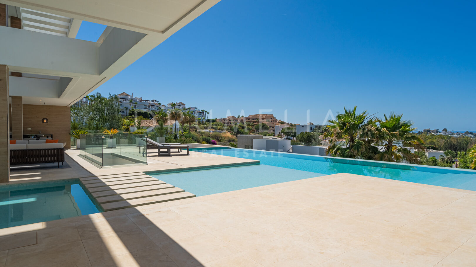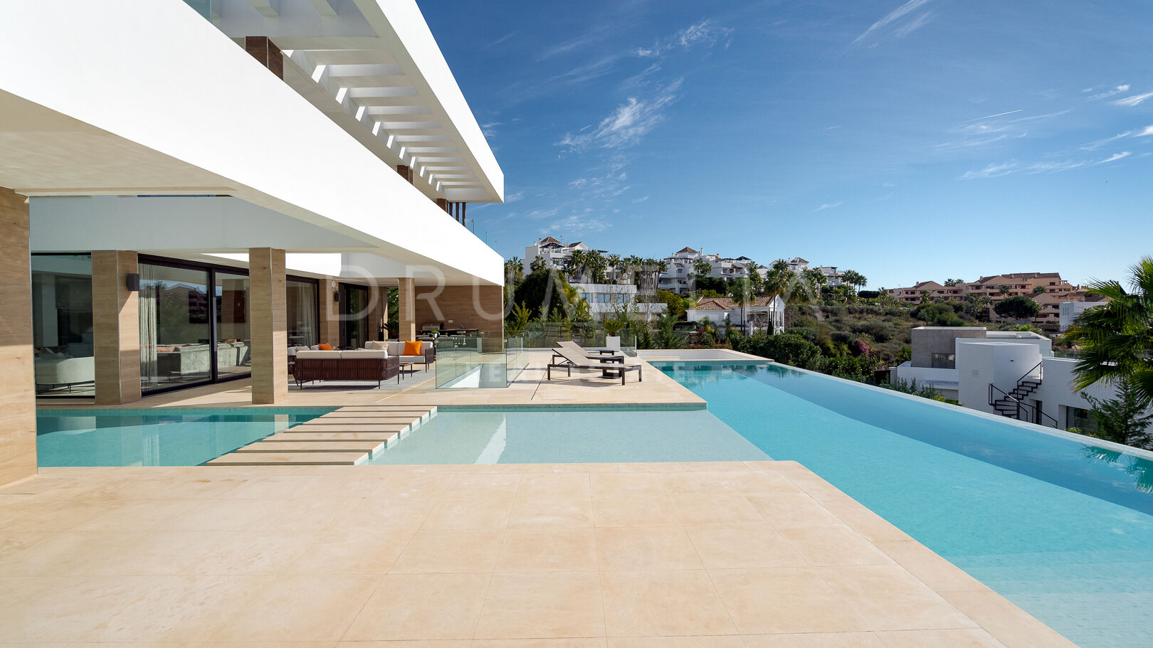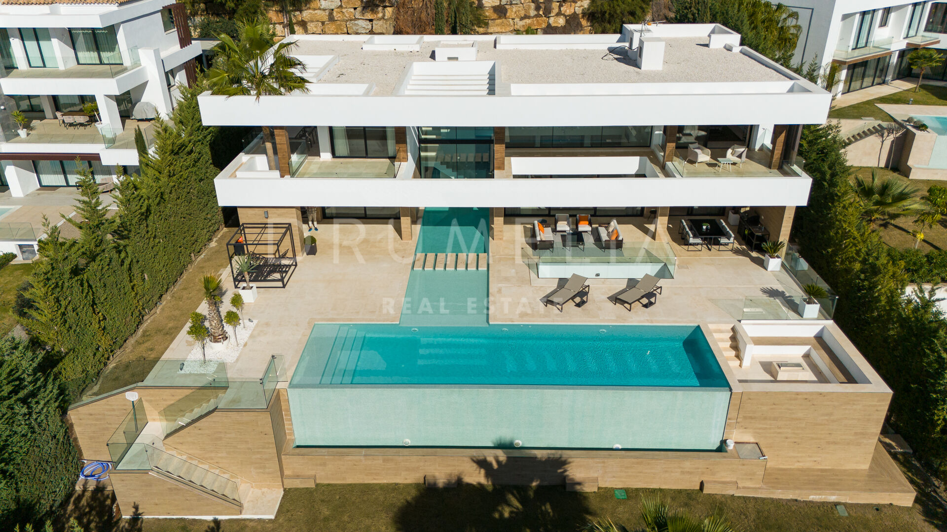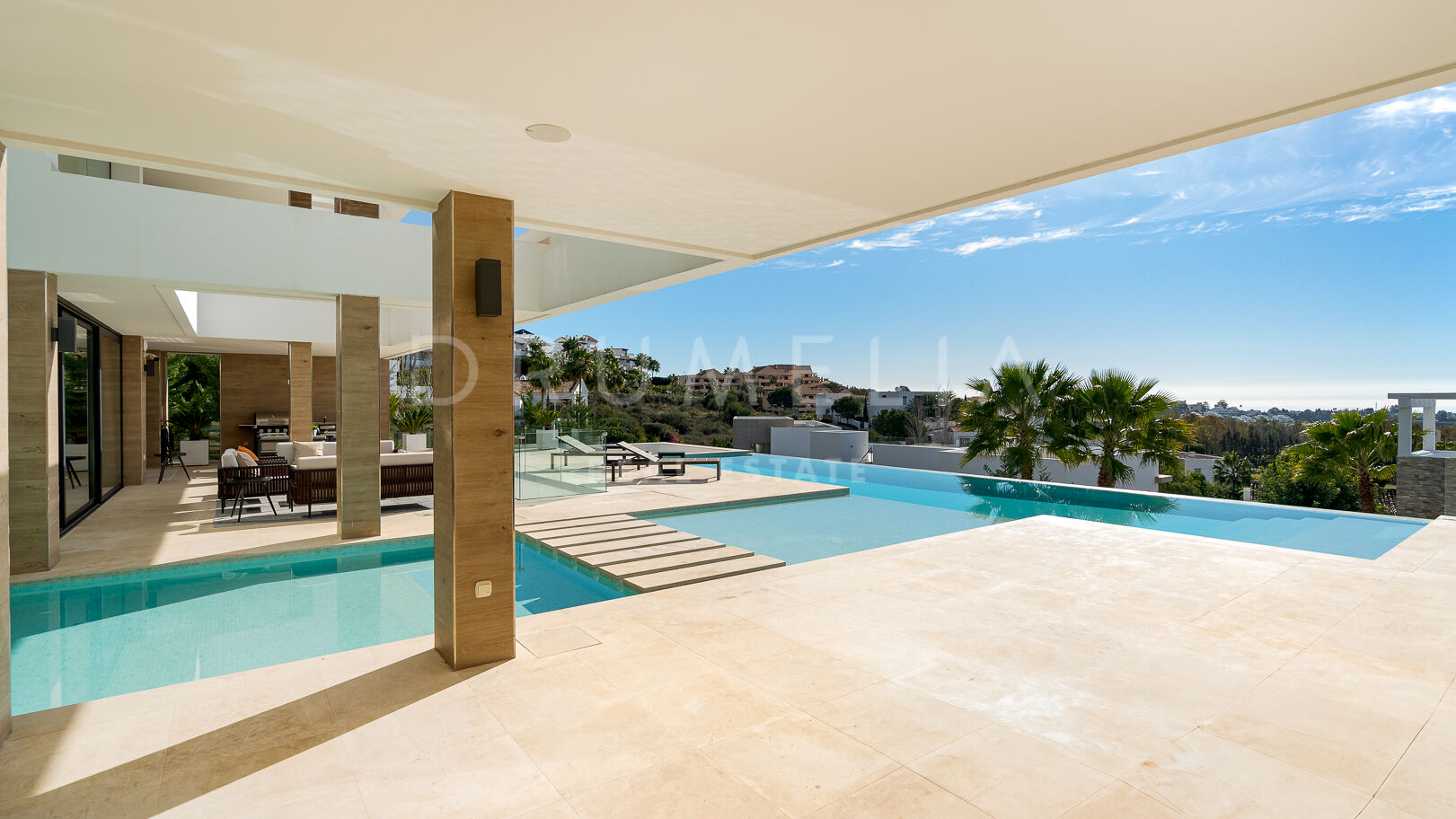 На трех уровнях виллы расположены пять спален с ванными комнатами, включая роскошную главную спальню с собственной террасой. Гостиная и столовая открытой планировки плавно переходят в просторные террасы, а кухня, оборудованная по последнему слову техники, оснащена бытовой техникой премиум-класса. Потрясающий бассейн-инфинити служит центром открытого пространства, дополненного стильной зоной отдыха и пышными садами – идеальное место для средиземноморского образа жизни.