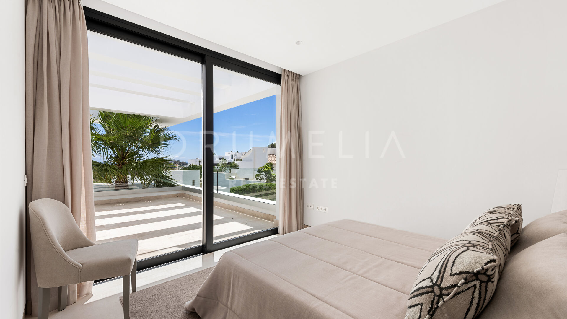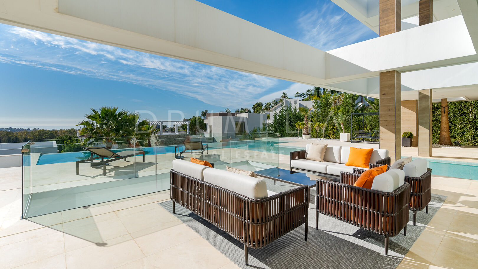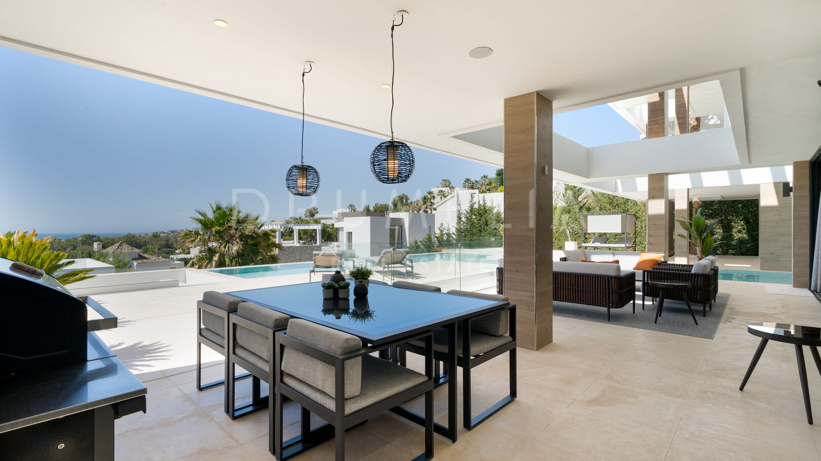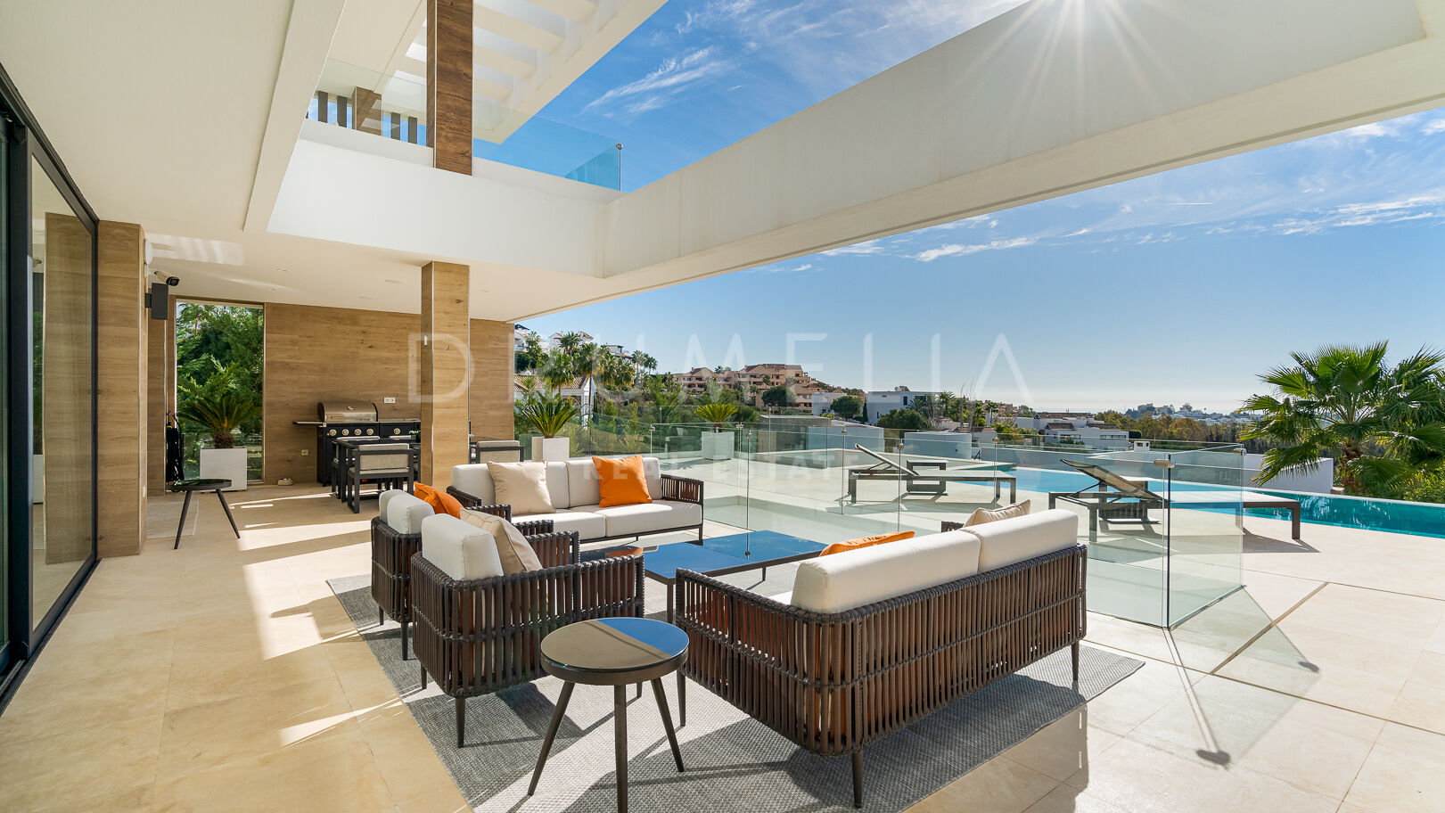 На трех уровнях виллы расположены пять спален с ванными комнатами, включая роскошную главную спальню с собственной террасой. Гостиная и столовая открытой планировки плавно переходят в просторные террасы, а кухня, оборудованная по последнему слову техники, оснащена бытовой техникой премиум-класса. Потрясающий бассейн-инфинити служит центром открытого пространства, дополненного стильной зоной отдыха и пышными садами – идеальное место для средиземноморского образа жизни.