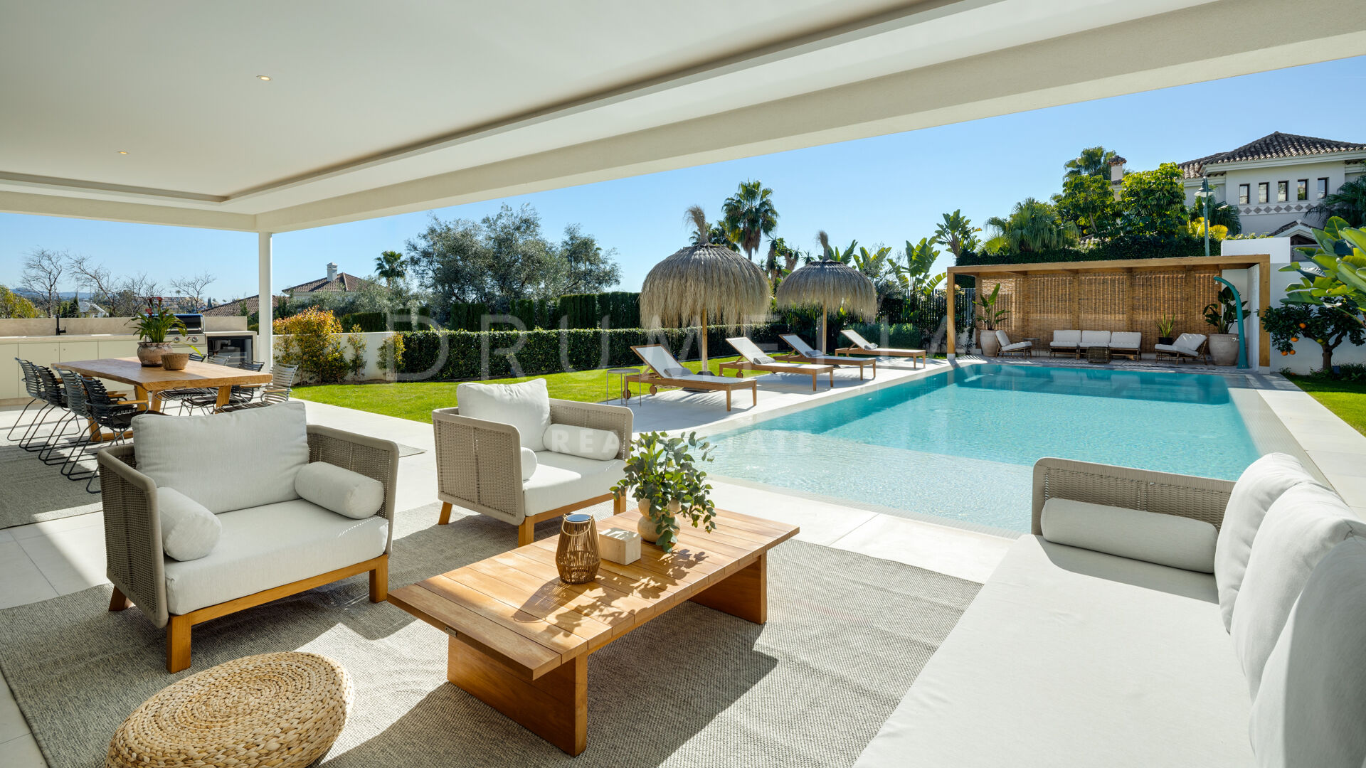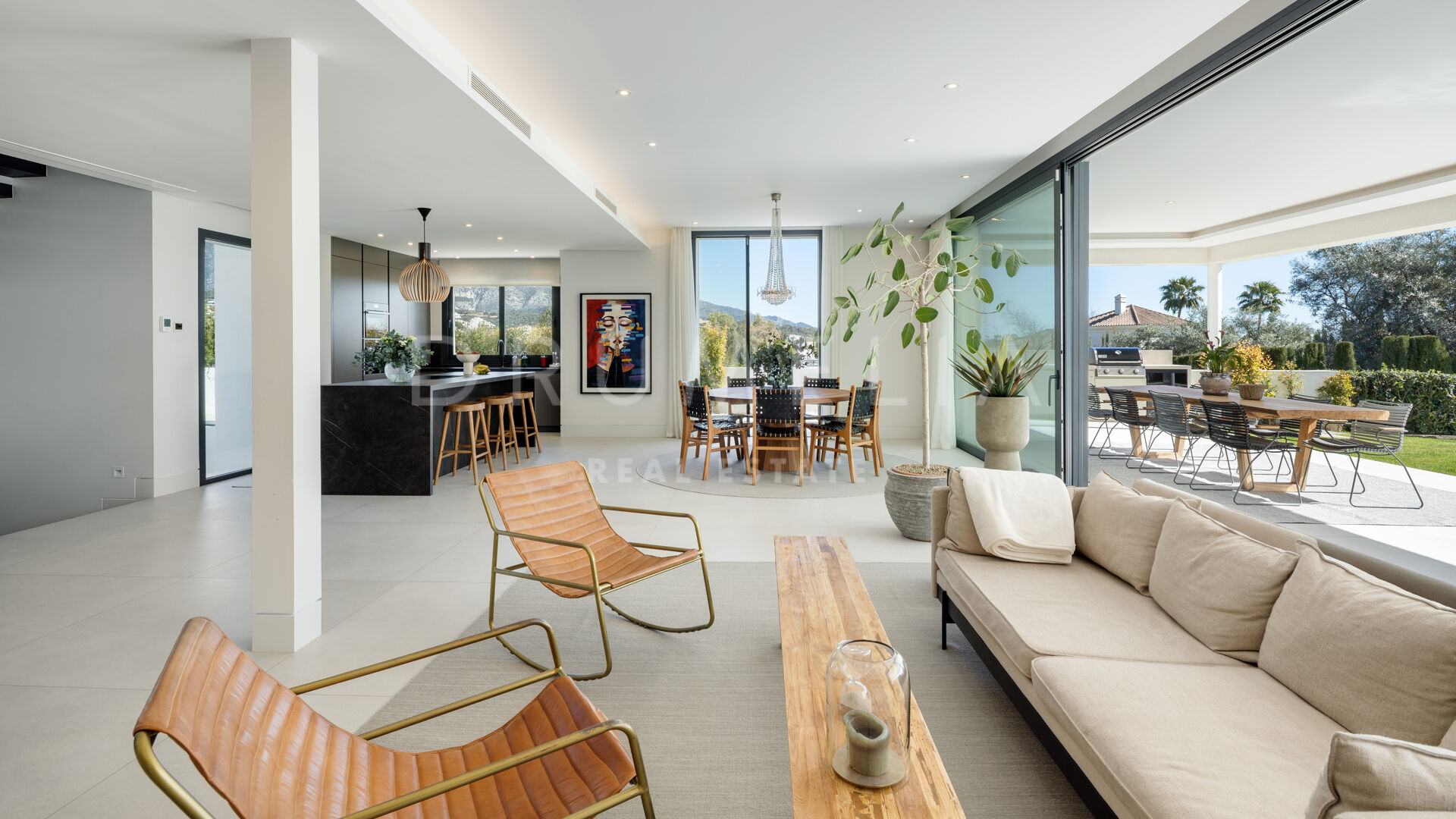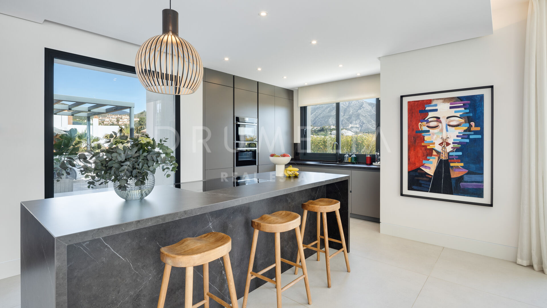 На основном уровне находится открытая зона гостиной и столовой с современной кухней и центральным островом. На террасах предусмотрено много места для отдыха и приёма пищи на свежем воздухе: частный бассейн, тенистая пергола и встроенный барбекю создают идеальные условия для круглогодичного наслаждения жизнью на открытом воздухе.