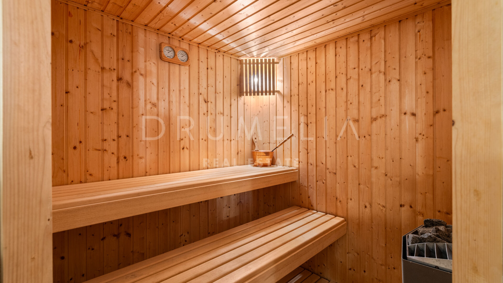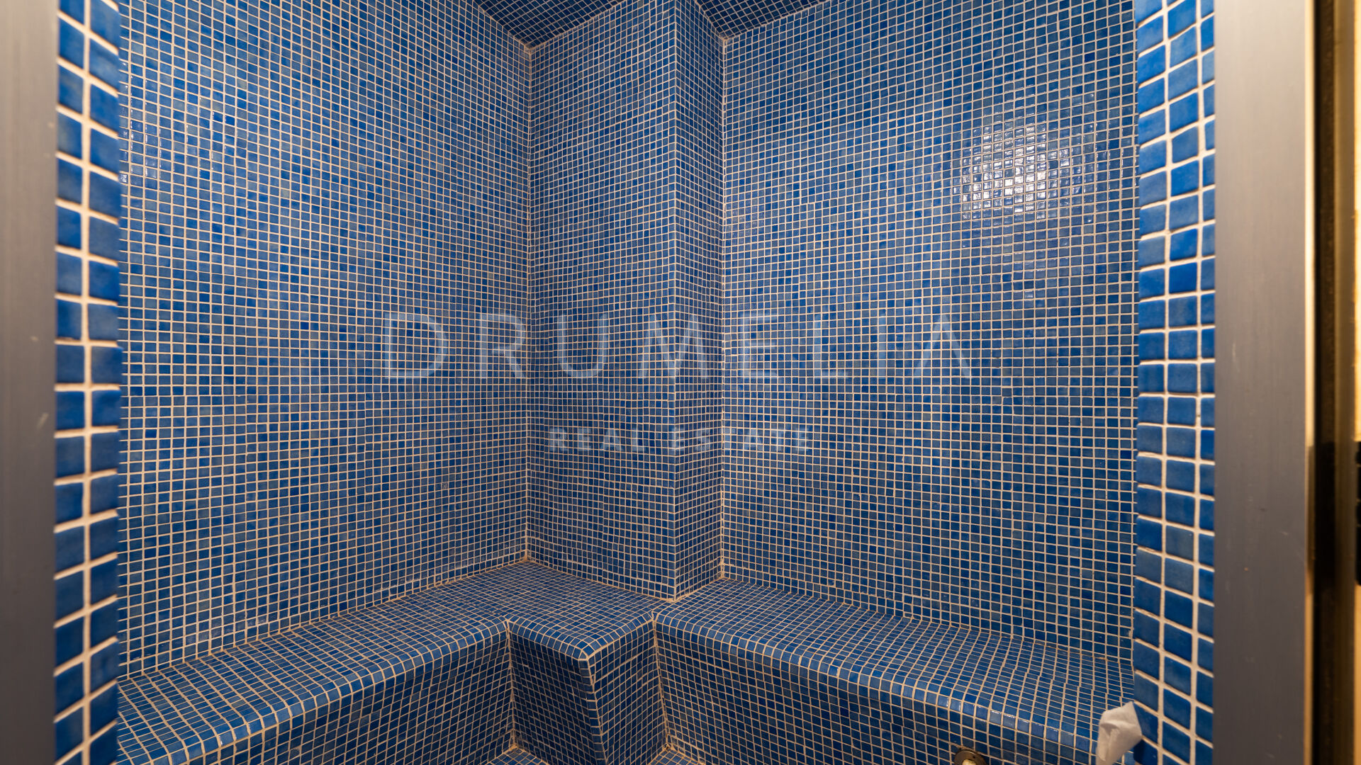 Зона wellness включает сауну, хаммам и тренажерный зал. На нижнем уровне расположен частный гараж. Интерьеры сочетают тёплые материалы, сбалансированные пропорции и большие арочные окна с видом на окружающий пейзаж.