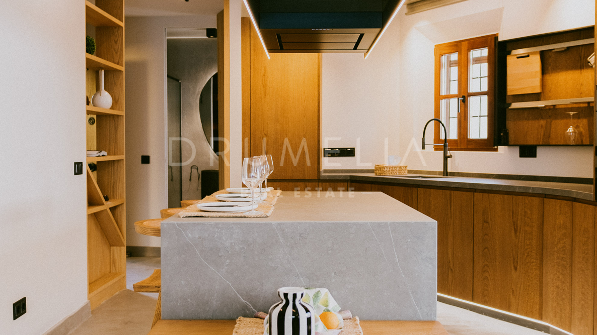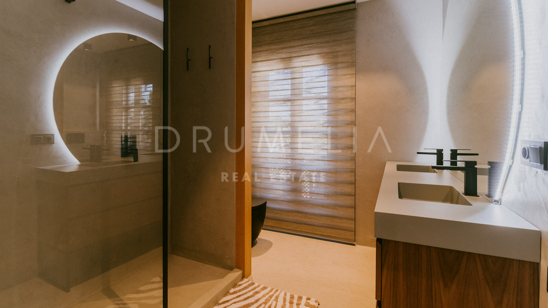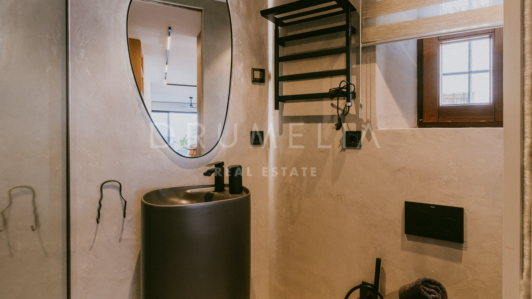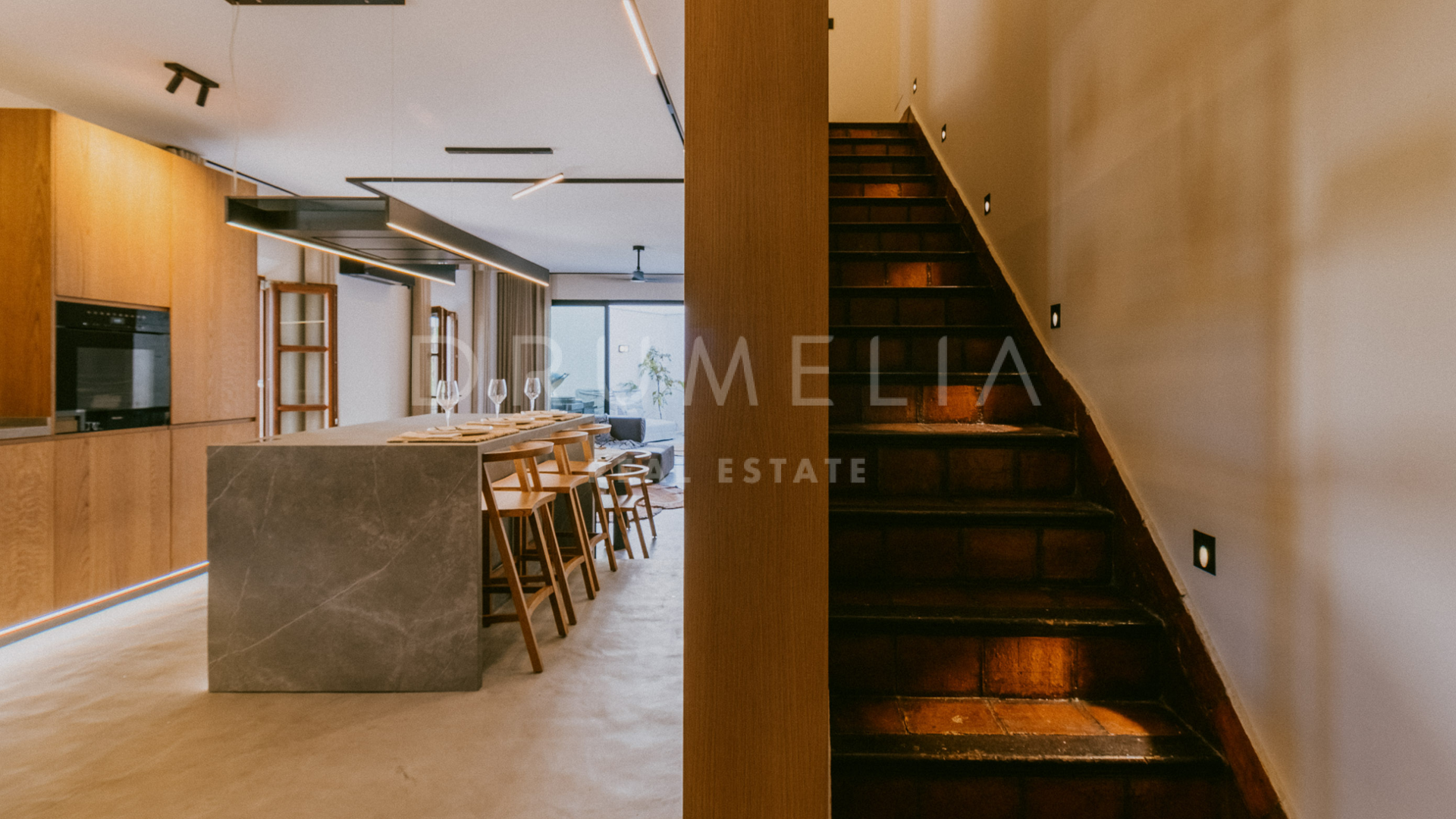 На первом этаже находится элегантное пространство открытой планировки с гостиной и столовой, наполненное естественным светом и дополненное дровяным камином. Большие стеклянные двери ведут на частный андалузский патио, идеально подходящий для отдыха на свежем воздухе. Современная кухня оснащена техникой высокого класса и стильными поверхностями, отражающими качество ремонта.