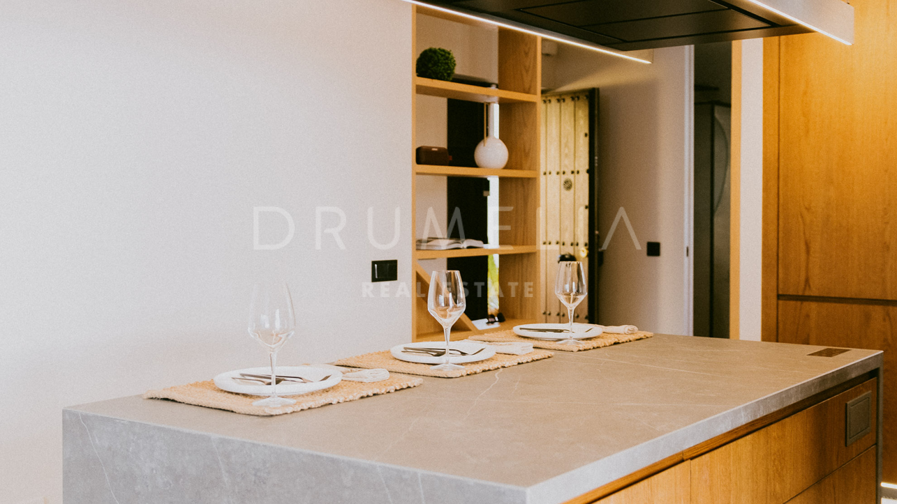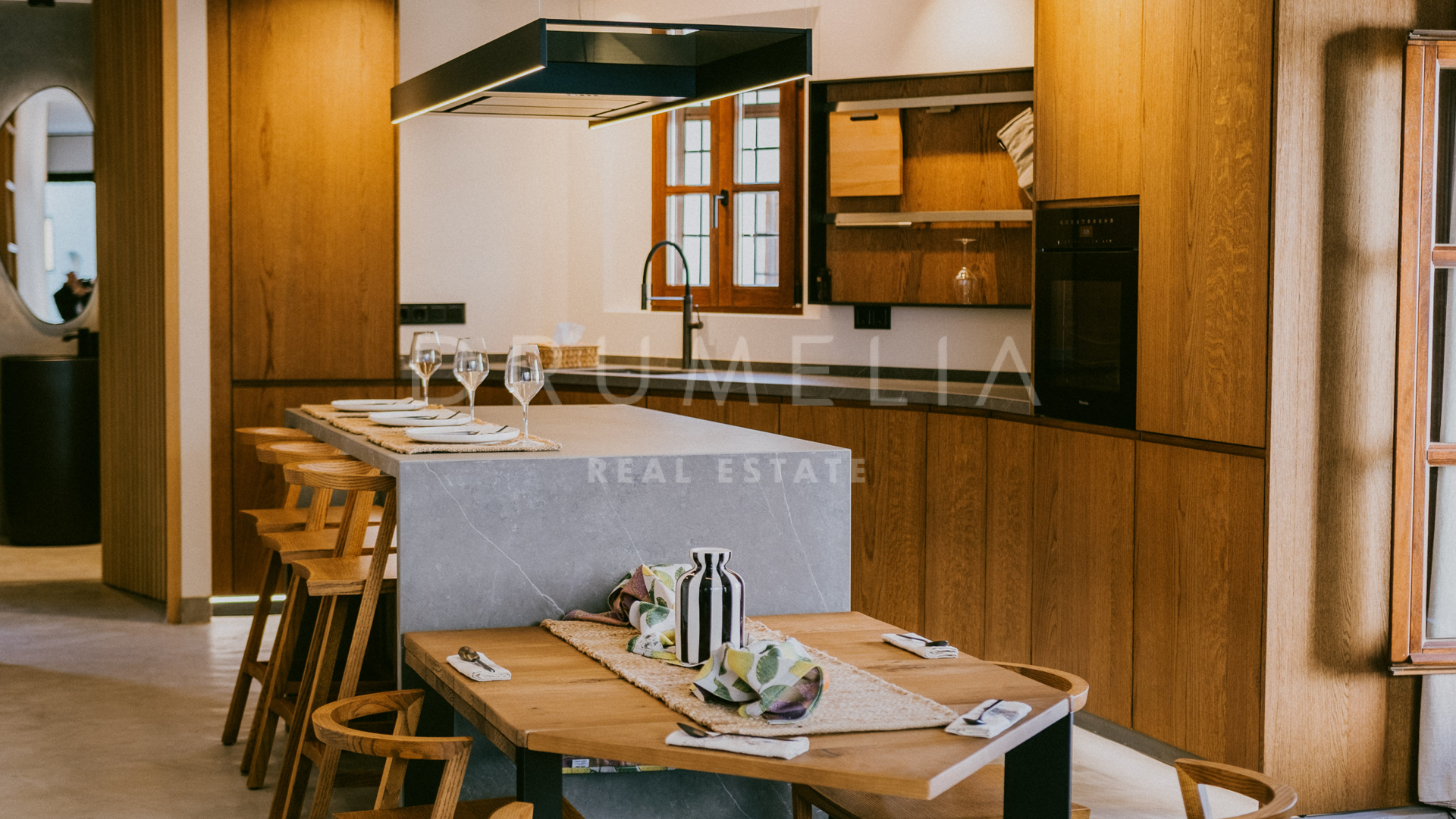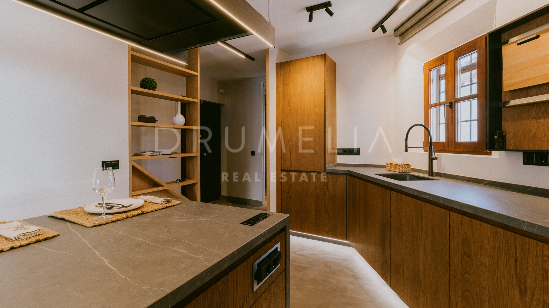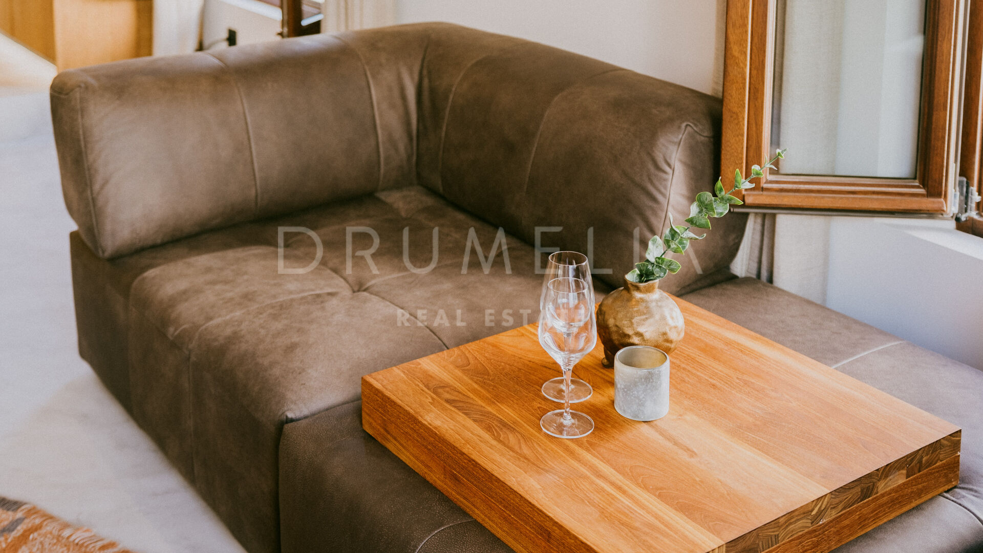 На первом этаже находится элегантное пространство открытой планировки с гостиной и столовой, наполненное естественным светом и дополненное дровяным камином. Большие стеклянные двери ведут на частный андалузский патио, идеально подходящий для отдыха на свежем воздухе. Современная кухня оснащена техникой высокого класса и стильными поверхностями, отражающими качество ремонта.