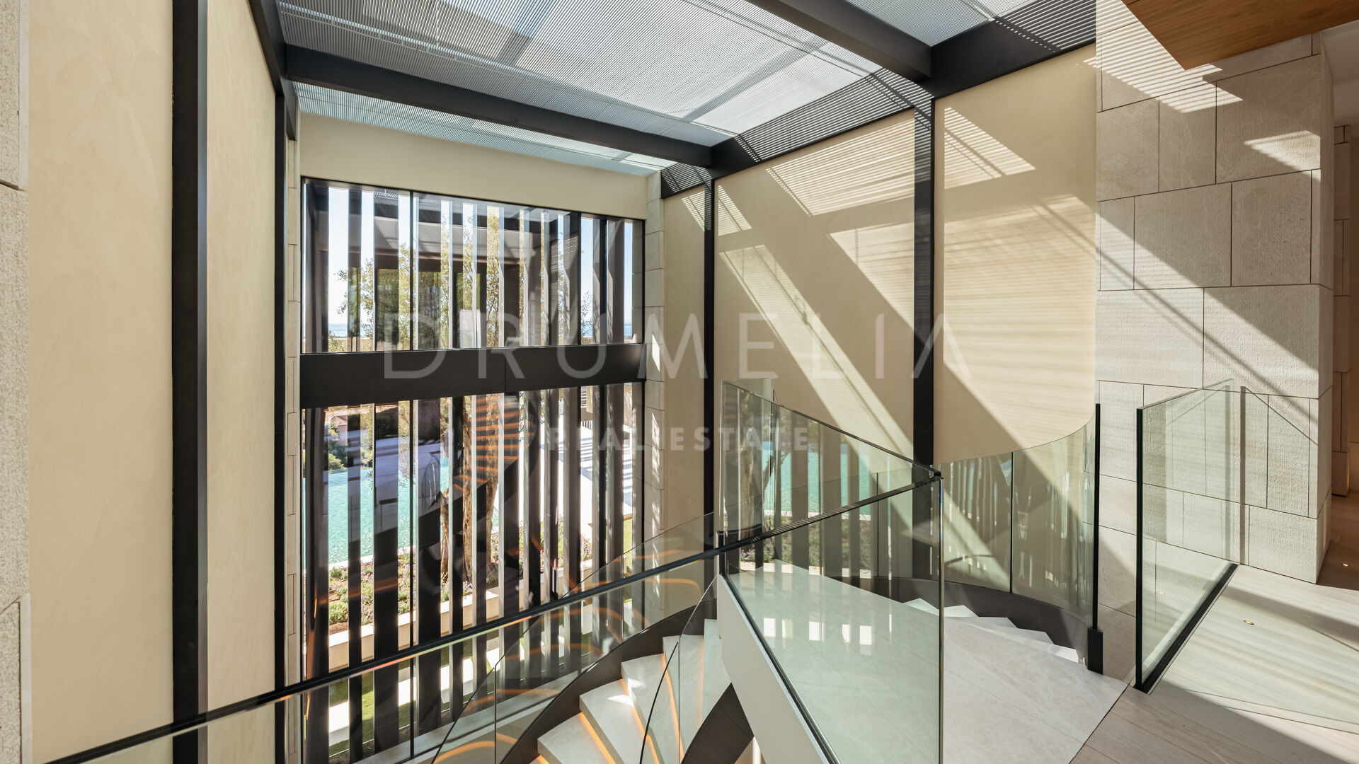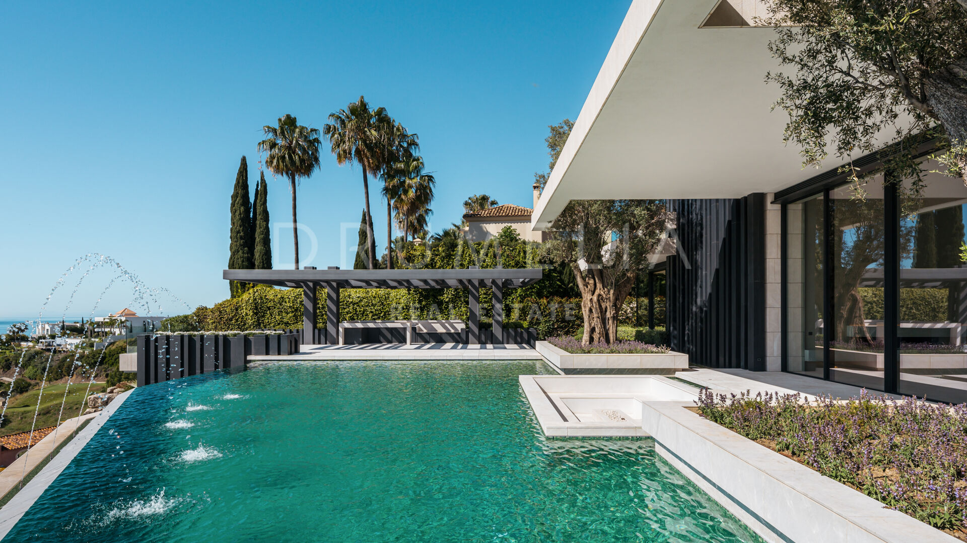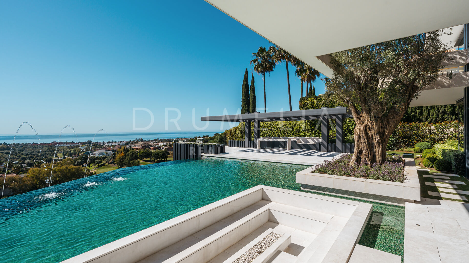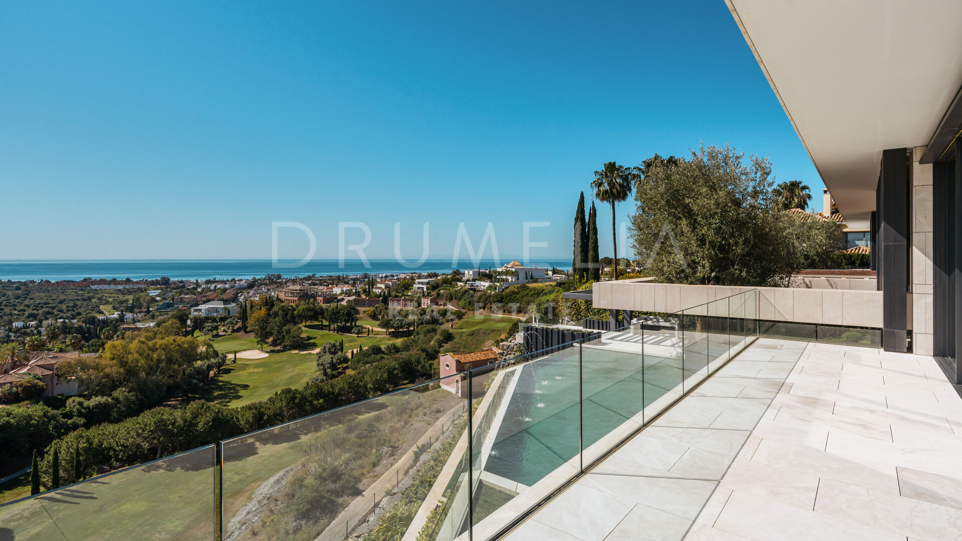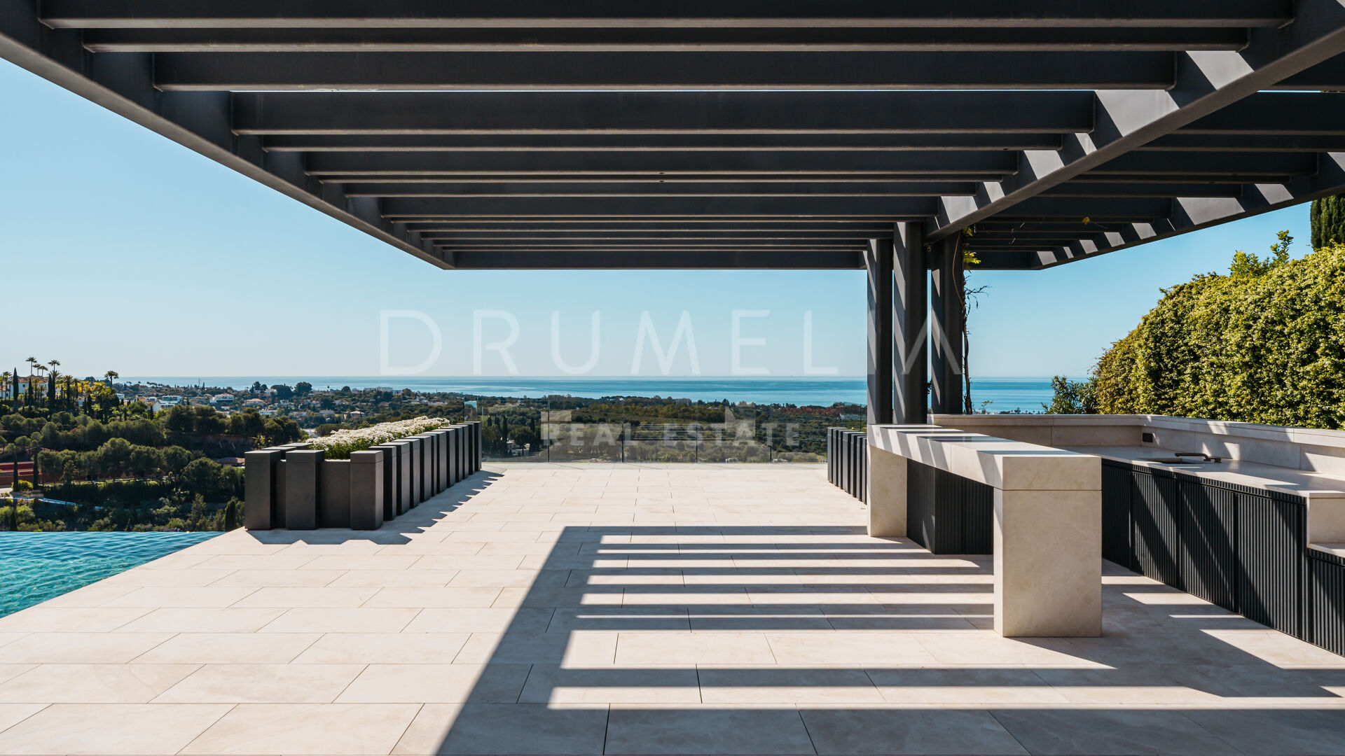 Широкие окна от пола до потолка и стеклянные двери выходят на террасы площадью 683 кв. м, с которых открываются потрясающие виды на побережье и поля для гольфа. Этот элитный дом приглашает насладиться жизнью на свежем воздухе: современный бассейн с водной гладью и видом на Средиземное море, солярий, обширные террасы вокруг бассейна, открытый камин и великолепная металлическая беседка с баром и барбекю.