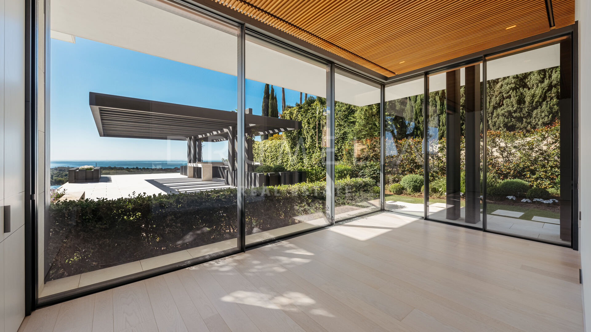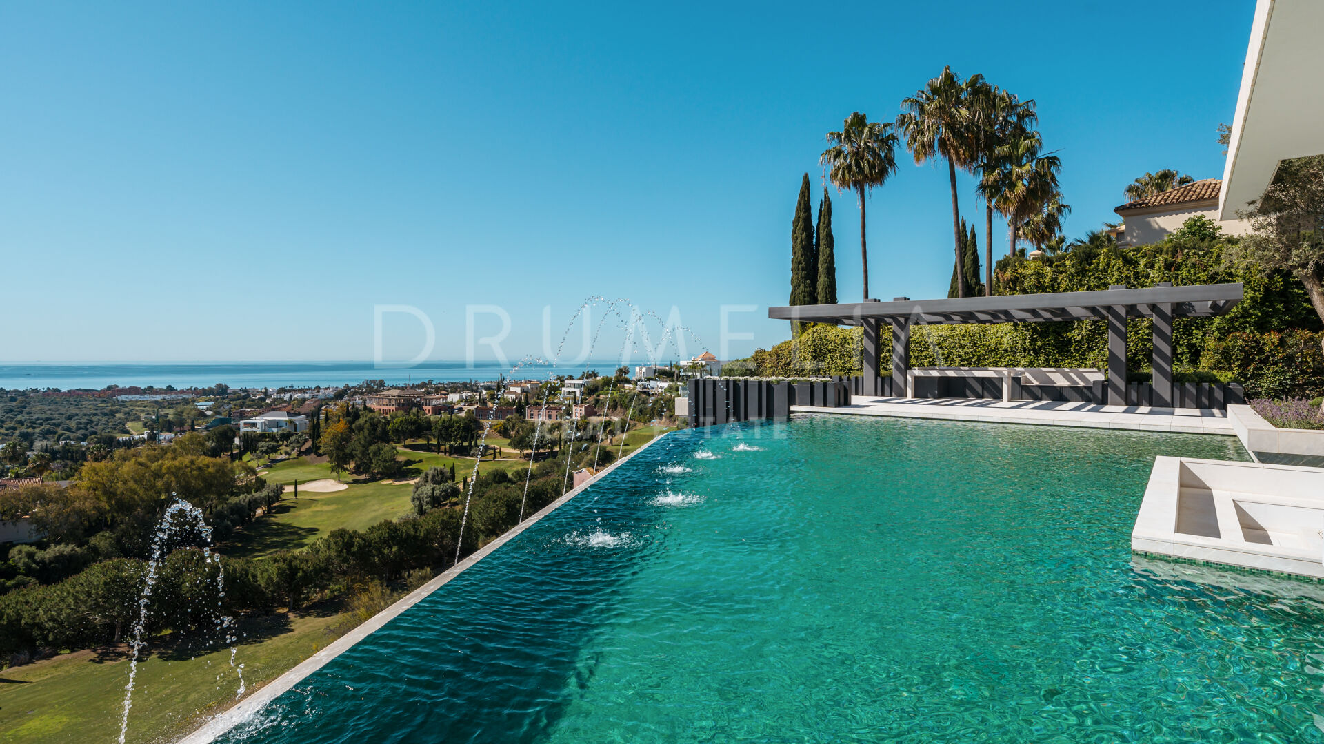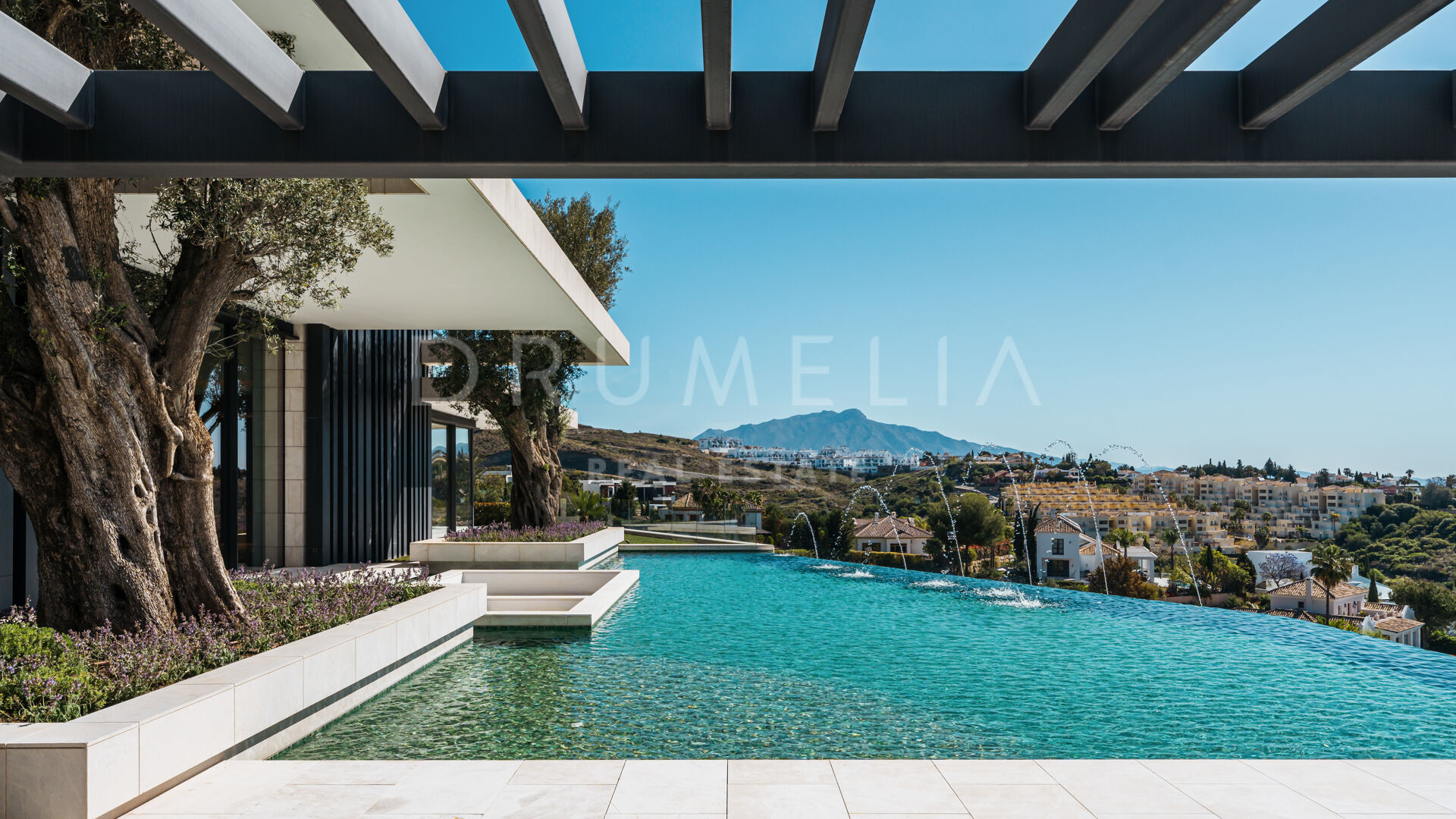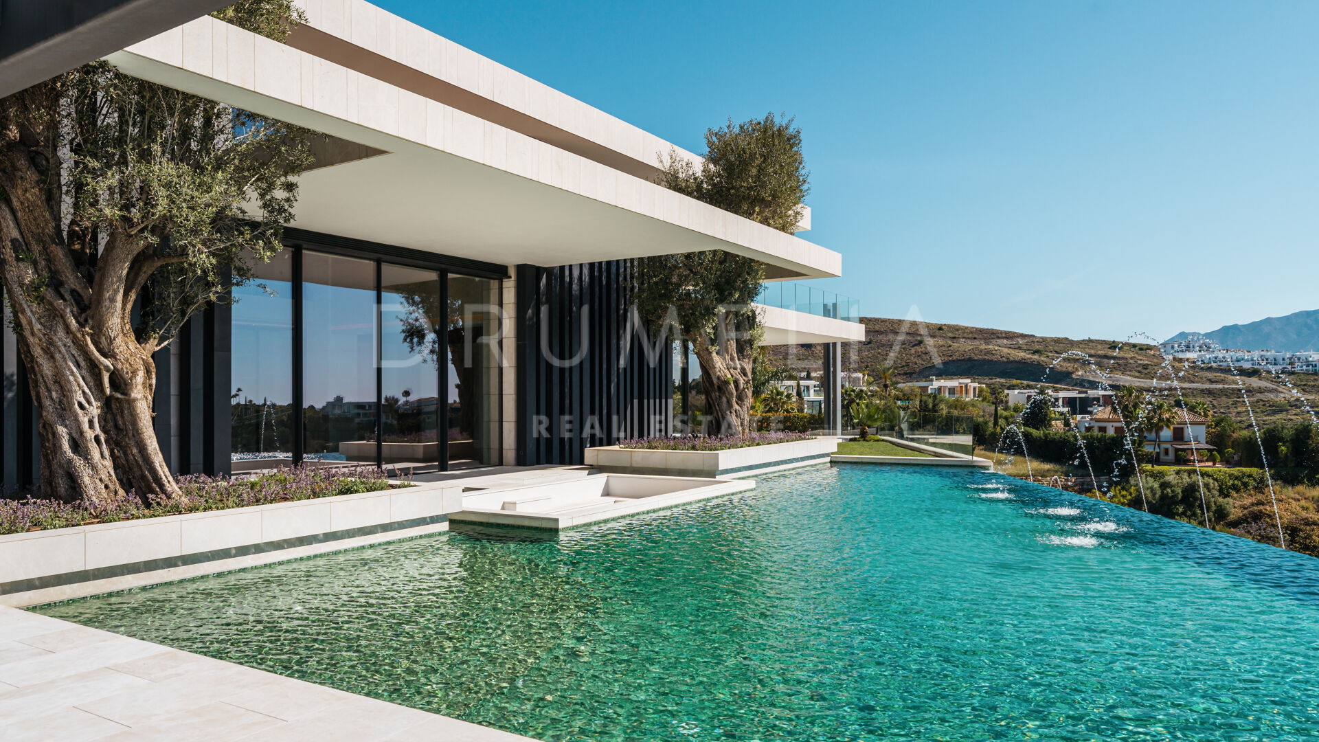 Широкие окна от пола до потолка и стеклянные двери выходят на террасы площадью 683 кв. м, с которых открываются потрясающие виды на побережье и поля для гольфа. Этот элитный дом приглашает насладиться жизнью на свежем воздухе: современный бассейн с водной гладью и видом на Средиземное море, солярий, обширные террасы вокруг бассейна, открытый камин и великолепная металлическая беседка с баром и барбекю.