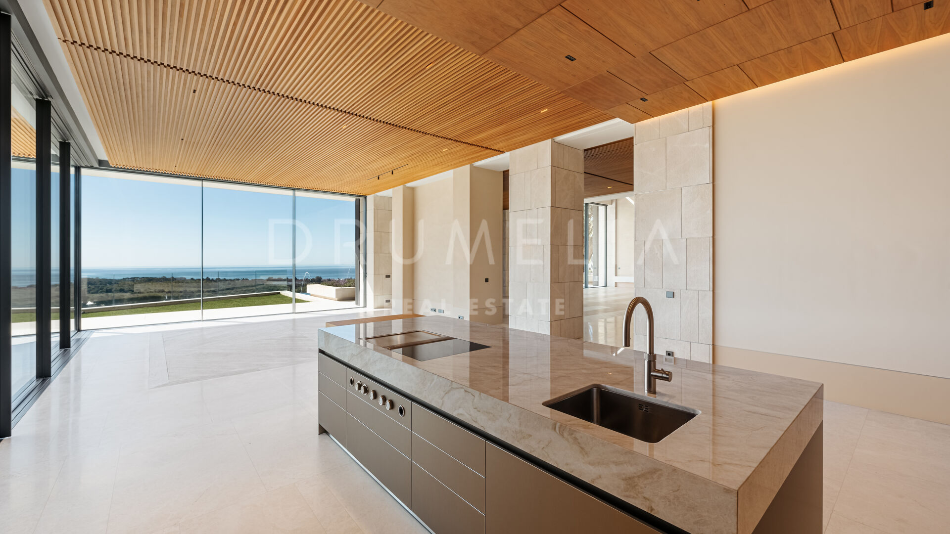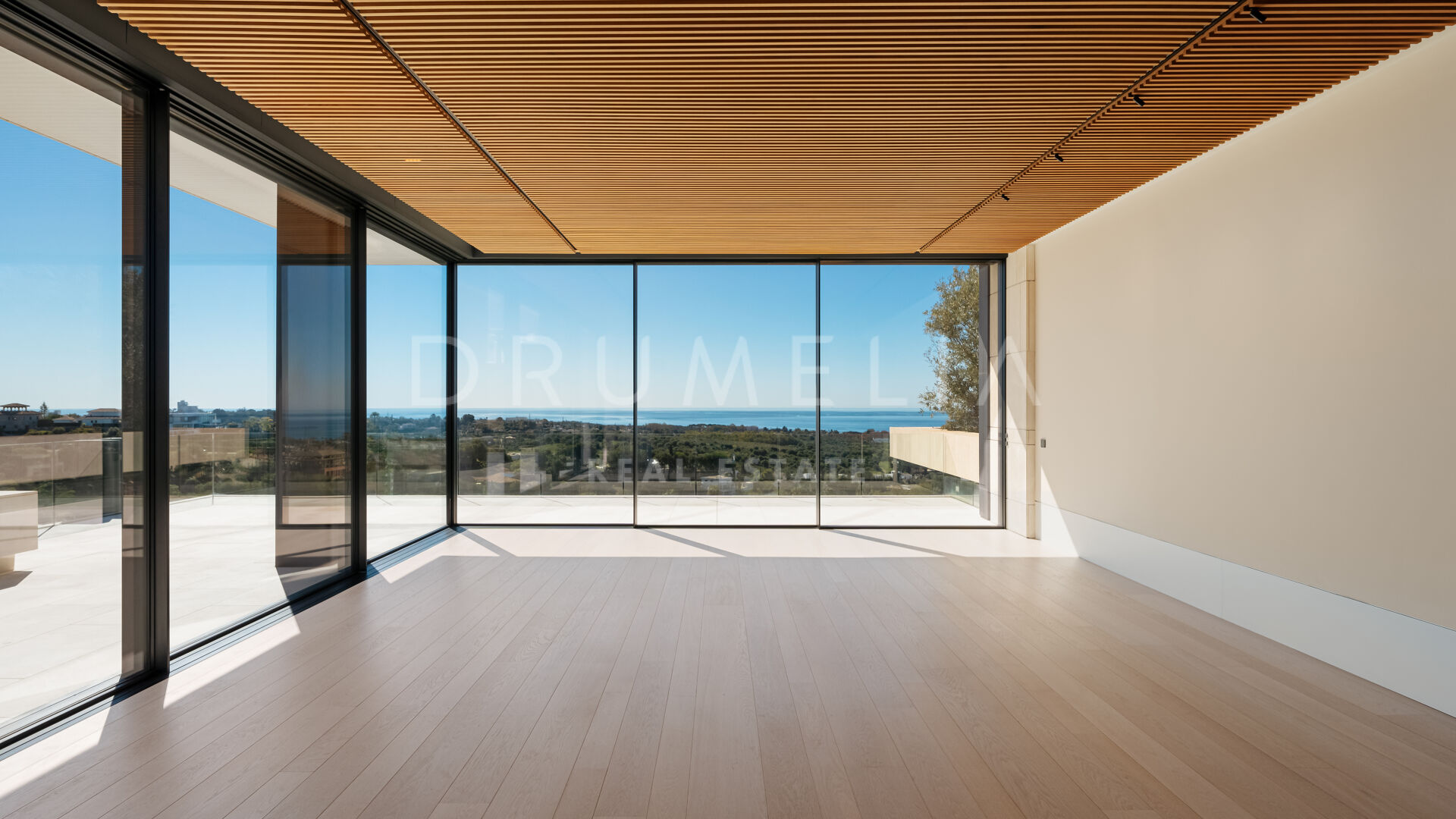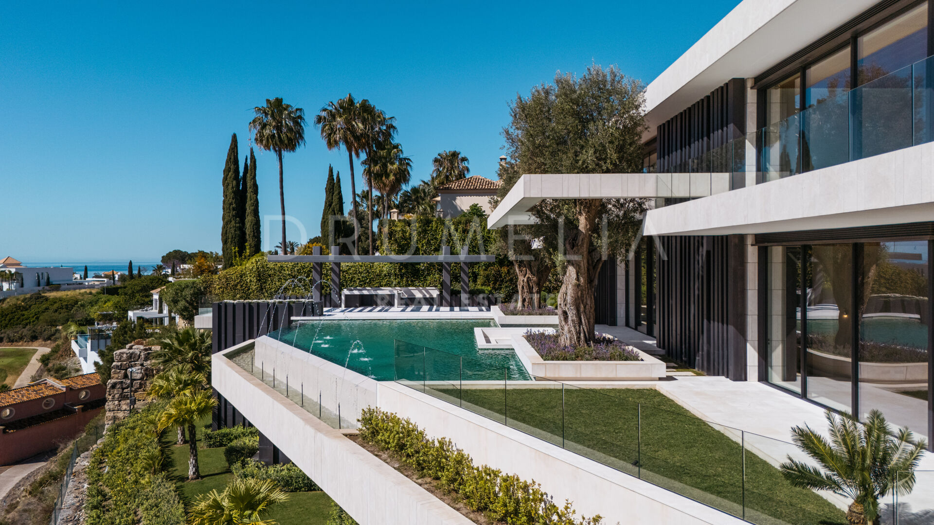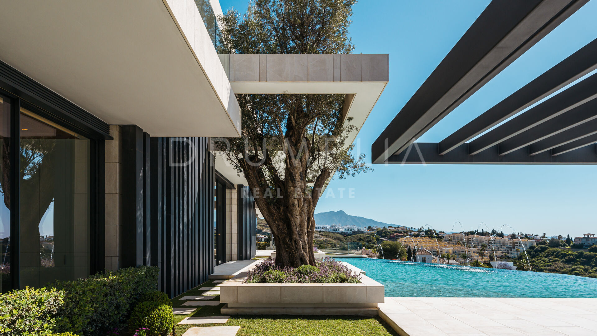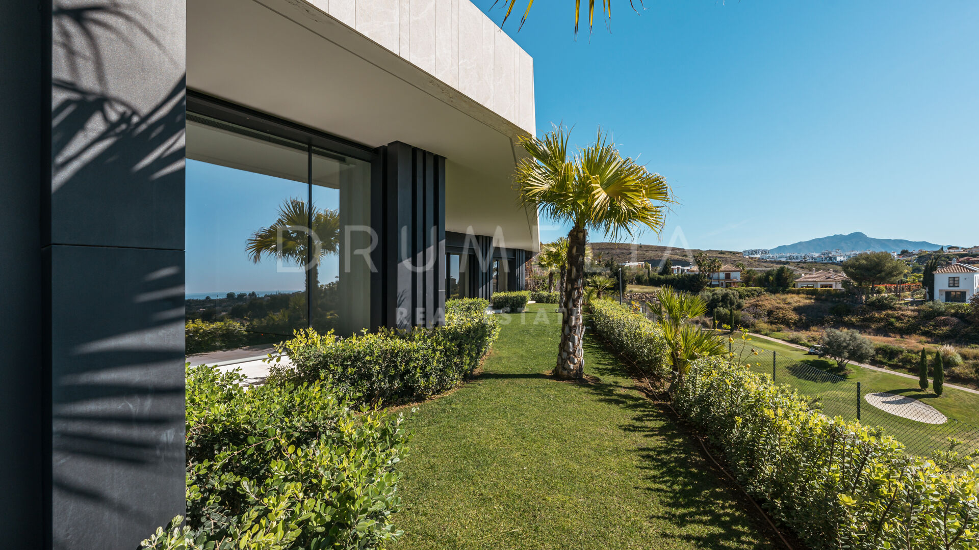Широкие окна от пола до потолка и стеклянные двери выходят на террасы площадью 683 кв. м, с которых открываются потрясающие виды на побережье и поля для гольфа. Этот элитный дом приглашает насладиться жизнью на свежем воздухе: современный бассейн с водной гладью и видом на Средиземное море, солярий, обширные террасы вокруг бассейна, открытый камин и великолепная металлическая беседка с баром и барбекю.
