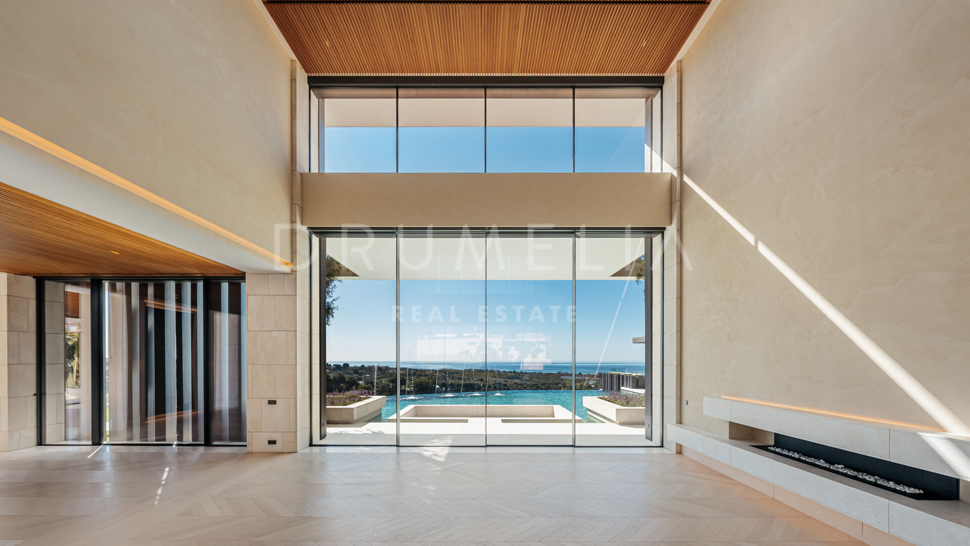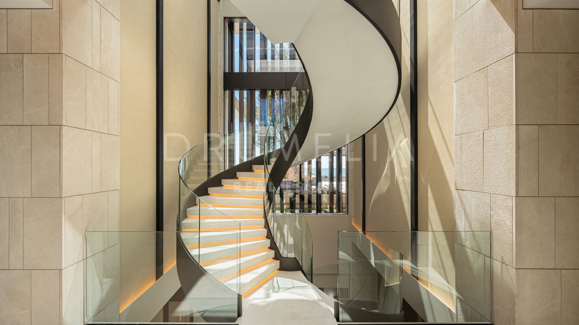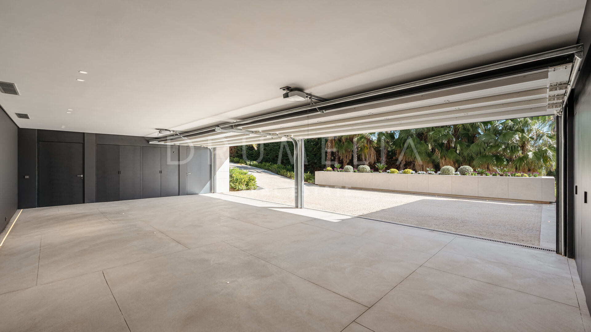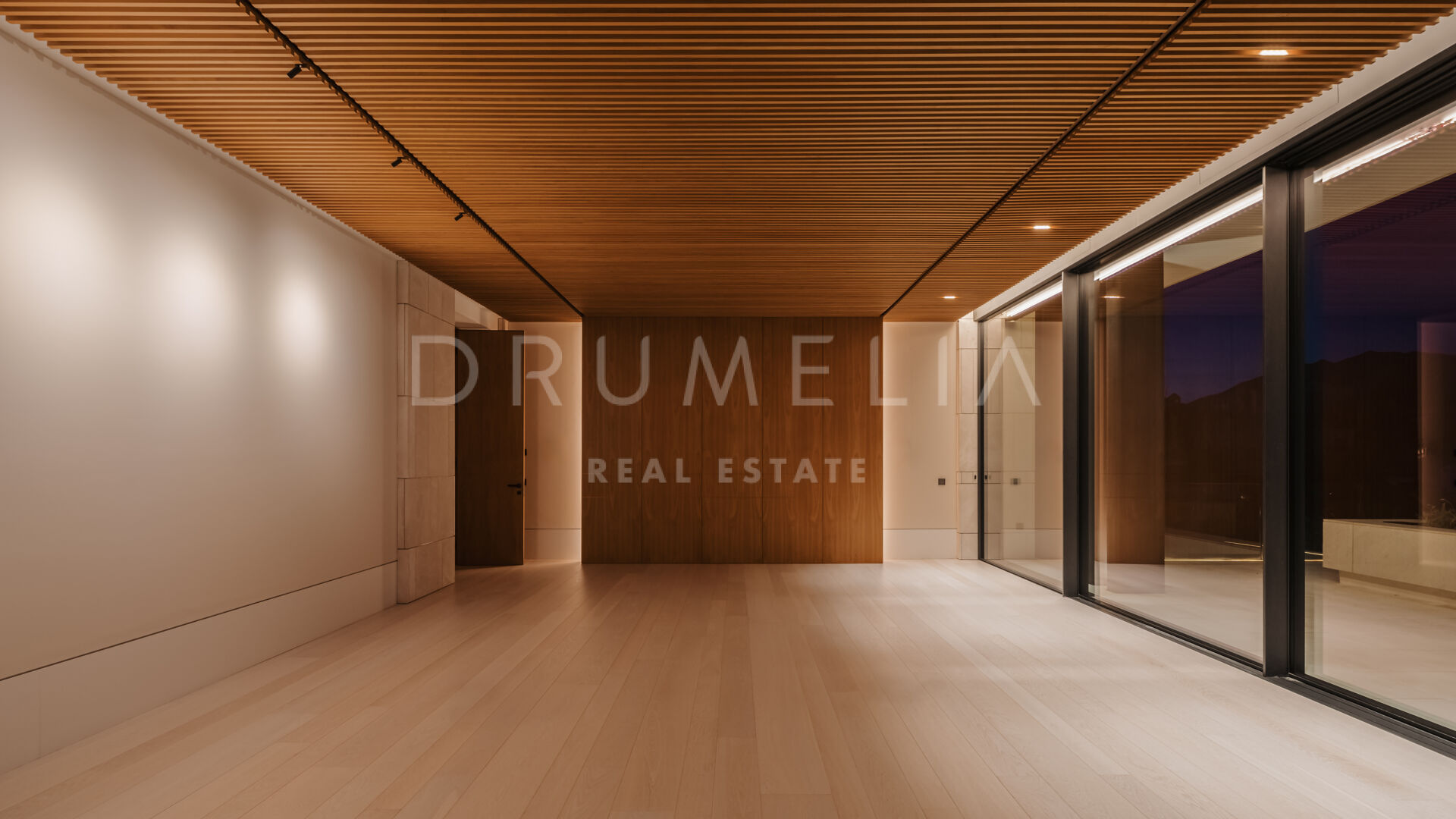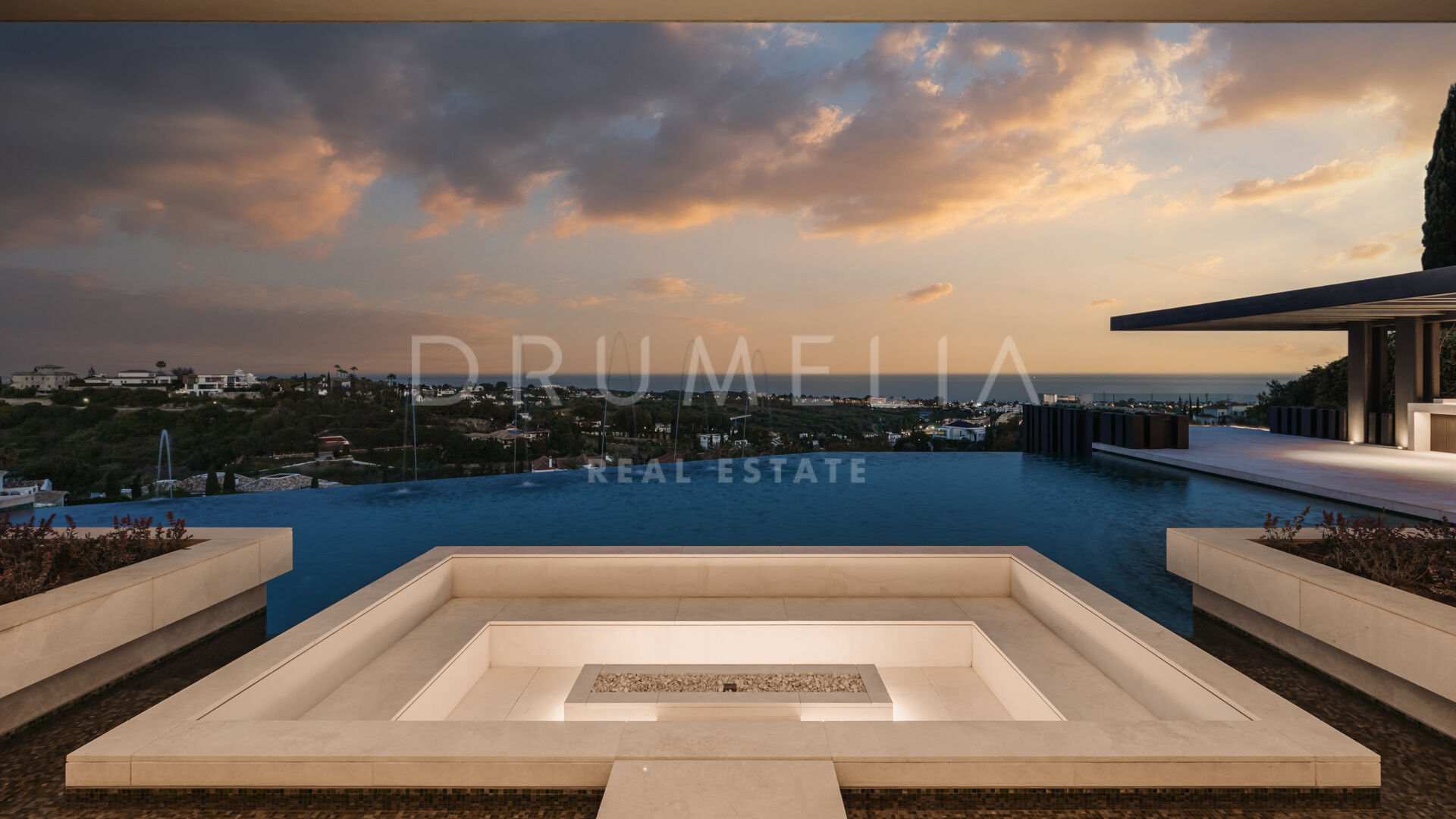 Широкие окна от пола до потолка и стеклянные двери выходят на террасы площадью 683 кв. м, с которых открываются потрясающие виды на побережье и поля для гольфа. Этот элитный дом приглашает насладиться жизнью на свежем воздухе: современный бассейн с водной гладью и видом на Средиземное море, солярий, обширные террасы вокруг бассейна, открытый камин и великолепная металлическая беседка с баром и барбекю.