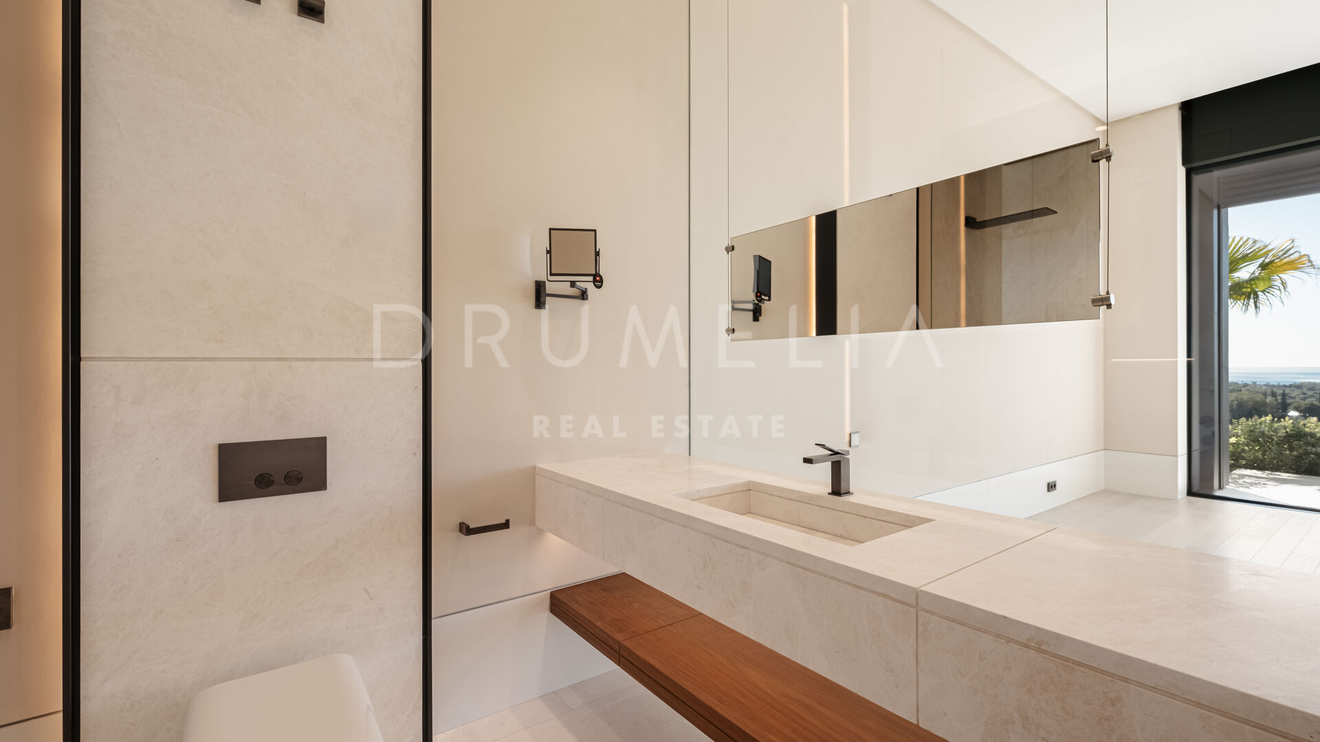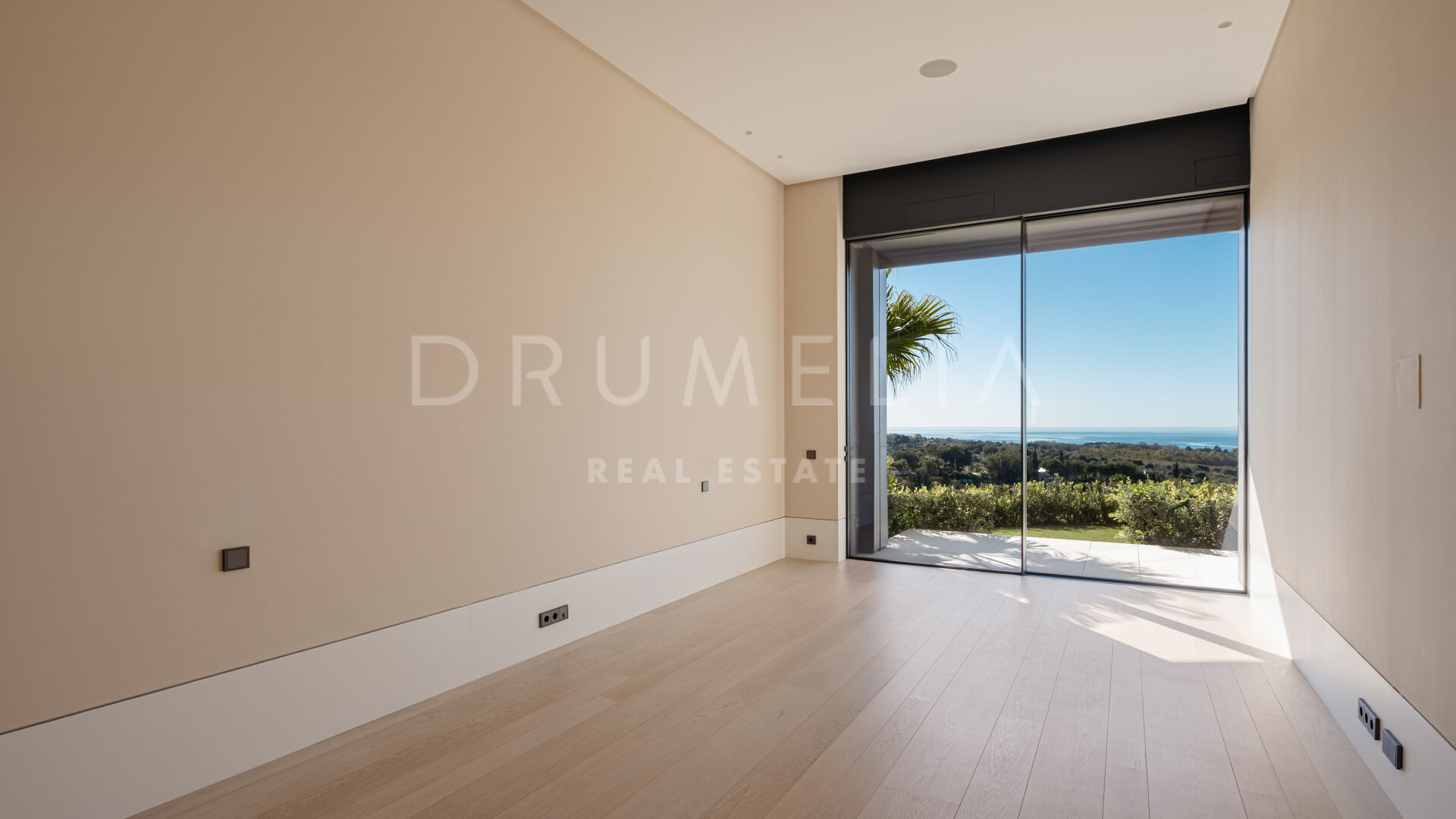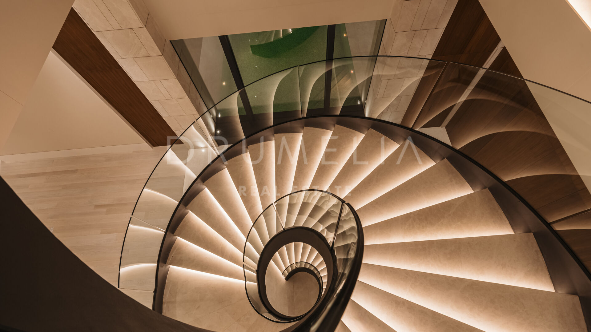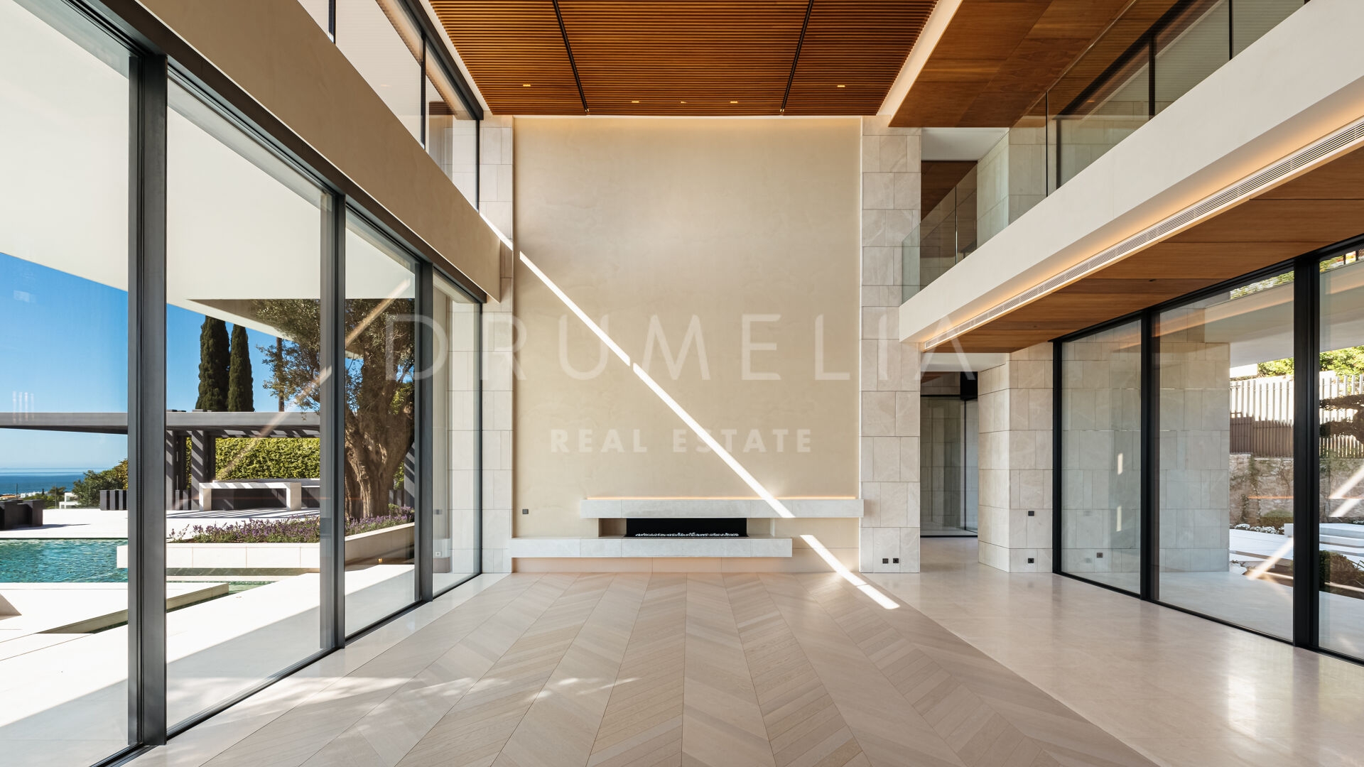 Широкие окна от пола до потолка и стеклянные двери выходят на террасы площадью 683 кв. м, с которых открываются потрясающие виды на побережье и поля для гольфа. Этот элитный дом приглашает насладиться жизнью на свежем воздухе: современный бассейн с водной гладью и видом на Средиземное море, солярий, обширные террасы вокруг бассейна, открытый камин и великолепная металлическая беседка с баром и барбекю.