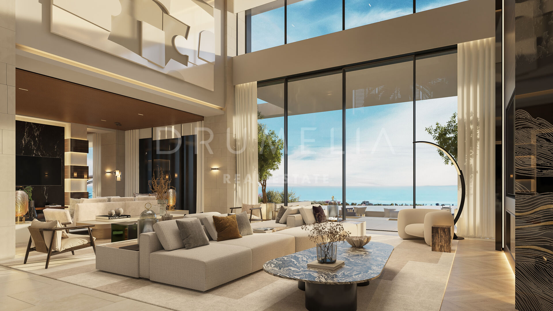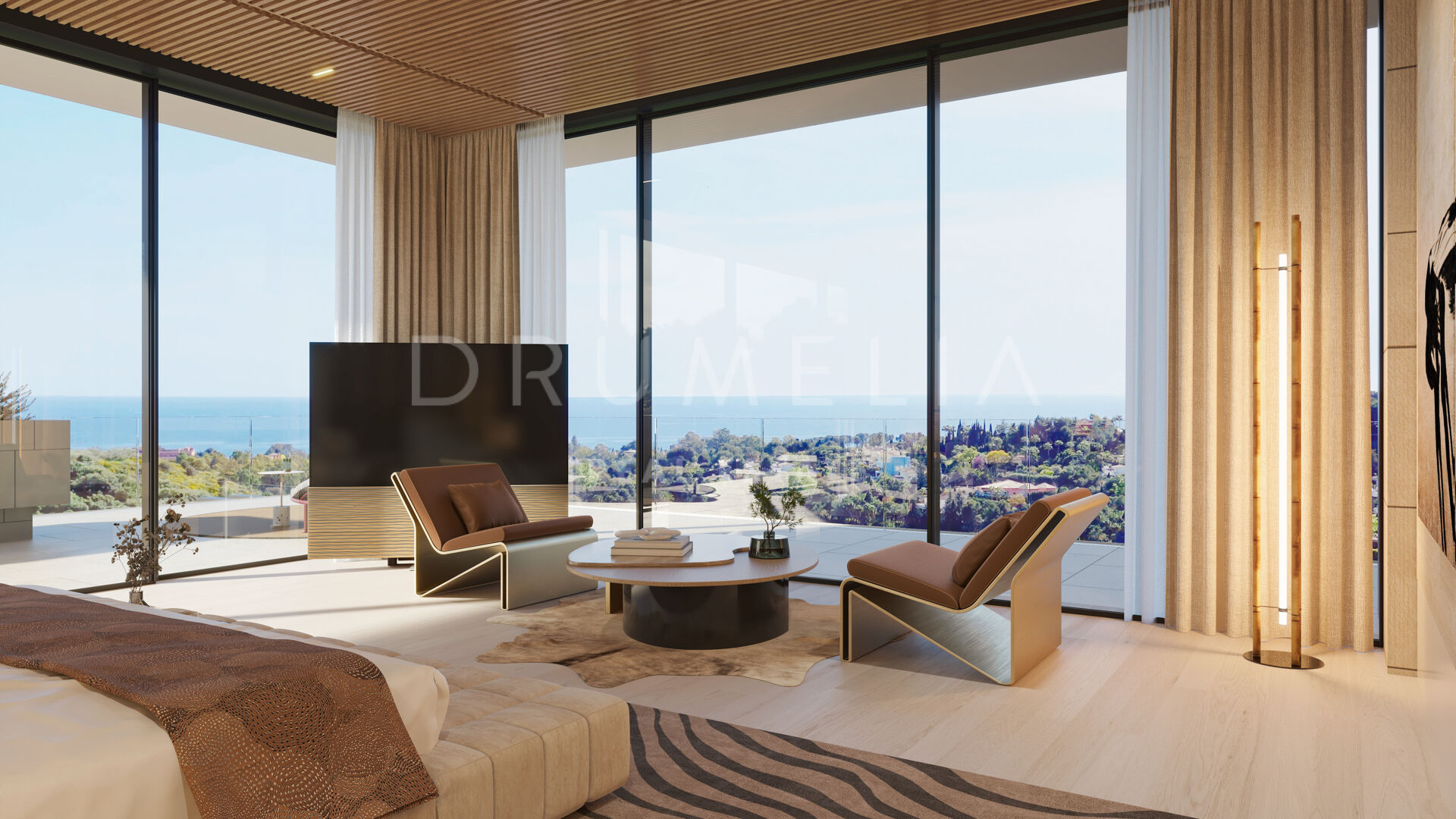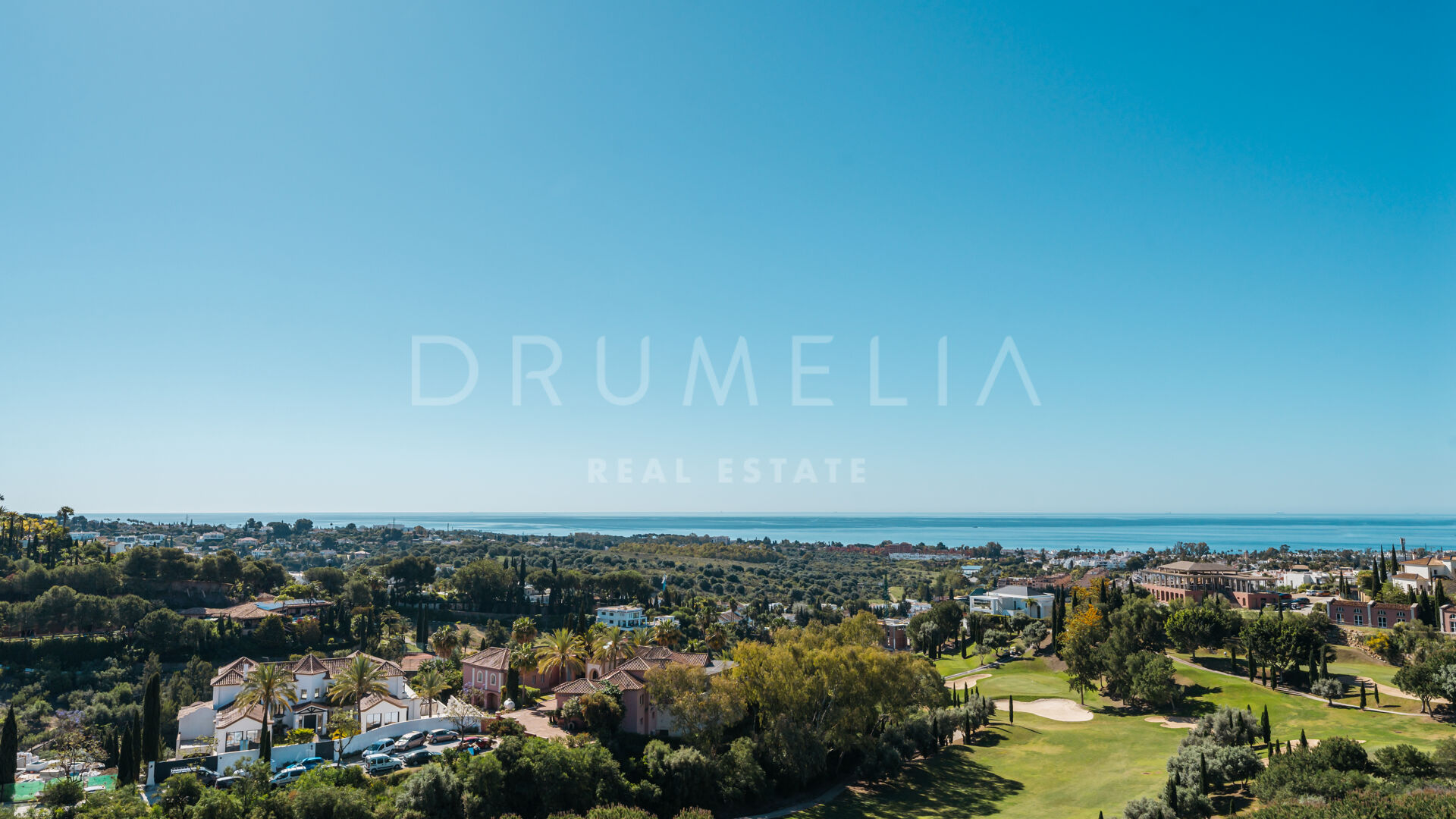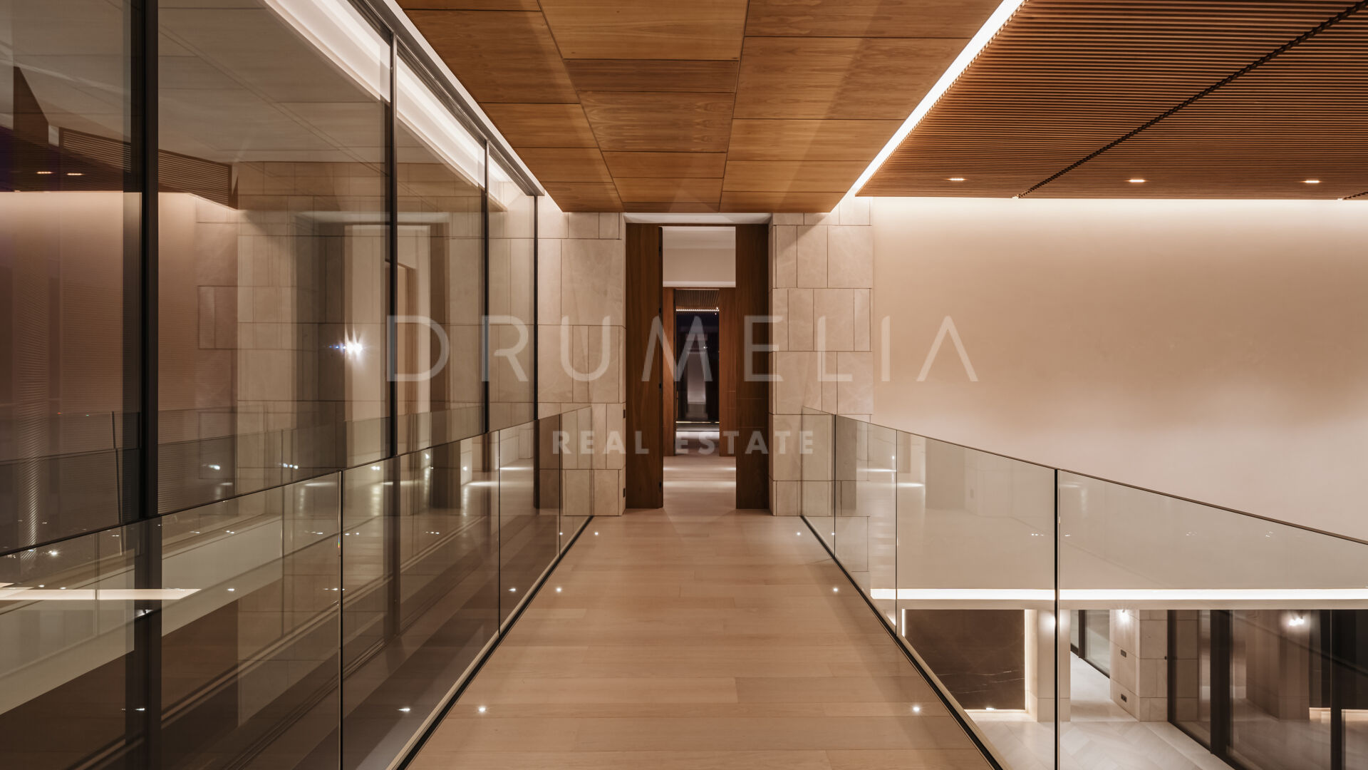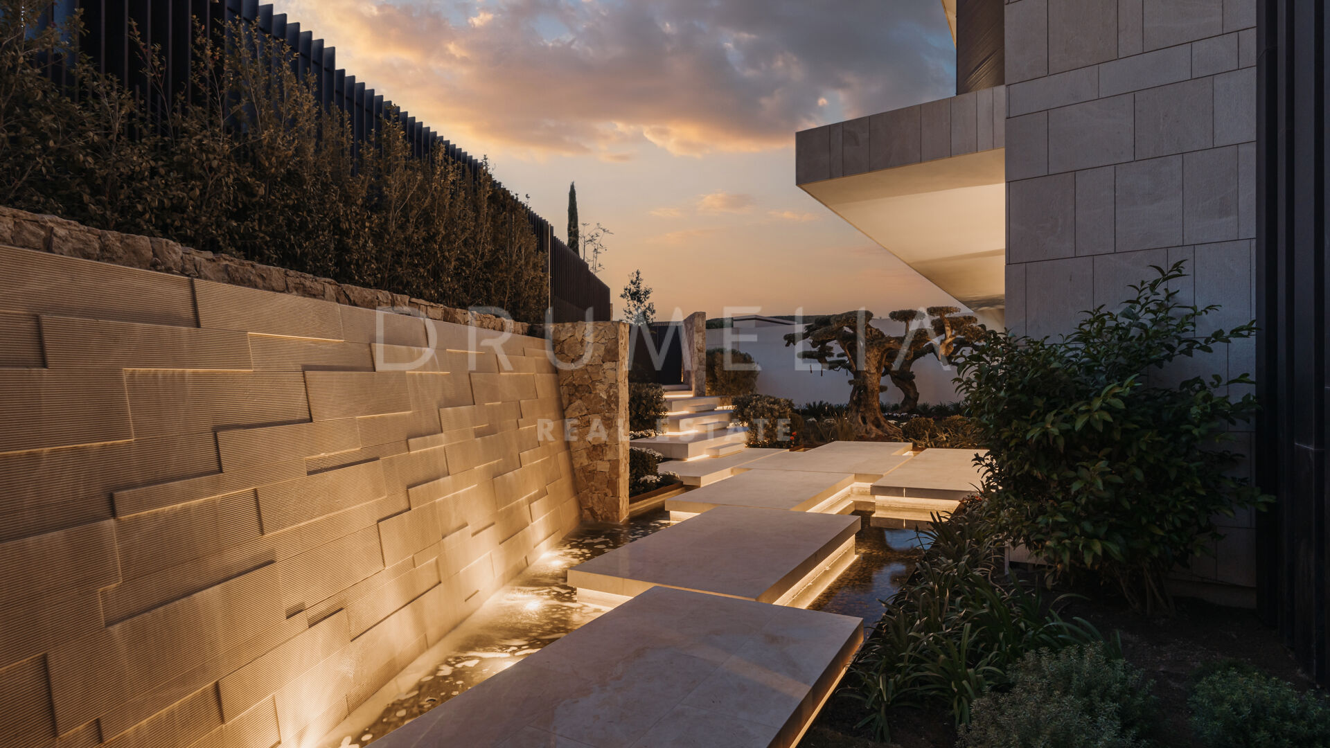 Широкие окна от пола до потолка и стеклянные двери выходят на террасы площадью 683 кв. м, с которых открываются потрясающие виды на побережье и поля для гольфа. Этот элитный дом приглашает насладиться жизнью на свежем воздухе: современный бассейн с водной гладью и видом на Средиземное море, солярий, обширные террасы вокруг бассейна, открытый камин и великолепная металлическая беседка с баром и барбекю.