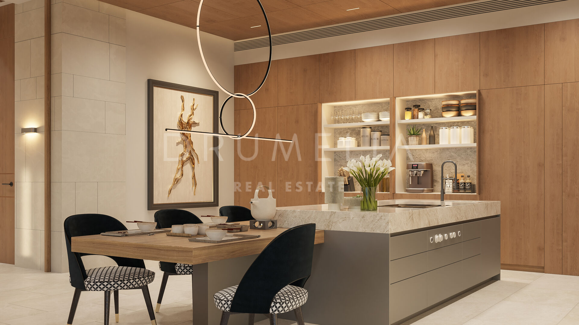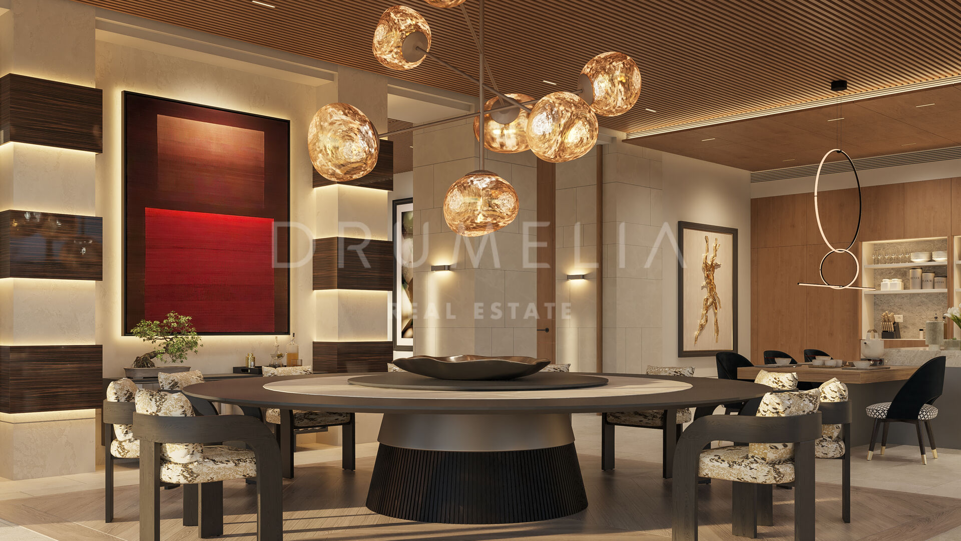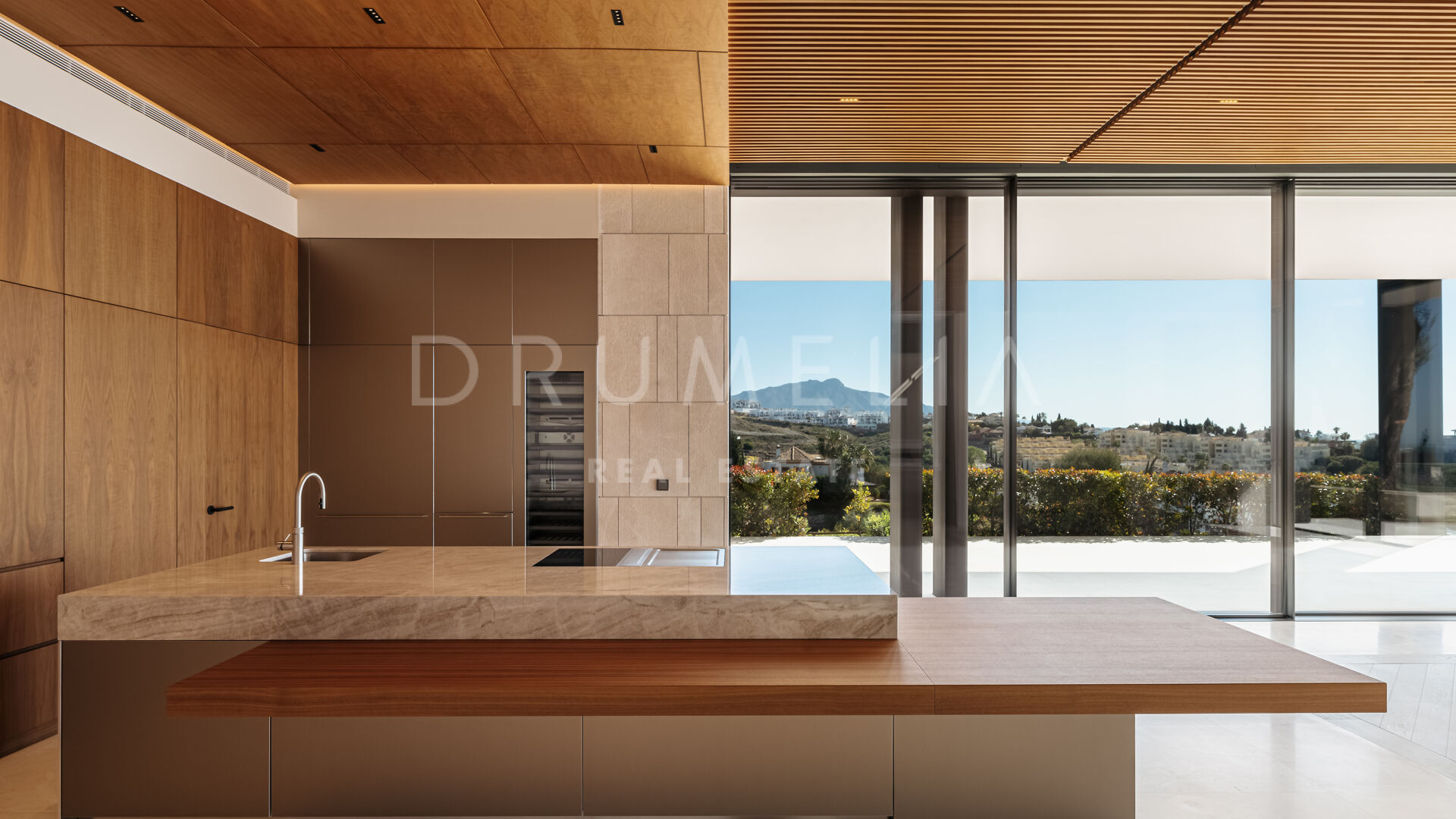 С 4-уровневой виллы, расположенной на южной стороне, открывается захватывающий вид на Средиземное море и поля для гольфа Los Flamingos Golf. Вас приветствует впечатляющая входная зона с великолепными водными элементами. Потрясающая прихожая с высокими потолками и прямым доступом к жилым помещениям открытой планировки. Шедевром этого дома является впечатляющая лестница, соединяющая все уровни самым роскошным образом. Просторная и очень светлая гостиная с высококачественным деревянным полом и современным газовым камином. Кухня открытой планировки, изготовленная на заказ компанией Bulthaup, отличается элегантным дизайном и воплощает в жизнь мечту любого шеф-повара, благодаря высококачественной бытовой технике Gaggenau и необычайному вниманию к деталям.