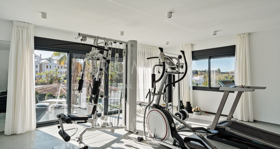 Окруженная субтропической зеленью и роскошной недвижимостью Нуэва Андалусии, резиденция площадью 475 м² была недавно реформирована с использованием высококачественных материалов и расположена на одном из лучших и самых больших (1.923 м²!) участков в районе Лос Наранхос, обеспечивая изобилие пространства и эксклюзивность. При входе в дом вы попадаете в гостиную, выходящую на одну из террас, слева от нее – современная кухня с обеденной зоной открытого плана. Эта зона также ведет на крытую террасу с зоной барбекю, где вы сможете отдохнуть и насладиться видом на гольф. Сразу за кухней находится прачечная и гараж. Расположенный над гаражом тренажерный зал с большими окнами, пропускающими свет и вентиляцию, позволит вам заняться фитнесом. Рядом с ним находится идеальная спальня с ванной комнатой для персонала. На противоположной стороне виллы, на первом этаже, находятся 3 большие спальни с ванными комнатами, а наверху – сказочная главная спальня с гардеробной, ванной комнатой и потрясающим видом на поле для гольфа. К главной спальне примыкает кабинет/офис и дополнительная небольшая комната для хранения.