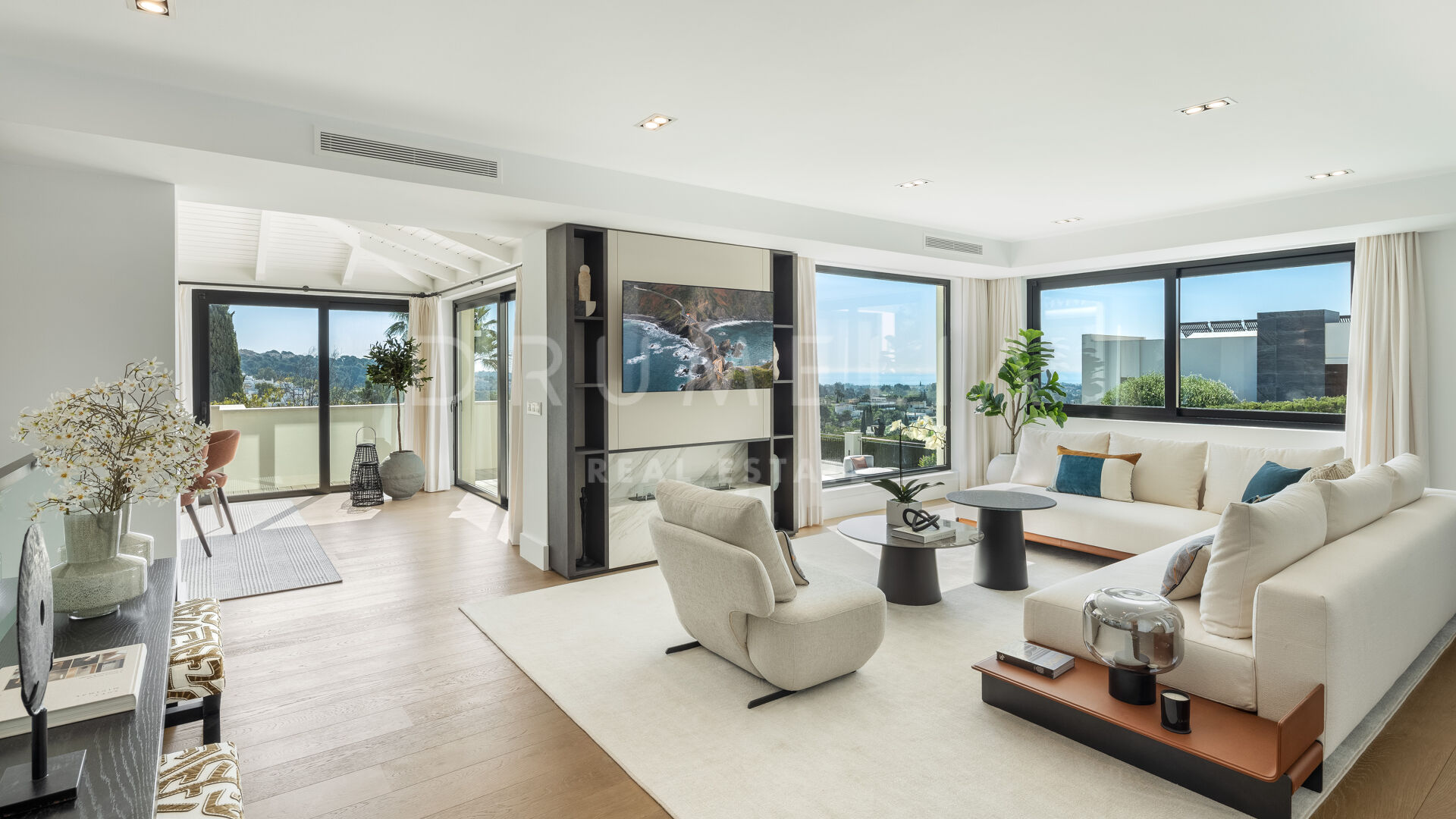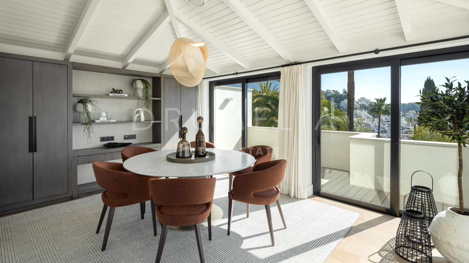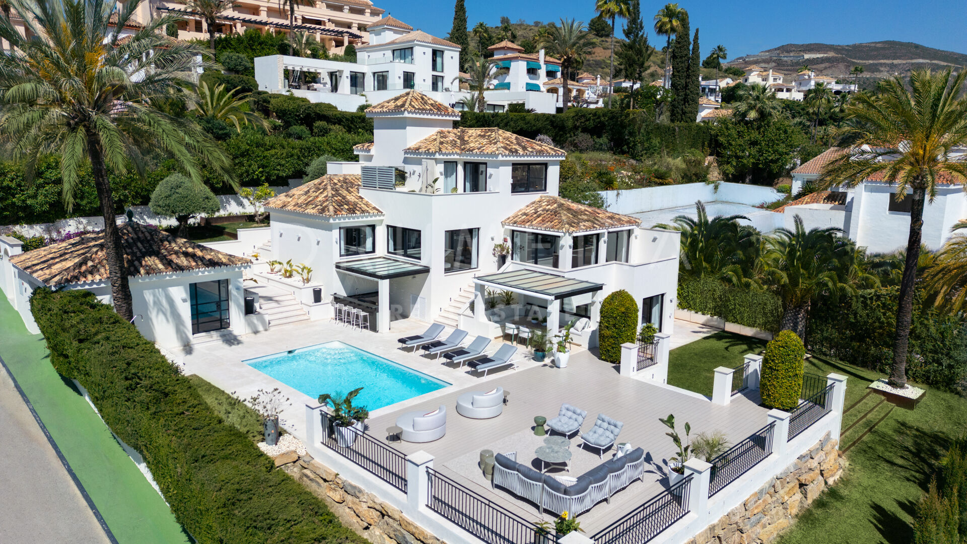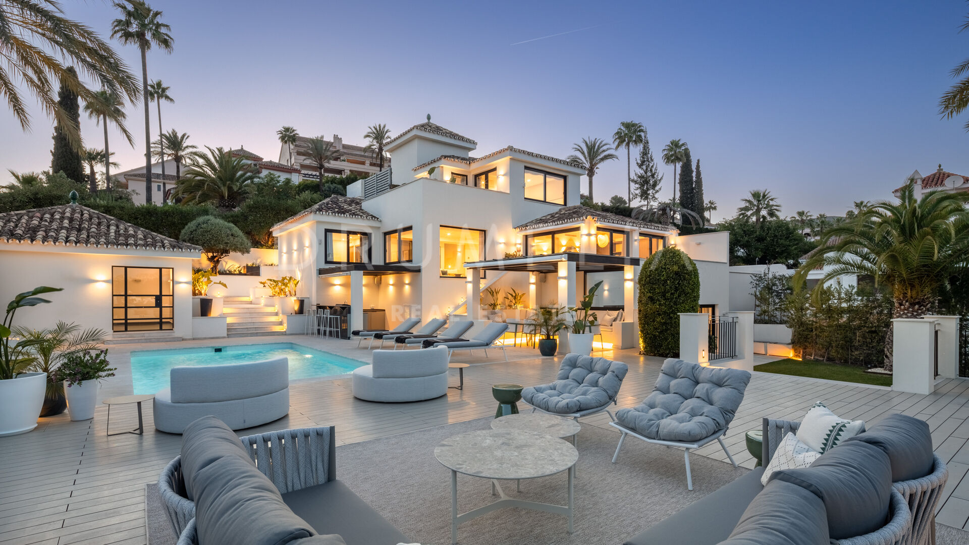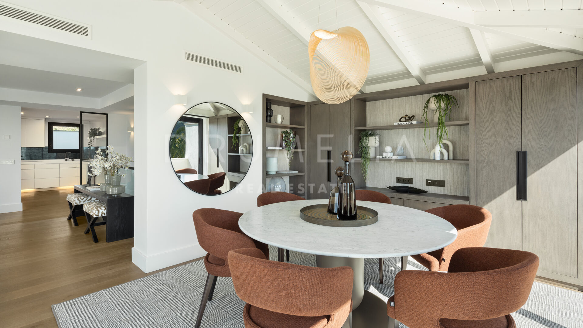 Зайдя внутрь, вы попадете в элегантный рай, где каждый уголок украшен невероятной мебелью и светильниками, разработанными известной фирмой La Albaida, занимающейся дизайном интерьеров. Плавные переходы между гостиной и столовой подчеркнуты широкими окнами, из которых открываются прямые виды и выход на террасы. Современная кухня, оборудованная по последнему слову техники, сочетает в себе функциональность и эстетическую привлекательность, предоставляя достаточно места для хранения и прилавков для дополнительного удобства.