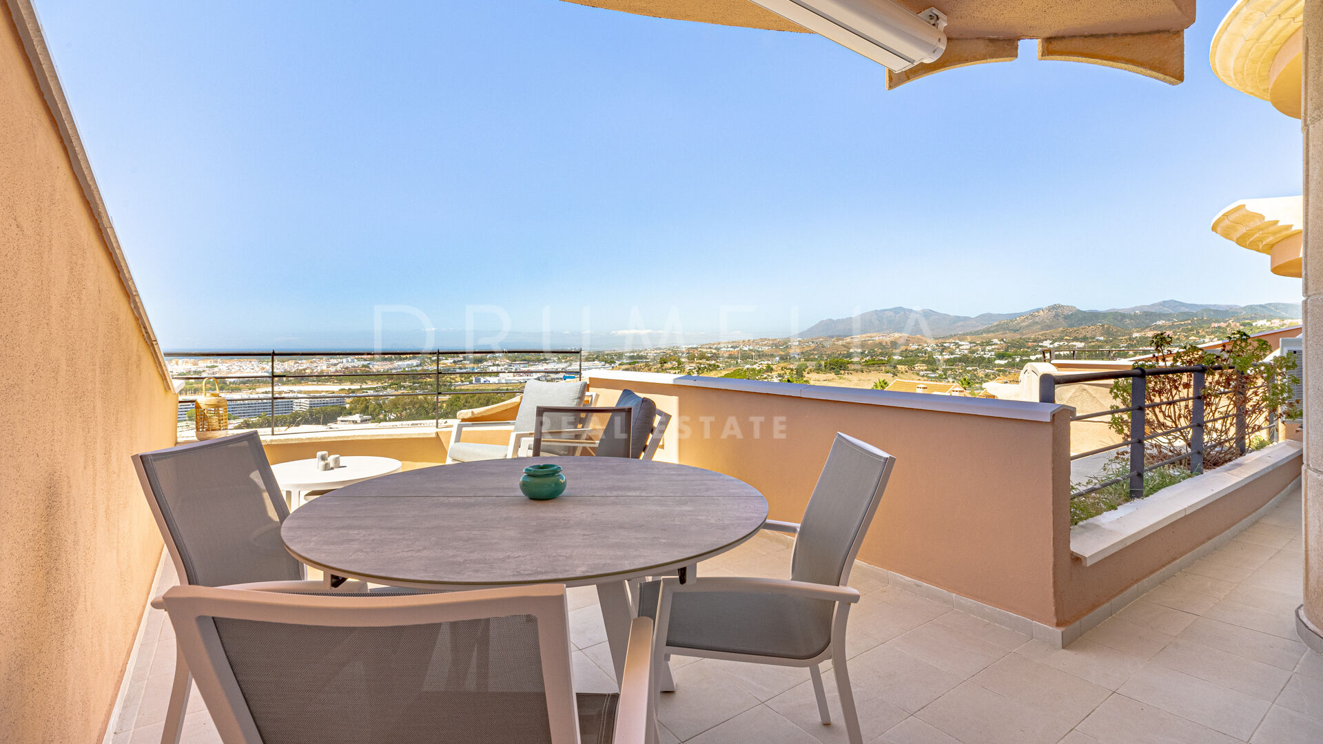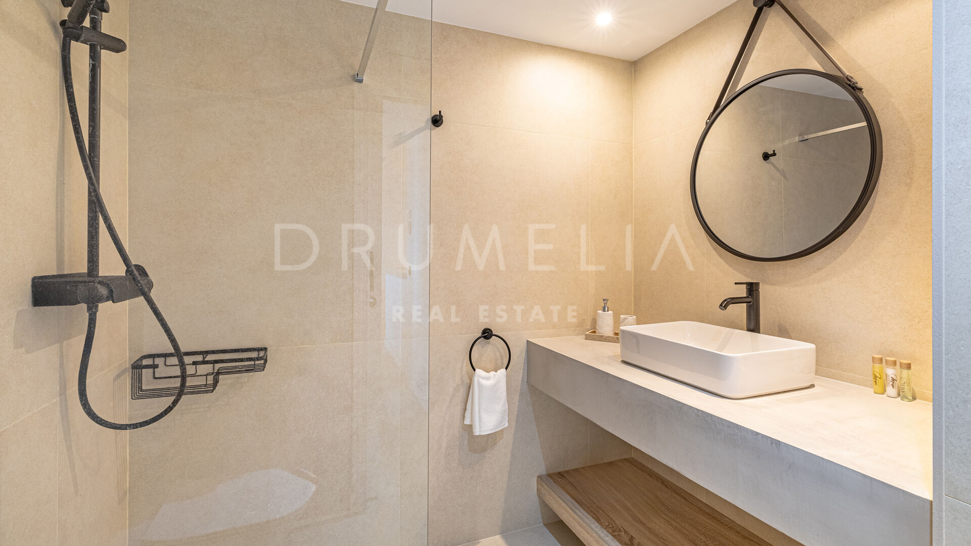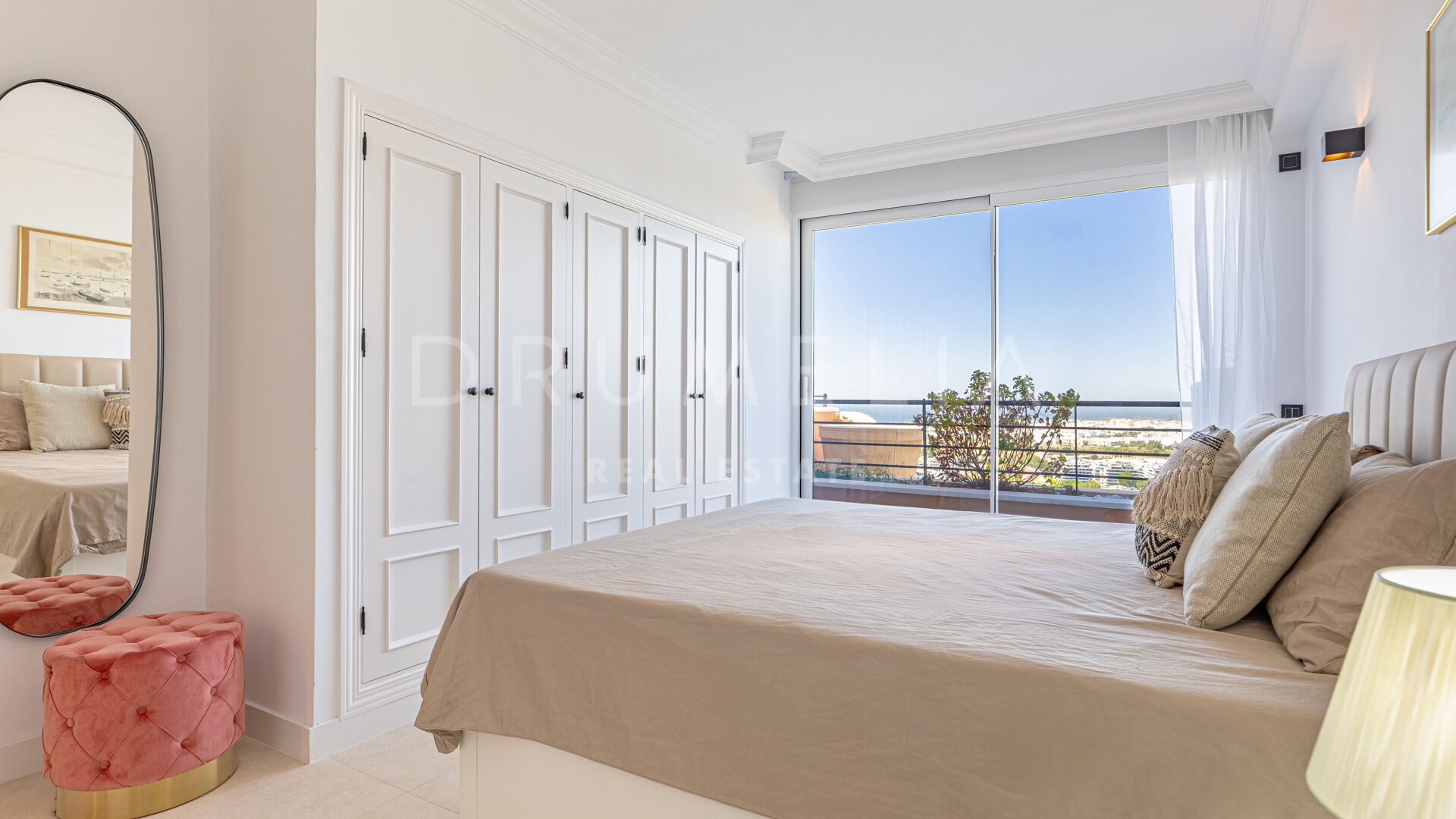 Двухкомнатные апартаменты в Magna Marbella, элитном закрытом жилом комплексе в Новой Андалусии с юго-западной ориентацией и панорамными видами на Средиземное море, Гибралтар и северное побережье Африки. Комплекс расположен всего в нескольких минутах езды от Пуэрто-Бануса, примерно в 10 минутах от центра Марбельи, а до аэропорта Малаги можно добраться примерно за 40 минут по трассе AP-7.