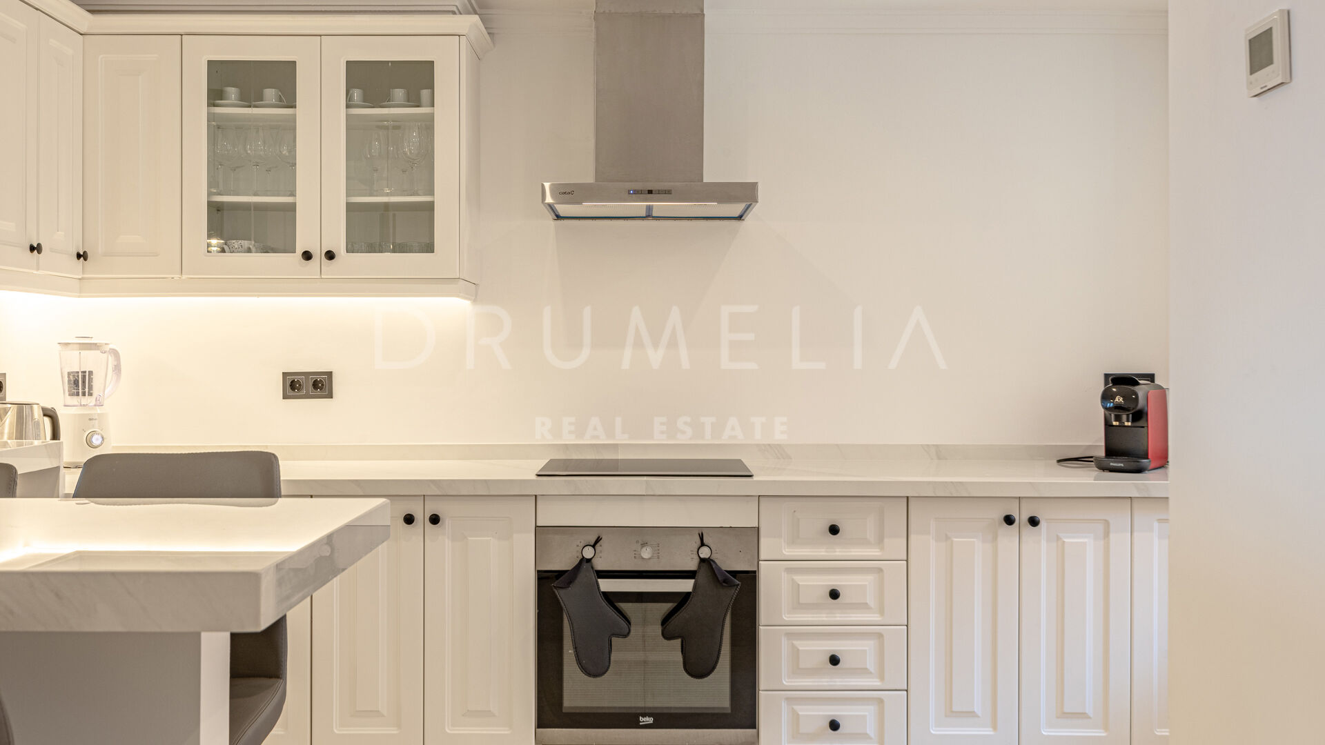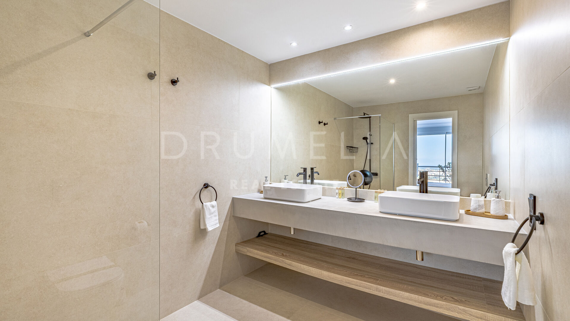 Гостиная и столовая светлые и просторные, с прямым выходом на частную террасу, откуда открываются великолепные виды на море и горы благодаря юго-западной ориентации. Кухня полностью оборудована и интегрирована в основное жилое пространство. Главная спальня располагает отдельной ванной комнатой; вторая спальня обслуживается отдельной ванной, выполненной в том же высоком стандарте. В стоимость включены два кладовых помещения и два парковочных места.