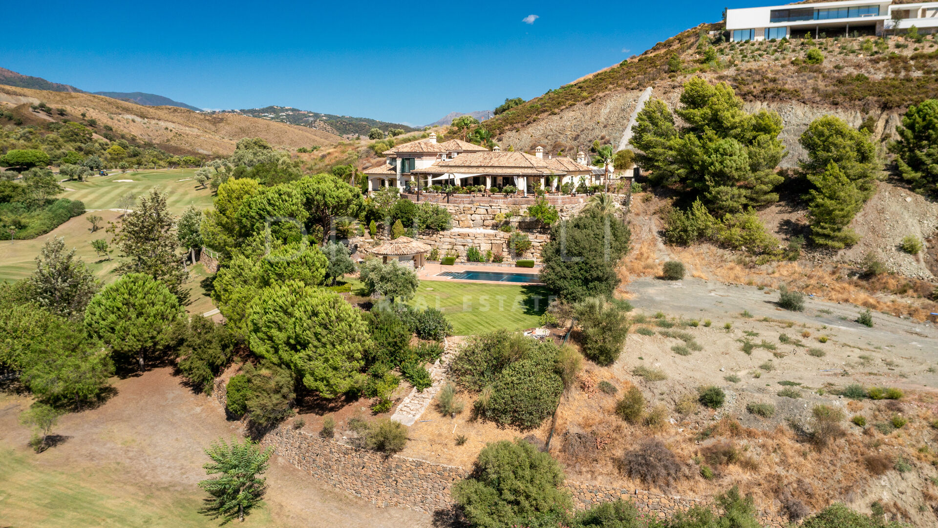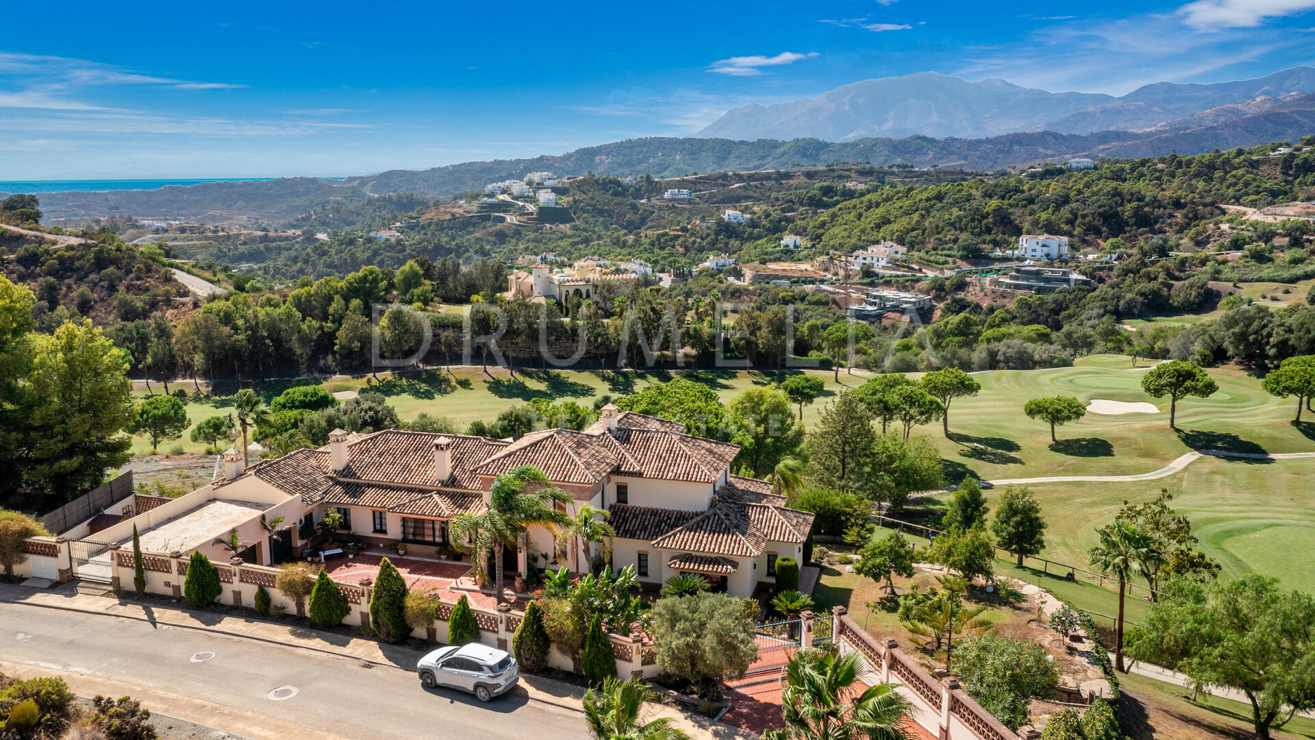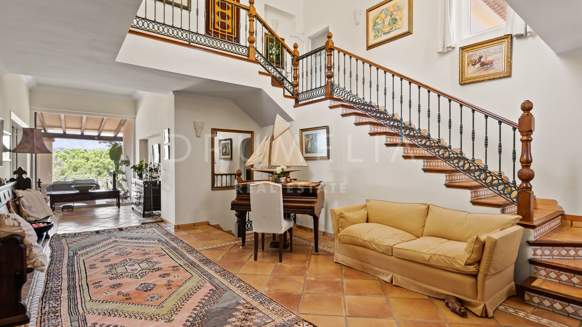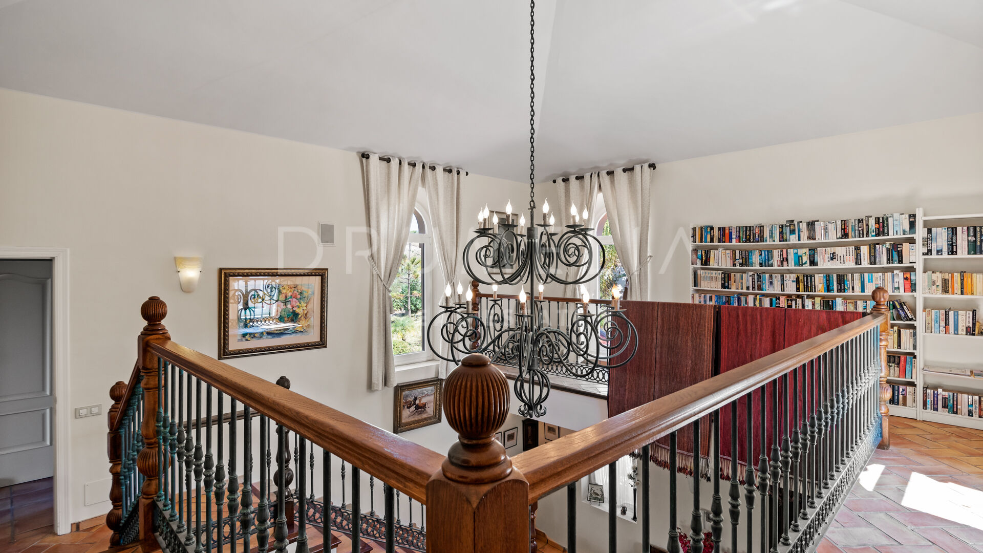 Подъездная дорога ведет к эффектному дому площадью 658 м², который расположен на большом участке размером 4.146 м². Благодаря ориентации юг-запад отсюда открывается прекрасный вид на море, горы и поле для игры в гольф. Великолепная недвижимость предлагает: прихожую с лестницей и полами в классическом средиземноморском стиле, просторную гостиную с высокими потолками и камином, обеденный зал с камином, полностью оборудованную кухню с уголком для завтрака, подсобное помещение, кладовую и прачечную. Этот этаж завершают 3 большие гостевые спальни и отдельный гостевой туалет.
