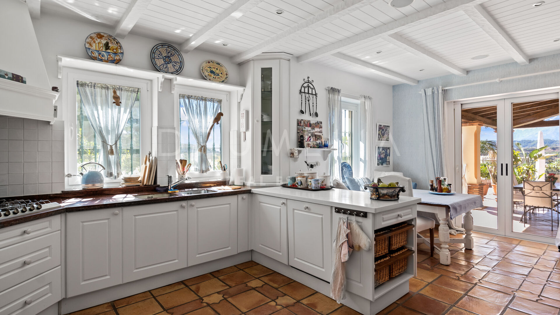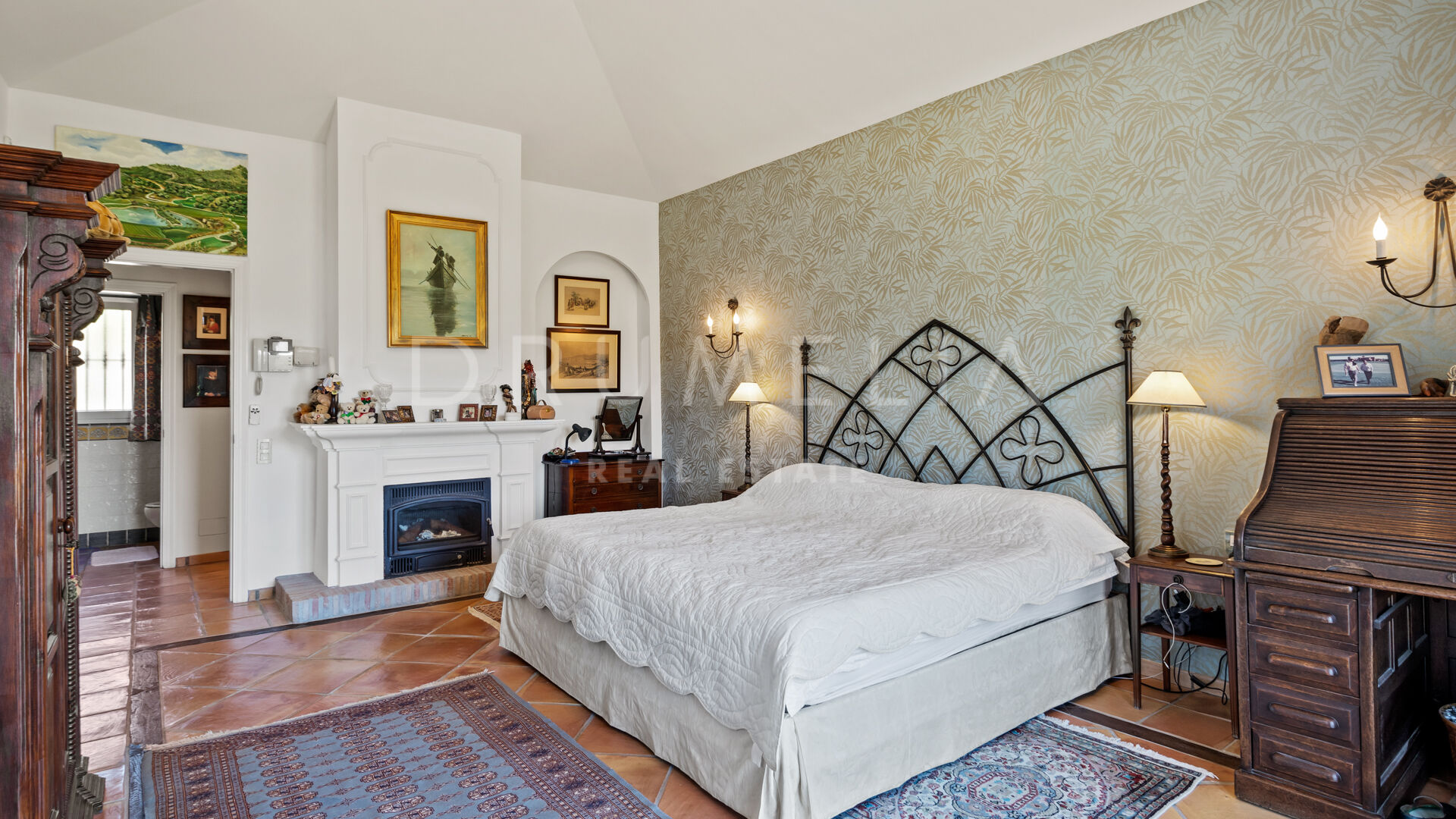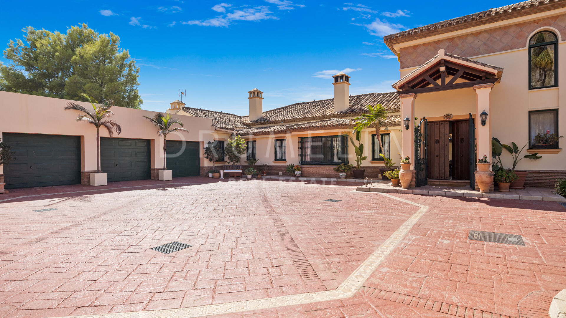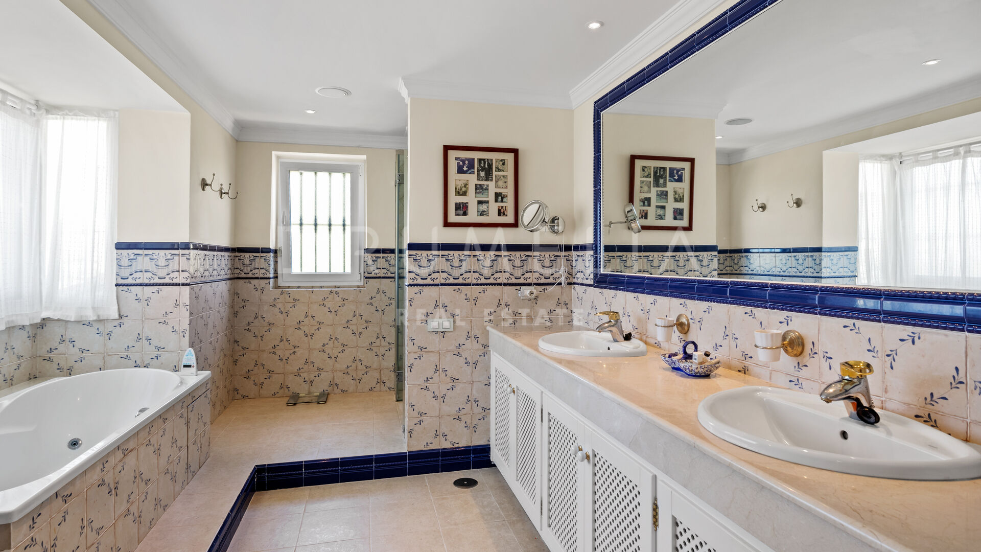 Подъездная дорога ведет к эффектному дому площадью 658 м², который расположен на большом участке размером 4.146 м². Благодаря ориентации юг-запад отсюда открывается прекрасный вид на море, горы и поле для игры в гольф. Великолепная недвижимость предлагает: прихожую с лестницей и полами в классическом средиземноморском стиле, просторную гостиную с высокими потолками и камином, обеденный зал с камином, полностью оборудованную кухню с уголком для завтрака, подсобное помещение, кладовую и прачечную. Этот этаж завершают 3 большие гостевые спальни и отдельный гостевой туалет.