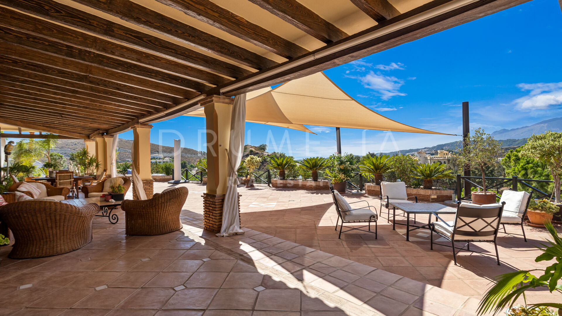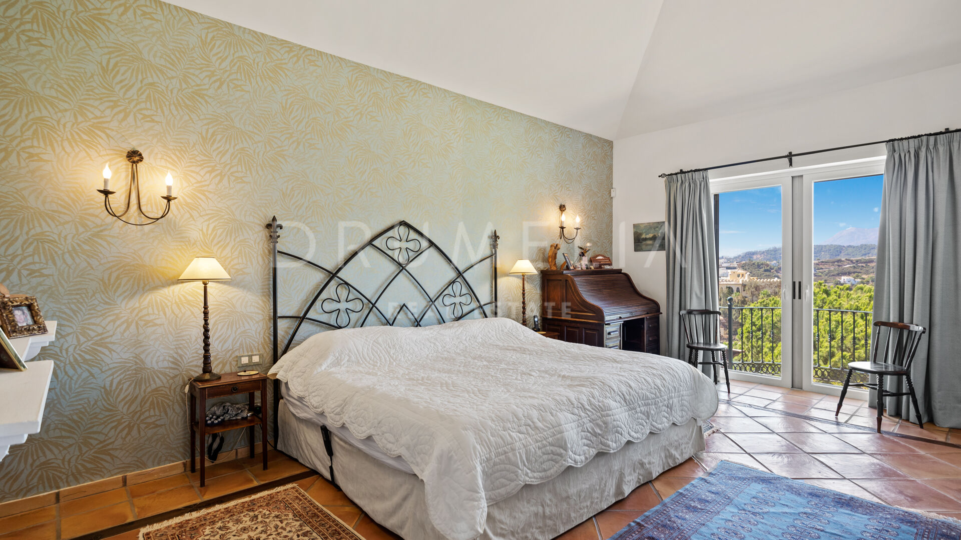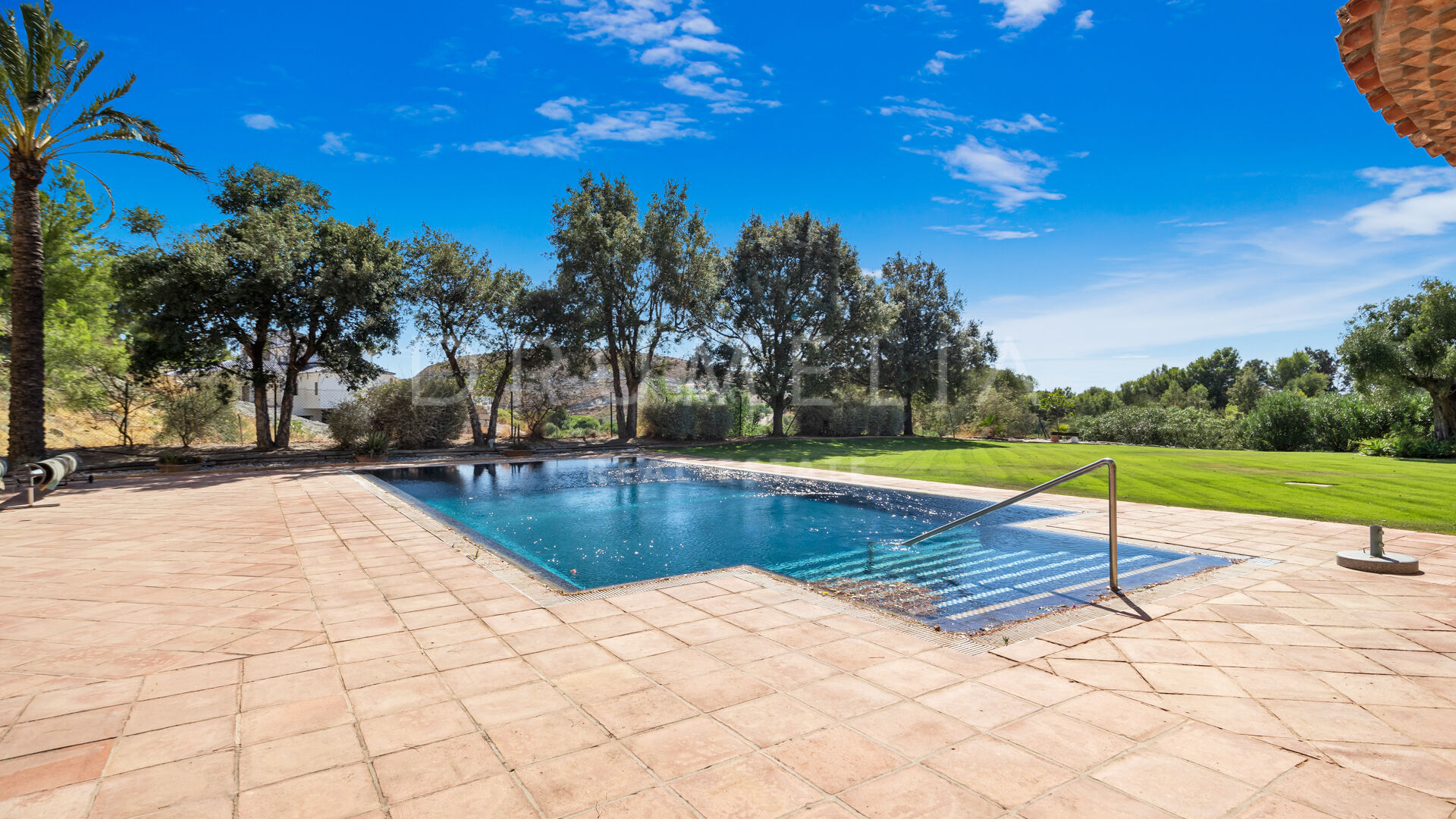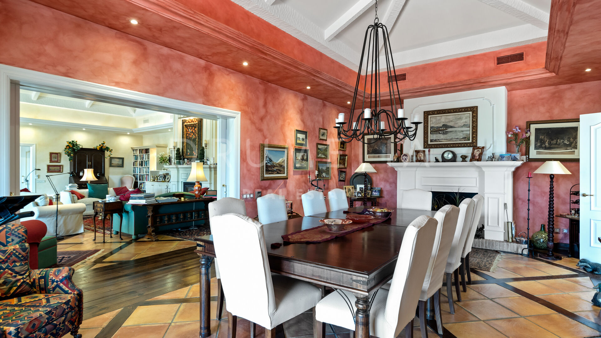 Подъездная дорога ведет к эффектному дому площадью 658 м², который расположен на большом участке размером 4.146 м². Благодаря ориентации юг-запад отсюда открывается прекрасный вид на море, горы и поле для игры в гольф. Великолепная недвижимость предлагает: прихожую с лестницей и полами в классическом средиземноморском стиле, просторную гостиную с высокими потолками и камином, обеденный зал с камином, полностью оборудованную кухню с уголком для завтрака, подсобное помещение, кладовую и прачечную. Этот этаж завершают 3 большие гостевые спальни и отдельный гостевой туалет.