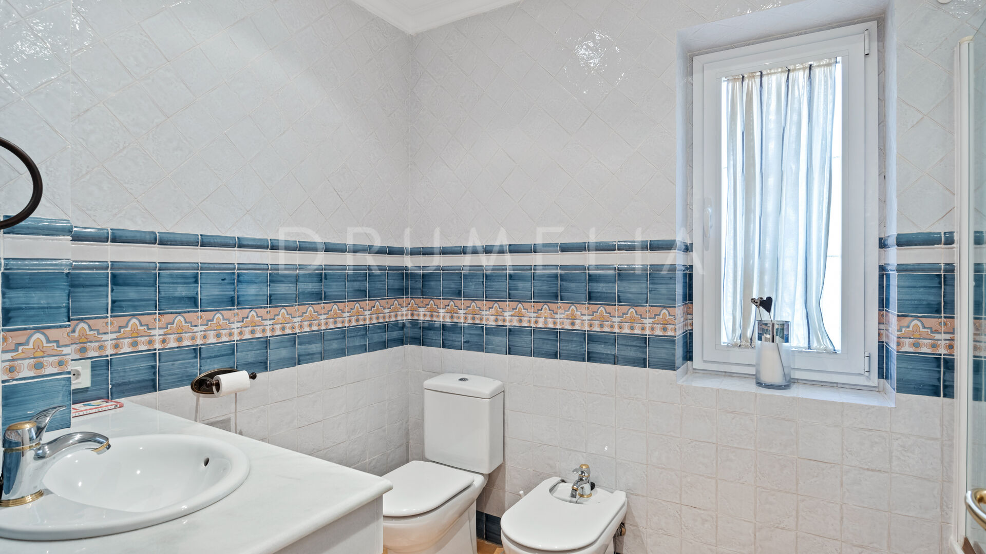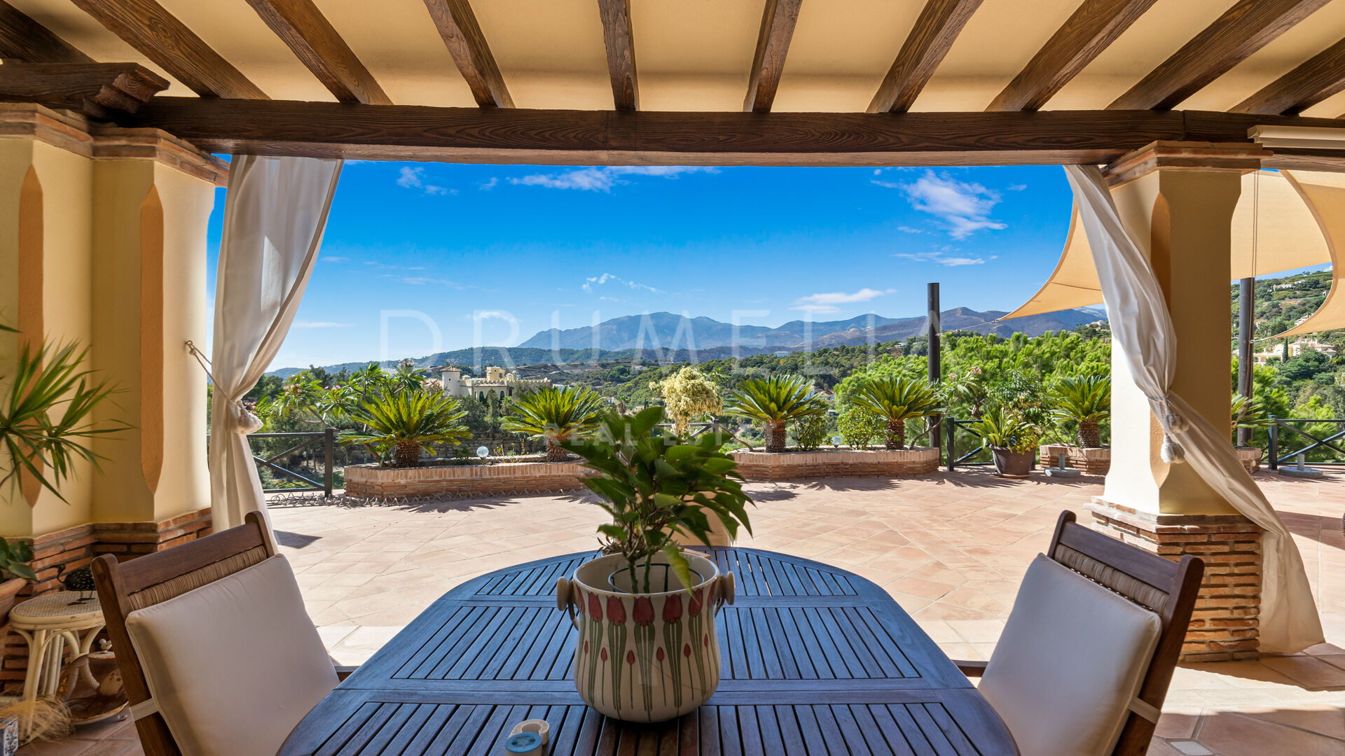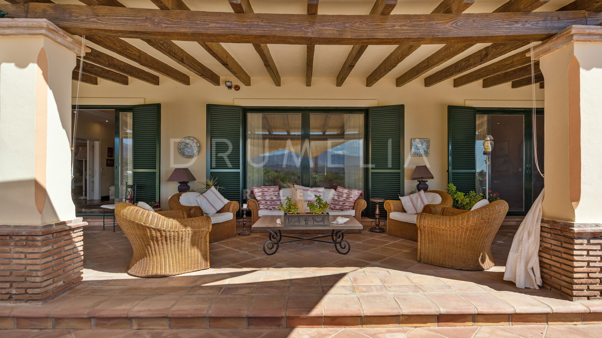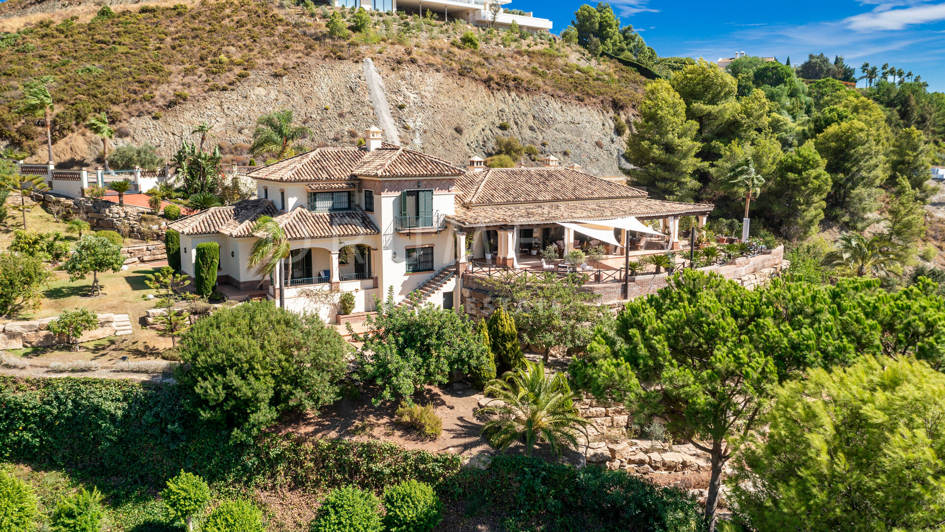 Подъездная дорога ведет к эффектному дому площадью 658 м², который расположен на большом участке размером 4.146 м². Благодаря ориентации юг-запад отсюда открывается прекрасный вид на море, горы и поле для игры в гольф. Великолепная недвижимость предлагает: прихожую с лестницей и полами в классическом средиземноморском стиле, просторную гостиную с высокими потолками и камином, обеденный зал с камином, полностью оборудованную кухню с уголком для завтрака, подсобное помещение, кладовую и прачечную. Этот этаж завершают 3 большие гостевые спальни и отдельный гостевой туалет.