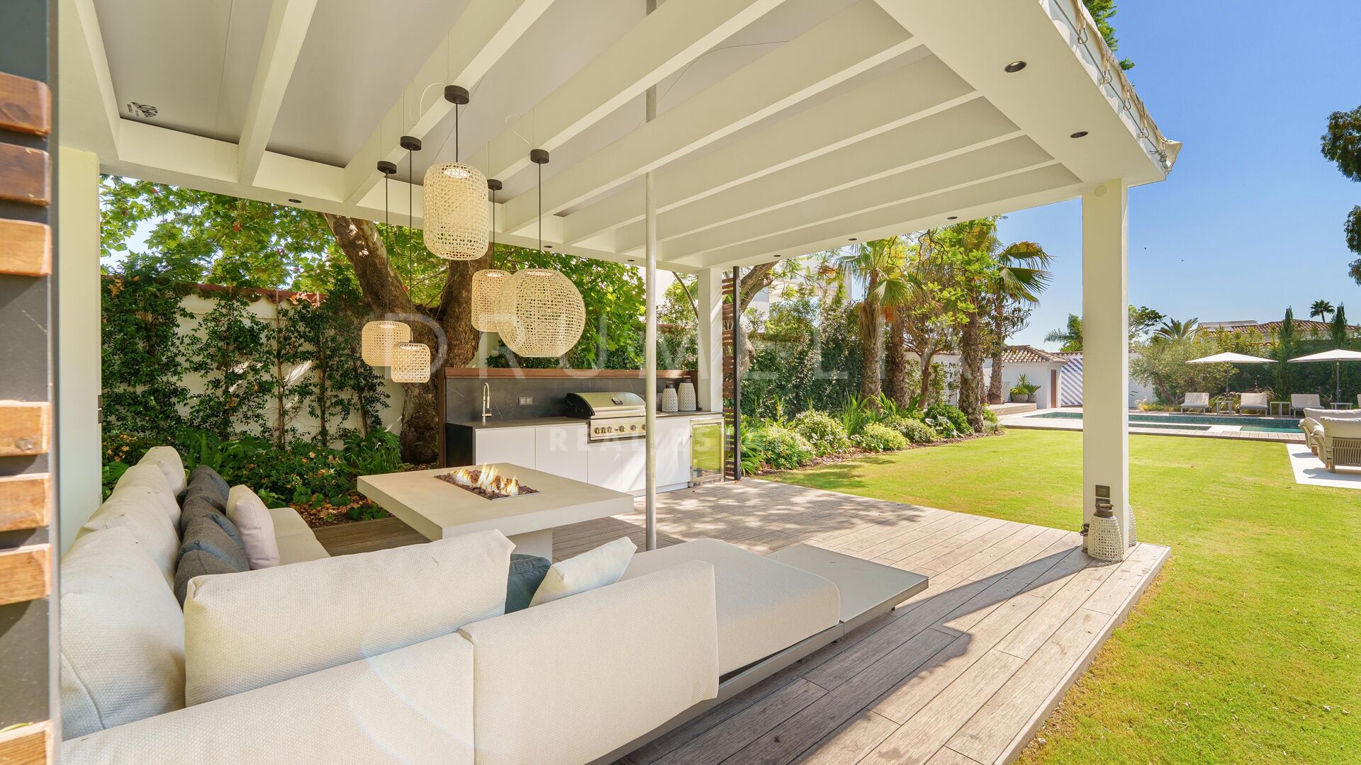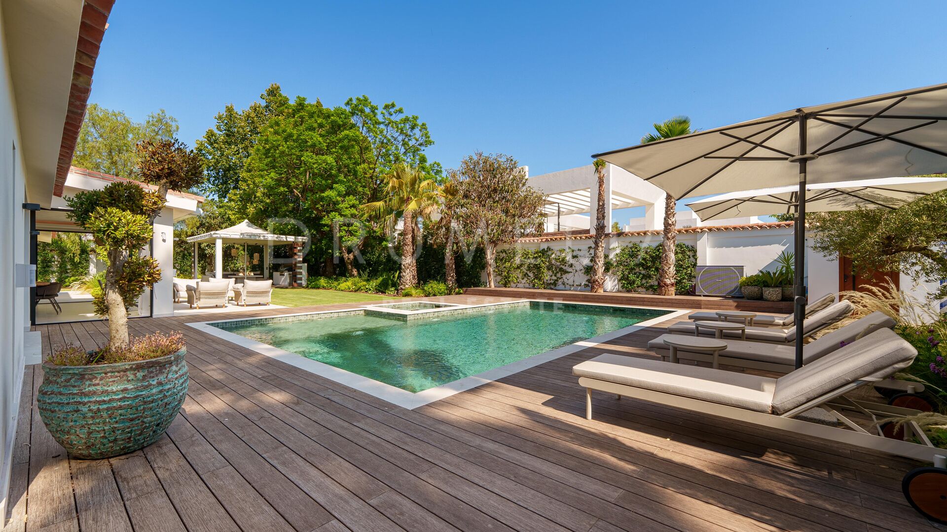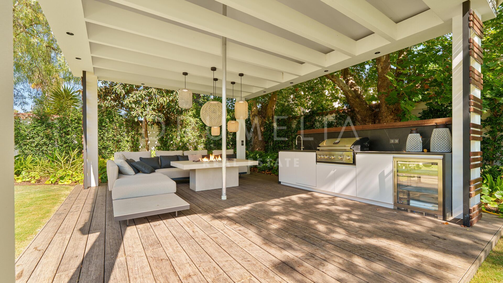 Благоустроенный сад идеально подходит как для отдыха, так и для приёма гостей. В центре — большой частный бассейн, окружённый элегантной деревянной террасой, шезлонгами и зонтами. Несколько лаунж-зон, стильная пергола и крытая летняя кухня с встроенным барбекю обеспечивают полноценный отдых на свежем воздухе круглый год.