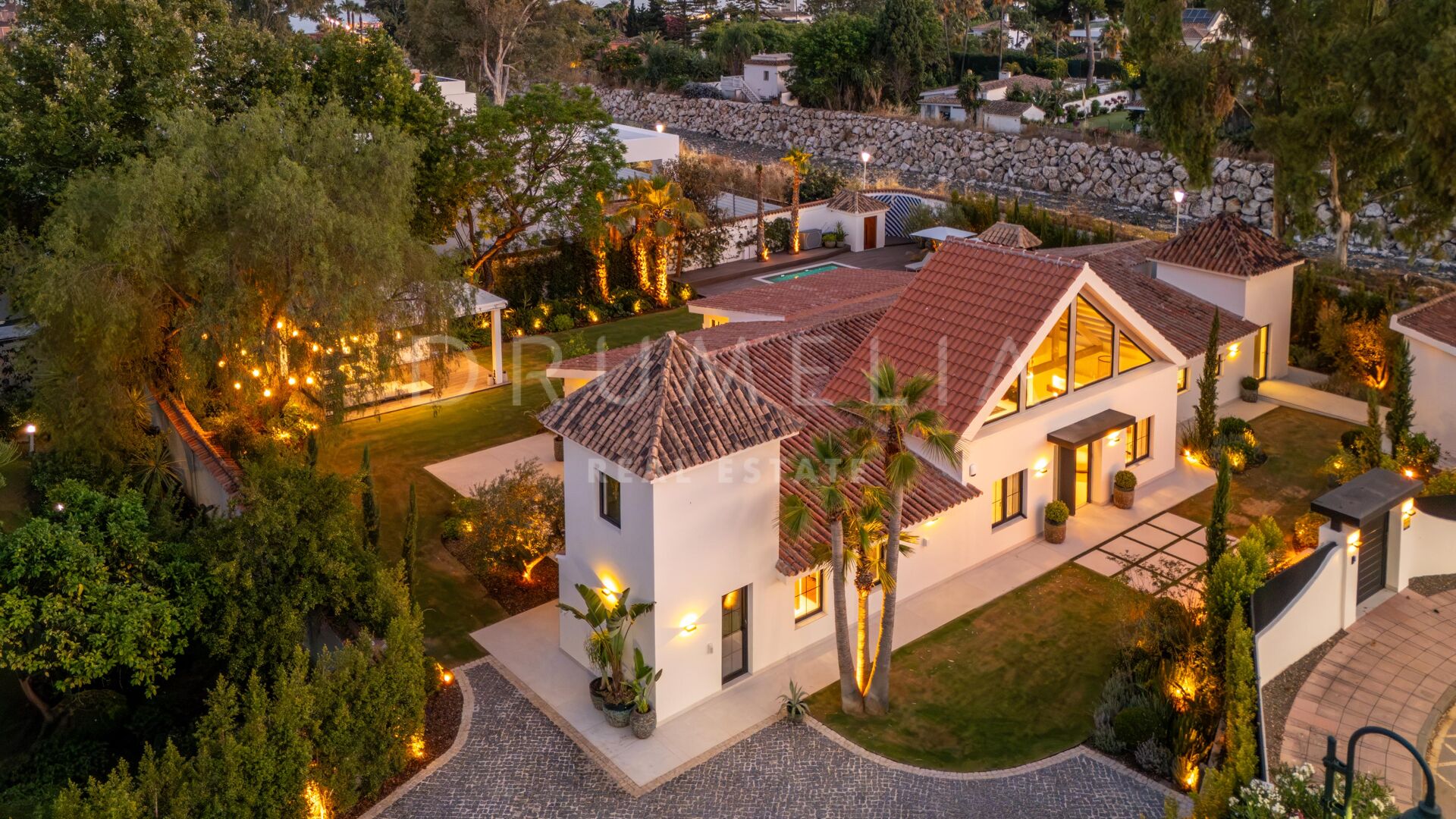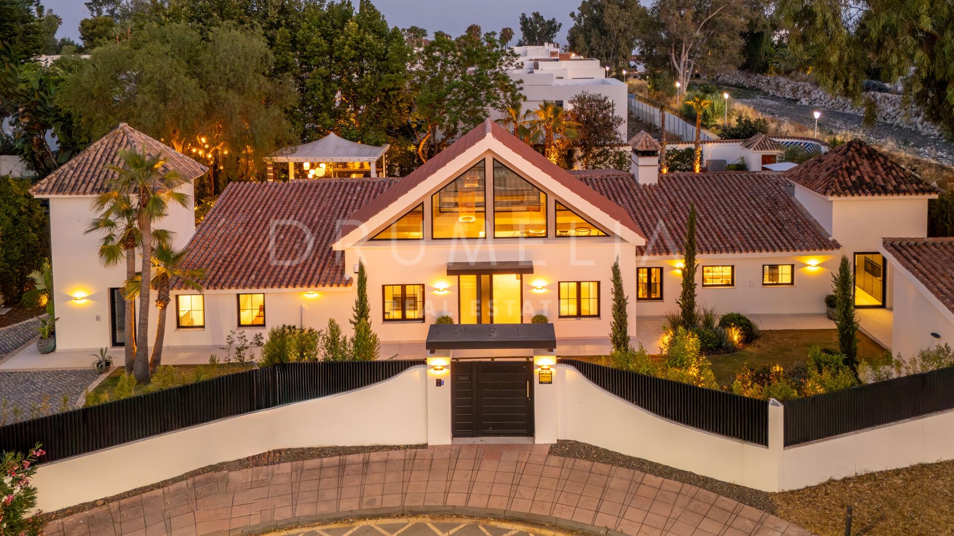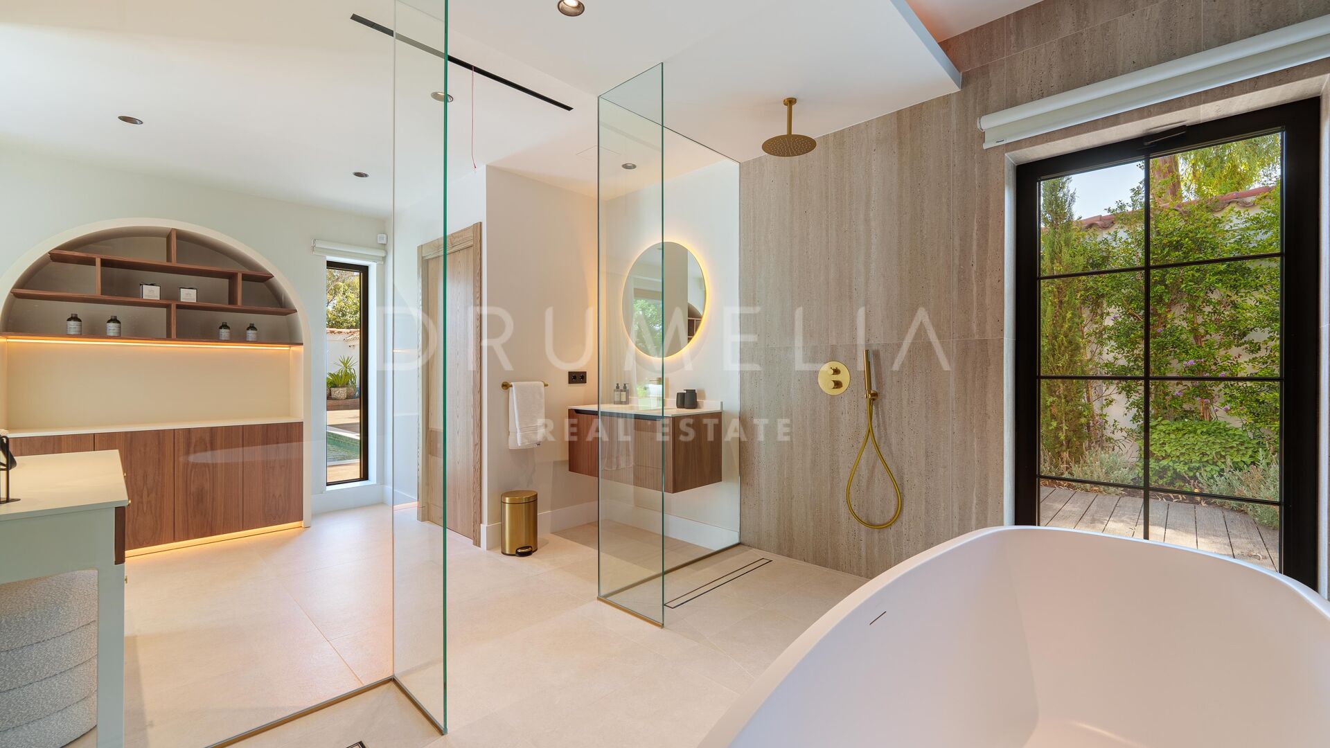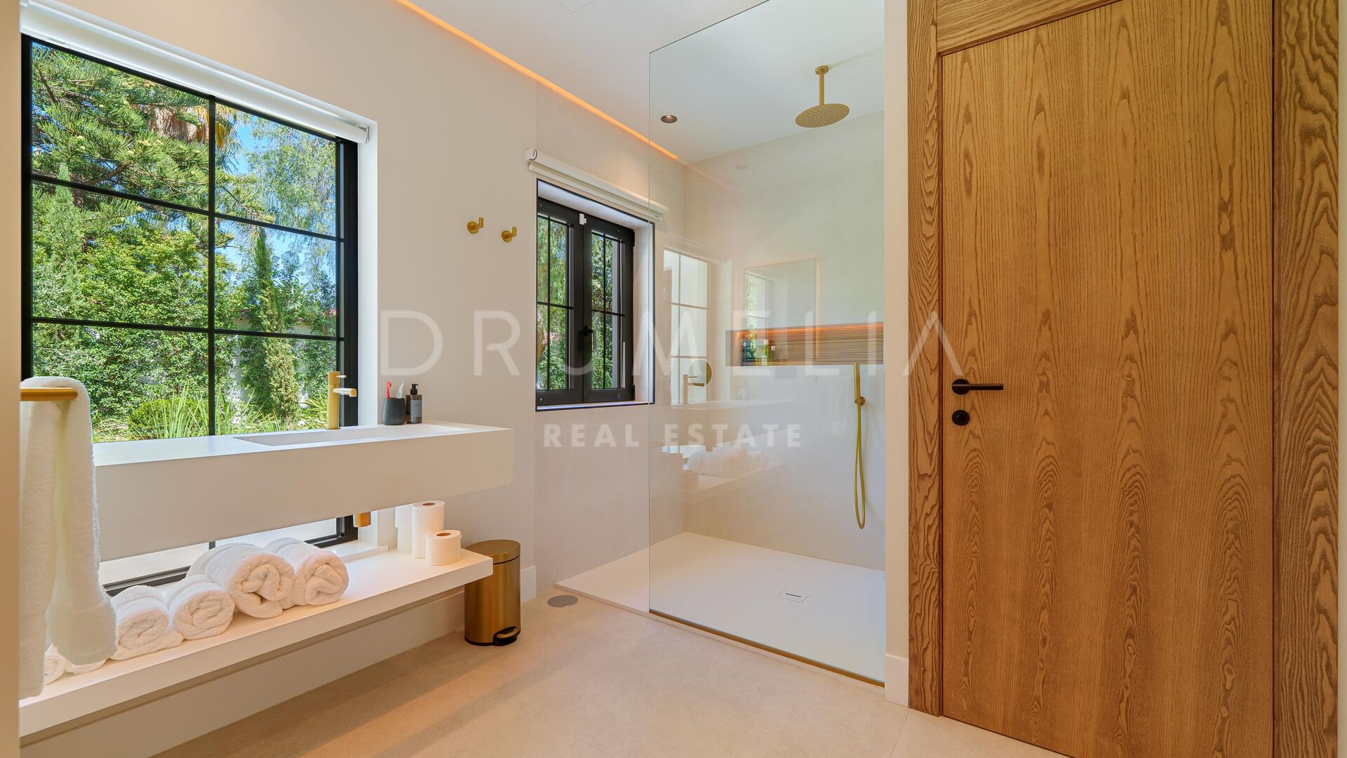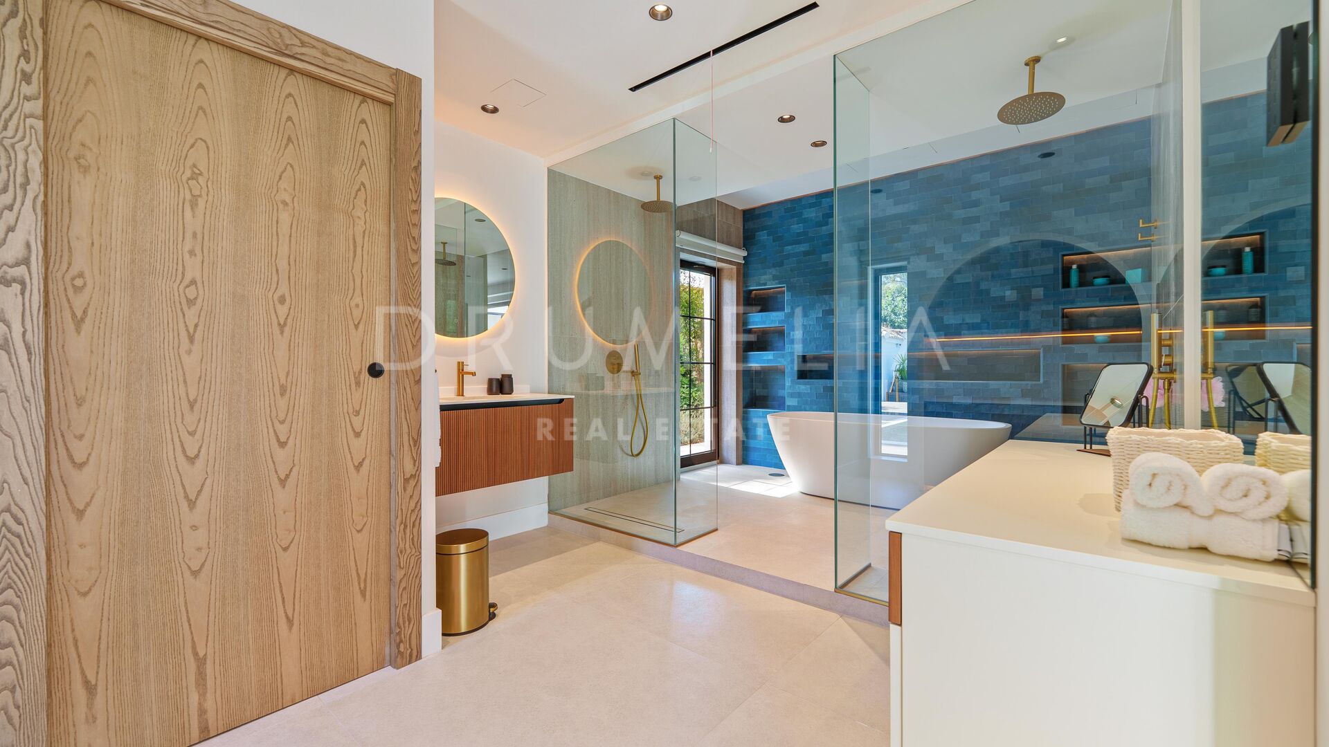 Откройте для себя утончённую современную жизнь в этой исключительной вилле в один уровень, идеально расположенной всего в нескольких минутах от оживлённого Пуэрто-Бануса. Вилла находится на просторном участке с полной приватностью и предлагает пять просторных спален, открытые светлые интерьеры и впечатляющий вестибюль с двойной высотой потолка и геометрической крышей, придающей архитектурную изюминку.