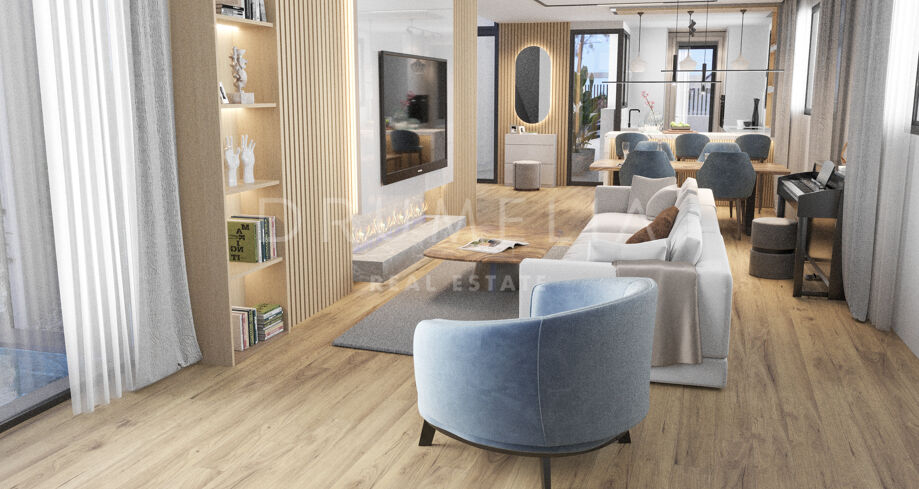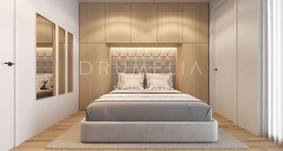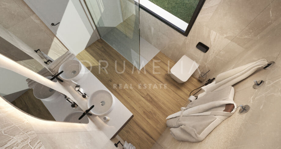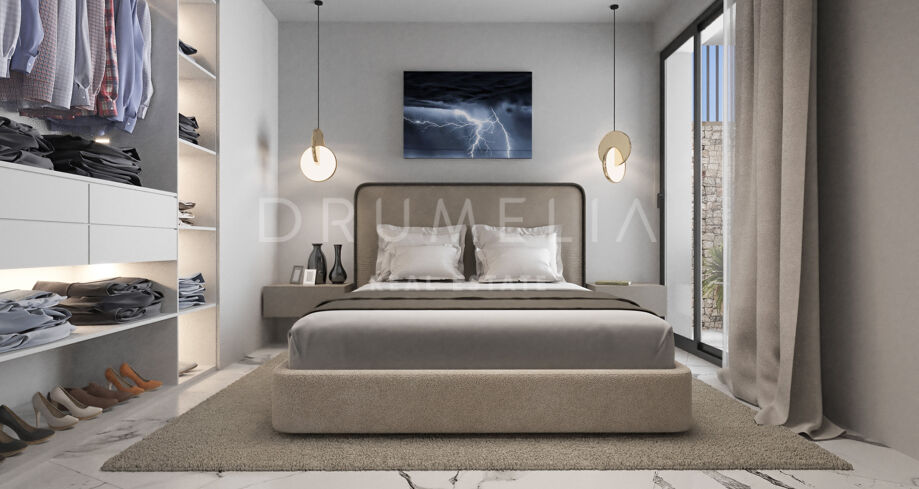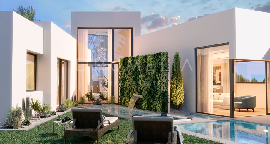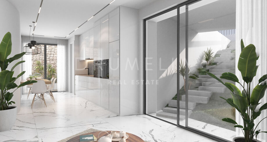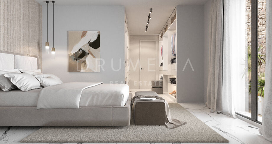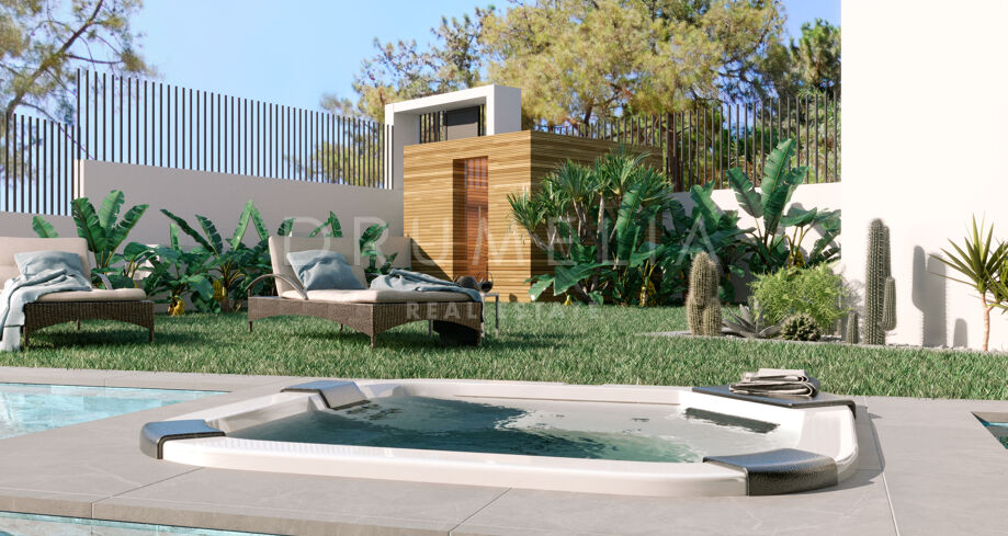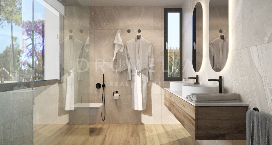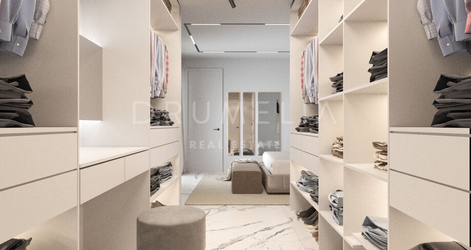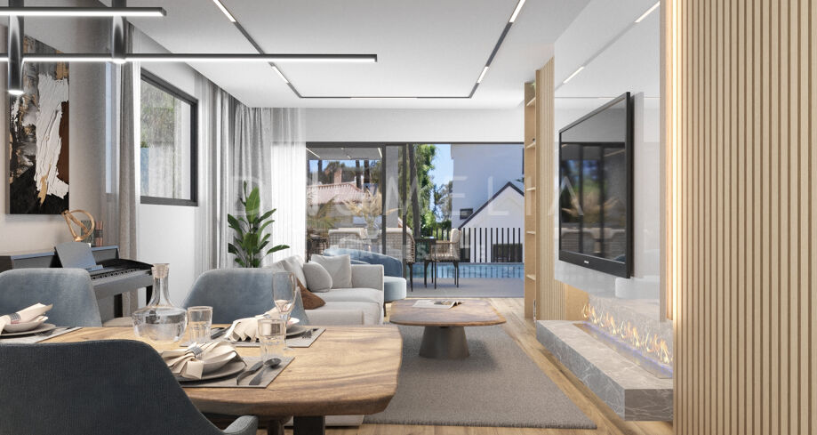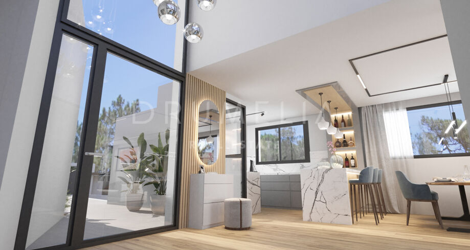 Внутреннее пространство включает открытую гостиную, соединённую с кухней и столовой, с камином и большими раздвижными стеклянными дверями, ведущими на террасу. Главная спальня оснащена гардеробной. Также имеется отдельный гостевой апартамент с собственной кухней и навес для автомобилей, рассчитанный на размещение до четырёх машин. Расположение рядом с пляжем и вблизи магазинов, ресторанов и инфраструктуры делает эту виллу практичным вариантом для жизни у моря в Восточной Марбелье.