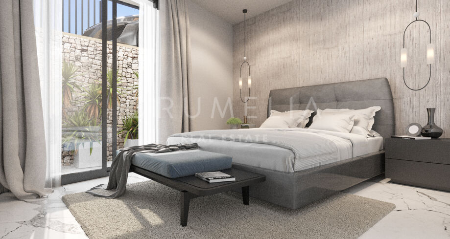 Внешние зоны включают крытые и открытые террасы, ландшафтный сад и несколько пространств для отдыха и приёма пищи на свежем воздухе. В саду предусмотрены обеденная зона, лаунж-пространство, зона барбекю с летней кухней, зоны для загара, бассейн с отделкой из индонезийского камня, а также джакузи и сауна.